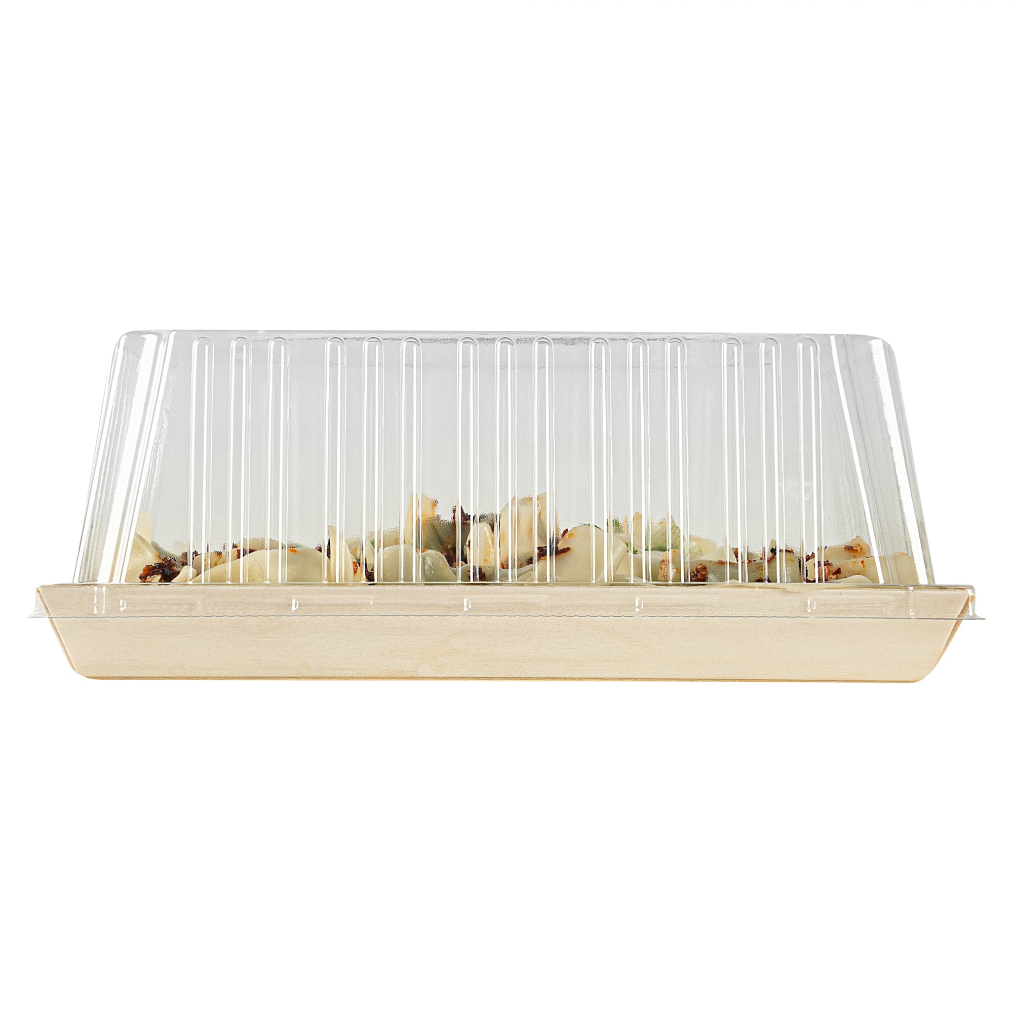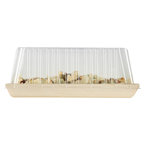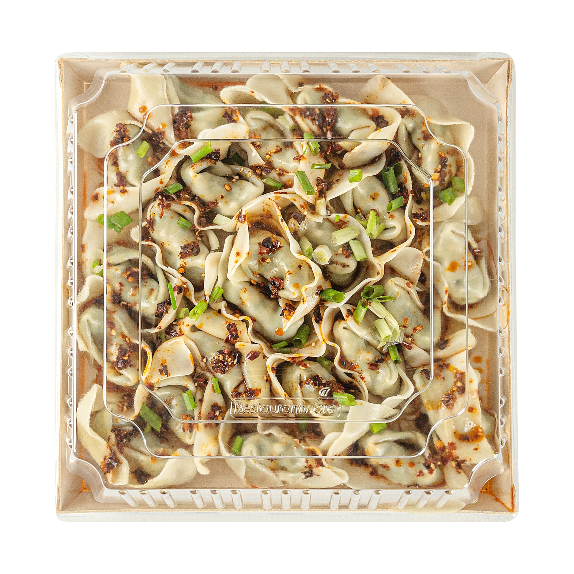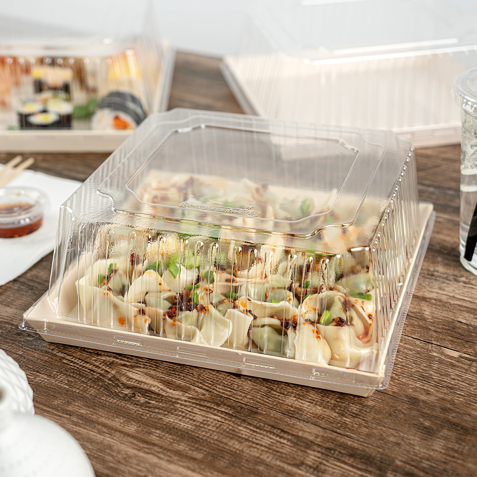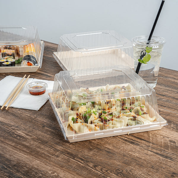 Seal the freshness of your meal with our Taipei Square Clear Plastic Lids. These clear lids are made from PET plastic for premium durability. Pair these plastic lids with its compatible poplar plates (SKU: RWB0596K-25) for a convenient take out solution. The crystal-clear finish of these square lids offers a glimpse of the delectable contents and adds a touch of elegance to your culinary masterpieces. These plate lids have an elevated roof to provide ample space for toppings or servings to your gourmet creations. Disposable, these clear plastic lids simplify your post-meal cleanup. These square plastic lids measure 9.5 inches long by 9.5 inches wide by 2.75 inches tall. Sold in a 25 count box. Plates are available and sold separately.