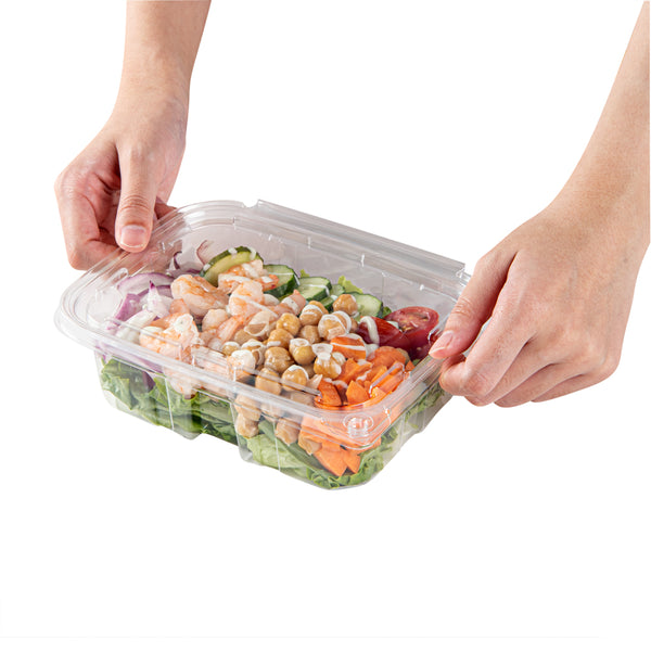 These disposable hinged food containers come in round, rectangle, and square shapes with 12, 20, 24, and 48-ounce capacities. A size for every need!