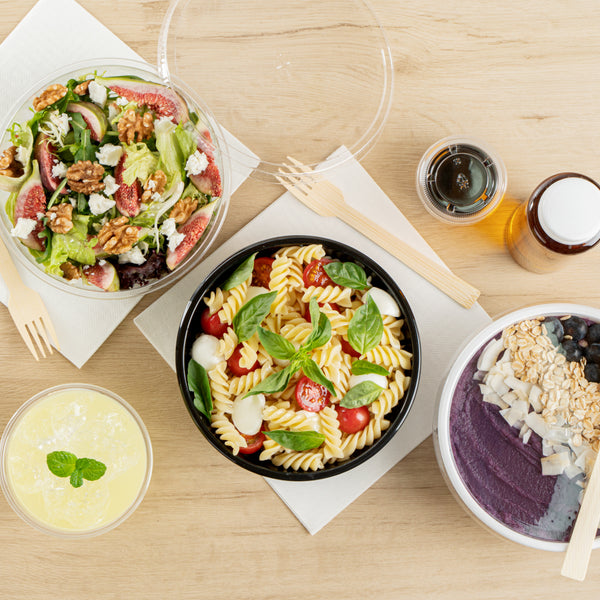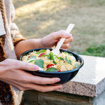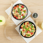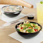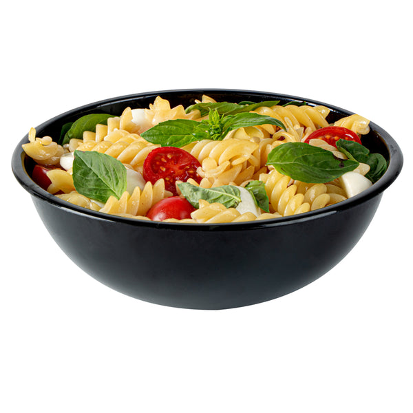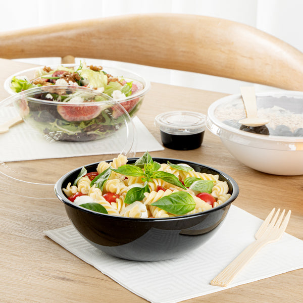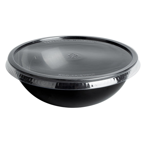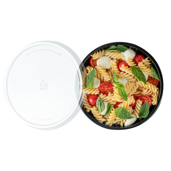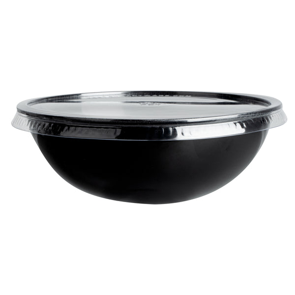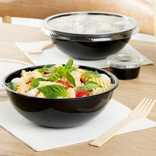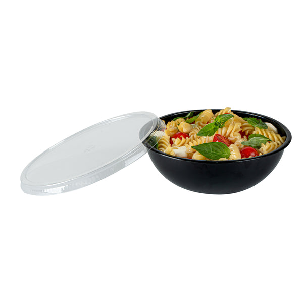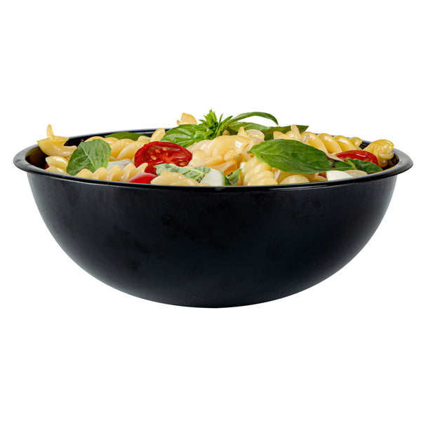 Add a charming touch to salads served at your establishment using our Tamper Tek 21-ounce Round Black Plastic Salad Bowls. These round serving bowls feature a sleek black finish that effortlessly complements the decor at your salad shop, restaurant, or buffet. Constructed from durable plastic, these large salad bowls are conveniently recyclable to provide you with a quick and easy way to clean up after service hours. These durable salad bowls have superior strength and are designed to stand up to hefty portions of salads or pasta. Prevent take out orders from falling out during transport by pairing these black serving bowls with our Tamper Tek coordinating clear lids (SKU: RWP0208C). Containing up to 21 ounces, these salad serving bowls measure 6.75 inches in diameter by 2.5 inches in height. Sold in a 200 count box. Clear lids are available and sold separately.