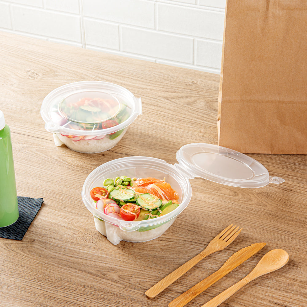 The tamper-evident design of these clear bowls with lids protects the food inside from getting tampered with. The hinge breaks off once opened to alert you of possible tampering.