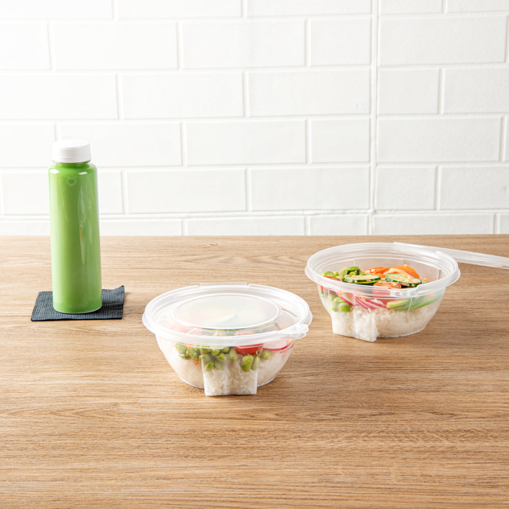 These round bowls with lids made of PP plastic are durable and sturdy not to crumble or break during take outs. Strong build!