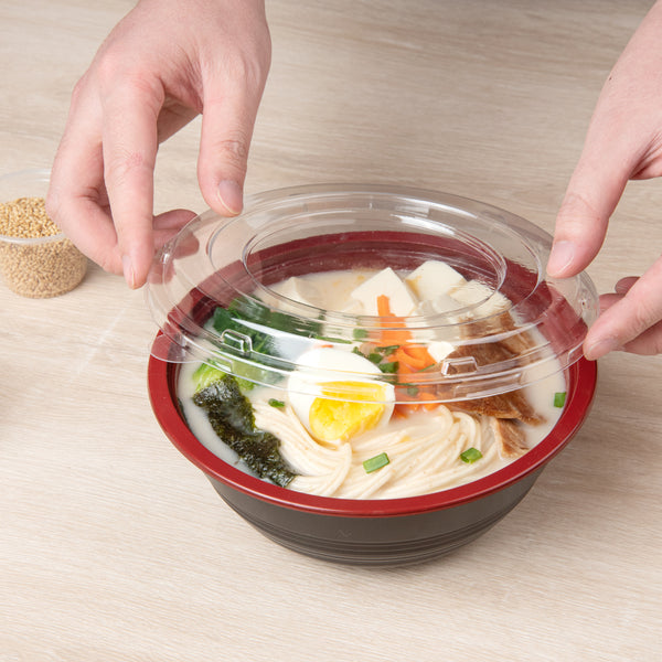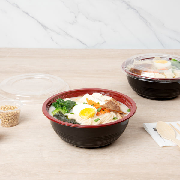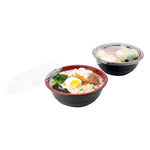 Present your delicious fares with elegance using our Tamper Tek 34-ounce Round Black and Red Plastic Large Asian Panda Bowls. Constructed from high-quality plastic for unwavering sturdiness, these to go bowls are suitable for packing a wide range of hot and cold foods. These food containers can hold up to 34 ounces and offer ample space, making them well-suited for larger servings, main courses, or family-sized portions. The contrast between the sleek black exterior and the vivid red interior of these meal prep containers lends a touch of contemporary flair to your table settings. These round bowls come with clear plastic lids that form a snug fit to ensure a leakproof take out experience. For a simple post-meal cleanup, these plastic bowls with lids are disposable. These disposable bowls are microwave-safe and offer the convenience of reheating meals without having to switch containers. Measuring 7.25 inches in diameter by 2.75 inches in height, these large bowls can hold up to 34 ounces. Shipped in a 200 count box. Note: Lids are not for microwave use.