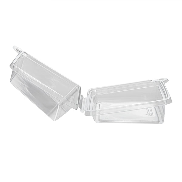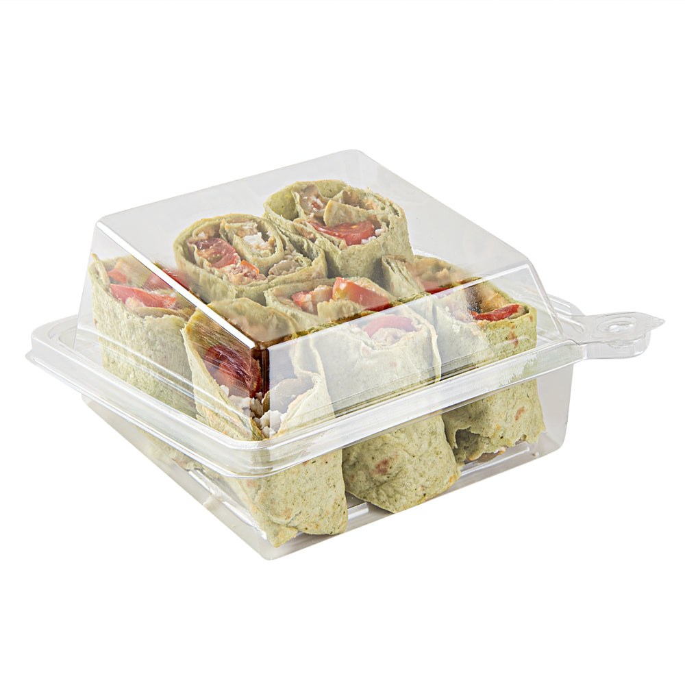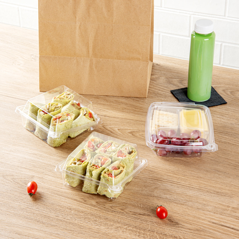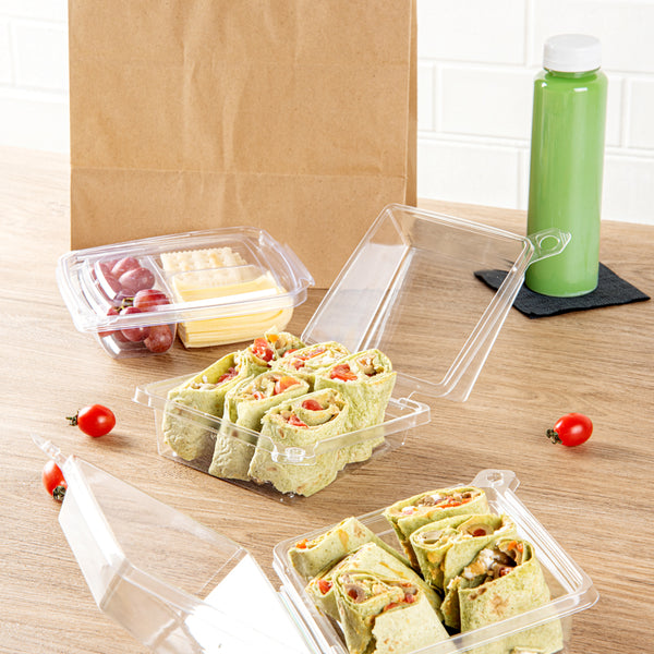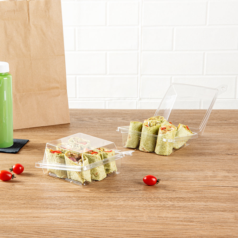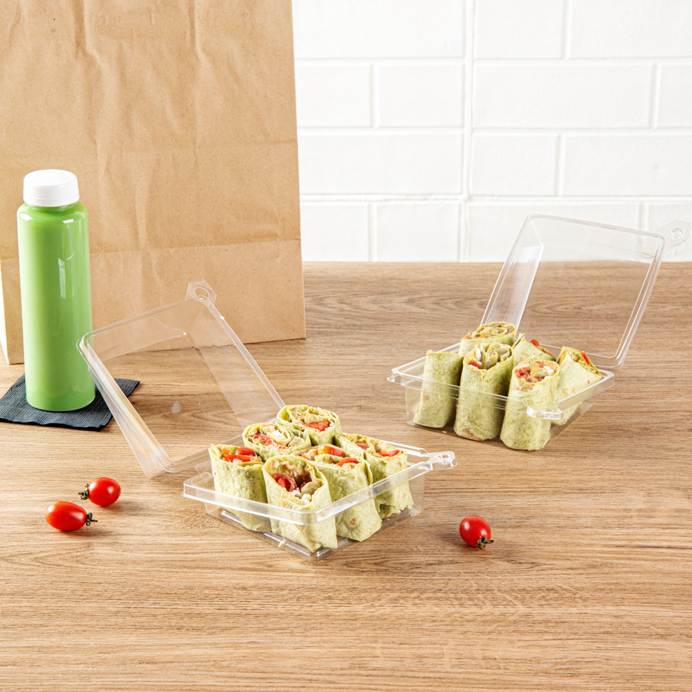 These disposable hinged food containers come in triangle, rectangle, and square shapes to fit all types of sandwiches. A shape for every need!