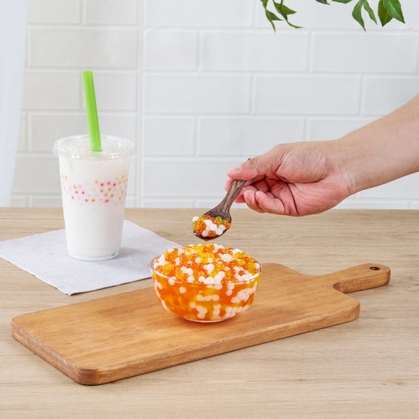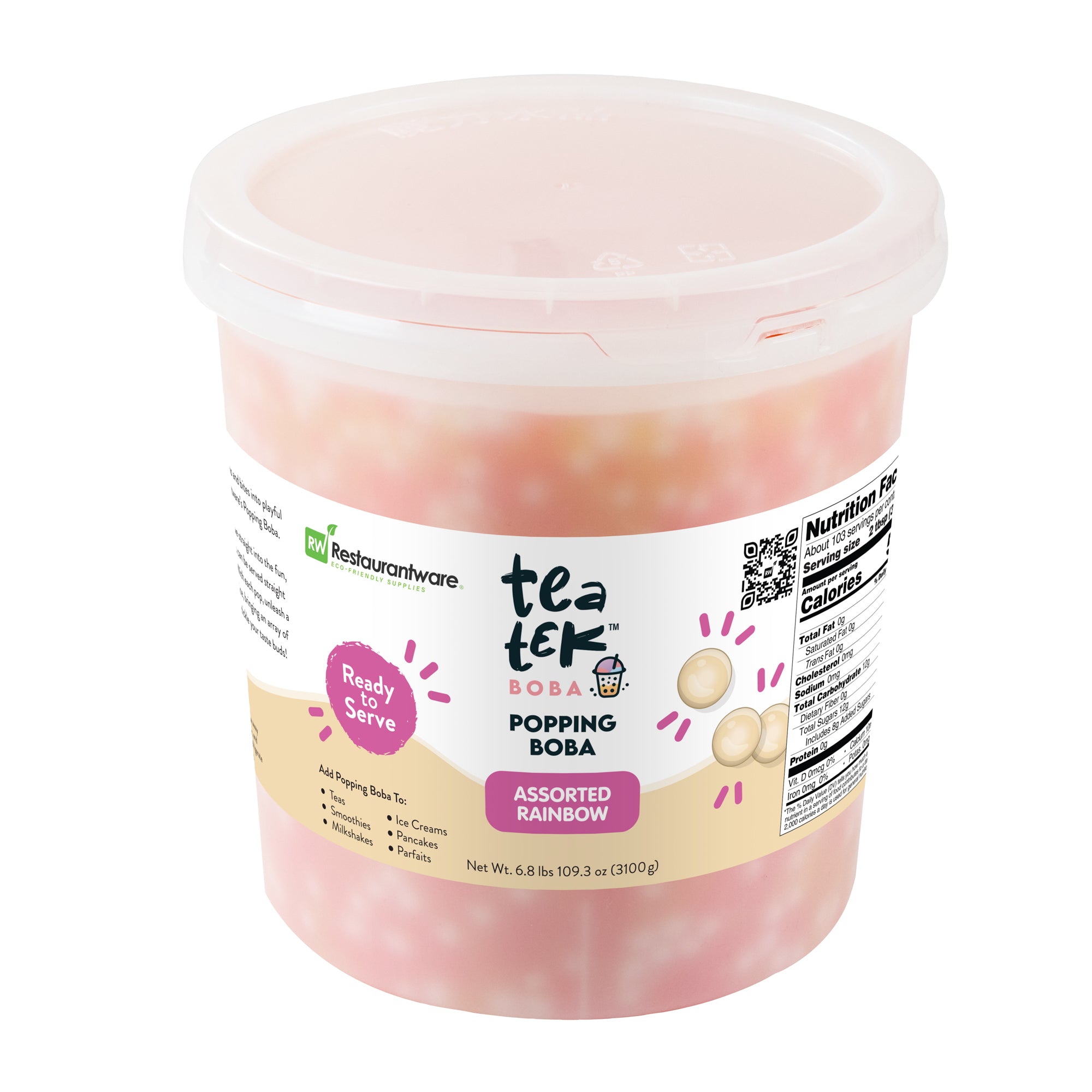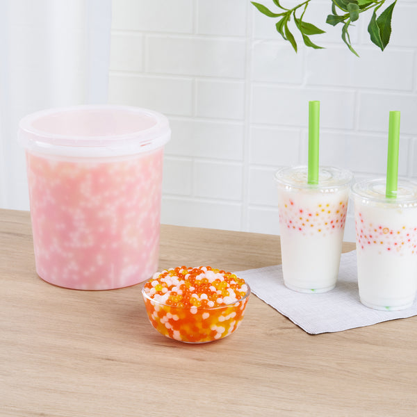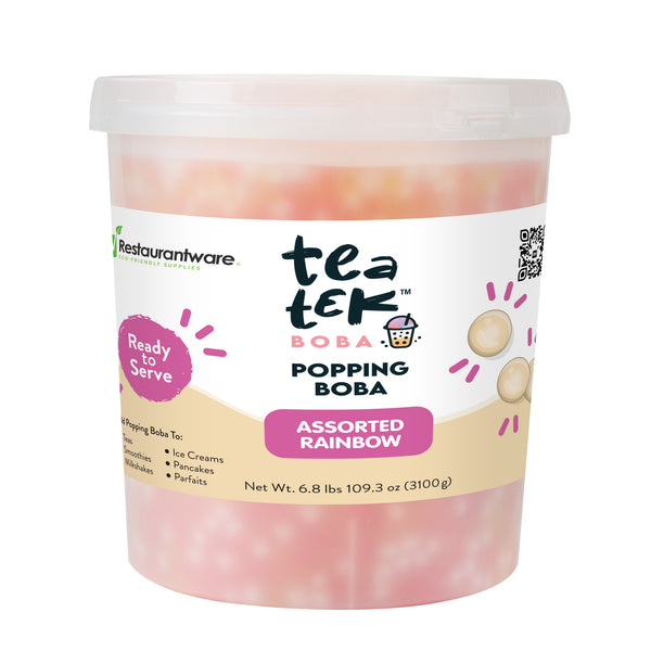 Entice customers with vibrant, eye-catching refreshments. Tea Tek Assorted Popping Boba in resealable packaging features assorted rainbow flavors that enhance both the visual appeal and taste of beverages and desserts, making your offerings stand out. The resealable jar is designed to maintain the freshness and extend the shelf life of the popping boba, ensuring you can efficiently manage inventory without sacrificing quality. With dimensions of 7.2 inches by 7.2 inches by 7.9 inches, this popping boba is perfectly sized for bubble tea shops and dessert parlors seeking to create visually striking presentations. Made from edible materials, the boba is vegan and dairy-free, broadening your menu's appeal to diverse dietary needs. The large 6.8-pound bulk packaging is ideal for high-volume establishments, offering a cost-effective solution that reduces the frequency of reordering. Each order includes 1 Tea Tek Assorted Popping Boba.