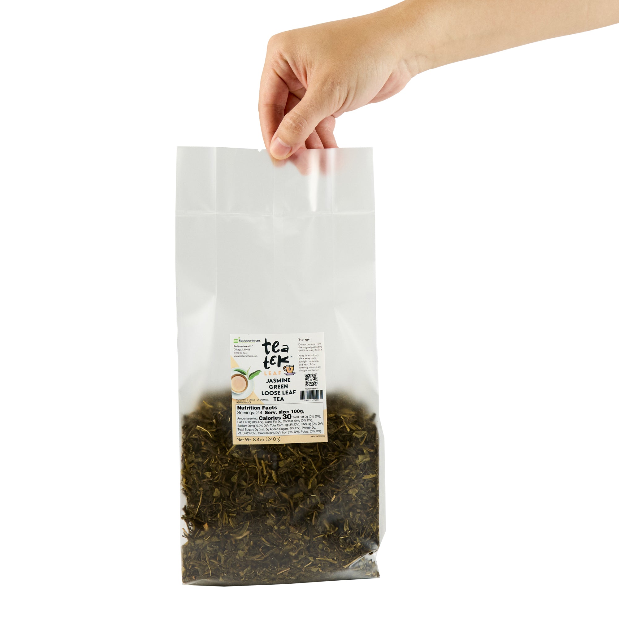 Enhance your tea service with an aromatic experience. Tea Tek Jasmine Green Loose Leaf Tea, featuring premium jasmine green tea leaves, delivers a delicate floral aroma and smooth flavor, perfect for creating an inviting ambiance in your café. The unique overnight fragrance absorption ensures your tea offerings captivate customers, enriching your beverage menu with every serving. Packaged in a convenient 8.4-ounce resealable bag, this jasmine tea not only maintains its freshness but also provides ample quantity for versatile use, whether you're serving hot cups of tea or crafting a refreshing bubble tea mix. With dimensions of 17.7 inches in height, this edible loose leaf tea is crafted from spring-harvested leaves, ensuring premium flavor retention. Elevate your patrons’ tea-drinking experience and keep them coming back for more with this exceptional jasmine green tea blend. Each order includes 1 Tea Tek Jasmine Green Loose Leaf Tea.