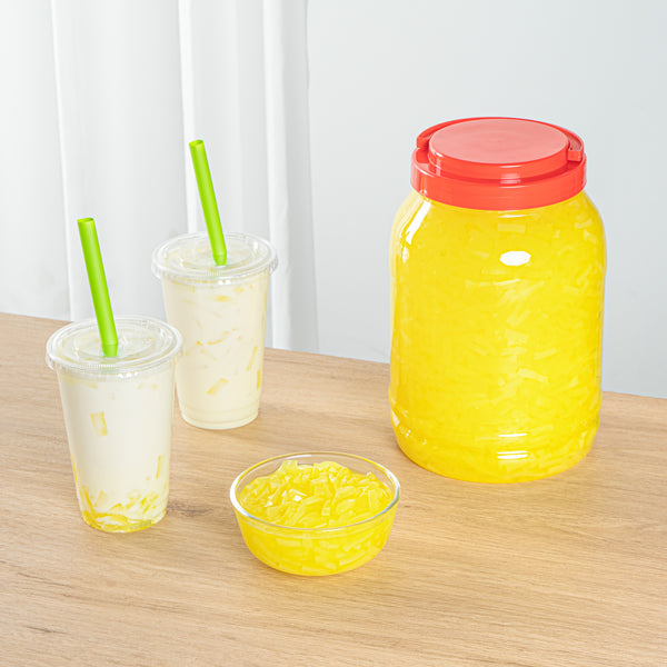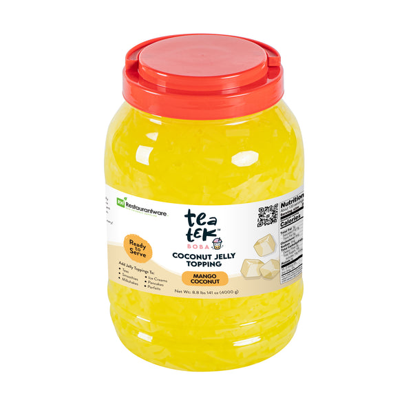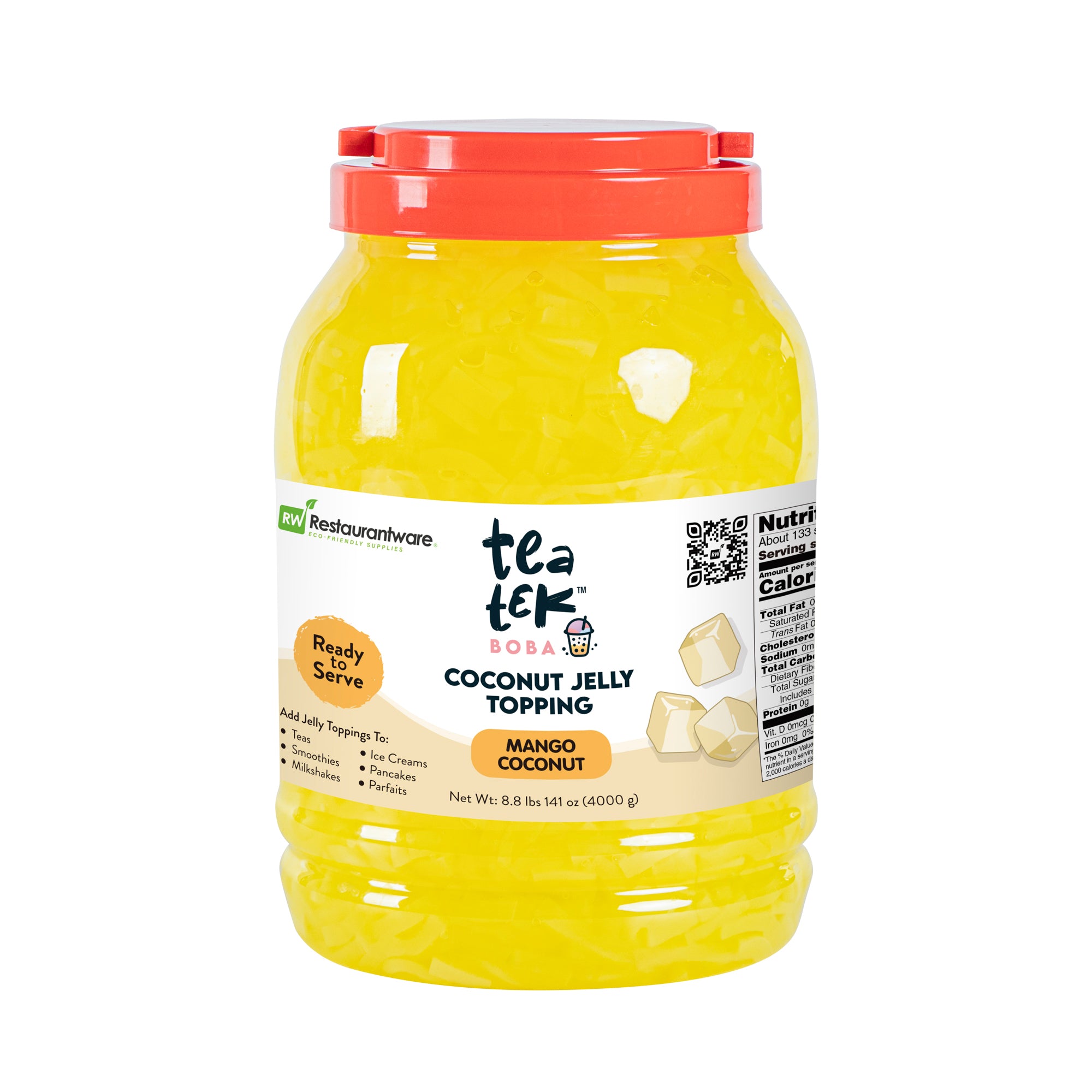 Enhance your culinary creations with our Tea Tek 8.8-pound Jelly Toppings in mango coconut flavor, perfect for adding a burst of flavor to any dessert or drink. The jelly-like texture makes these toppings not only delicious but also easy to use. There is no cooking required, you can simply scoop, rinse, and enjoy this delicious jelly topping. These delightful jelly toppings for bubble tea introduce an extra layer of taste and texture to your beverages and desserts. Ideal for a variety of beverages these jelly toppings enhance drinks like boba tea, mocktails, and smoothies. Each jelly topping jar offer a substantial capacity of 8.8 pounds. Sold in a 4 count box.
