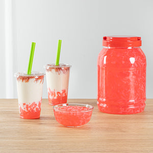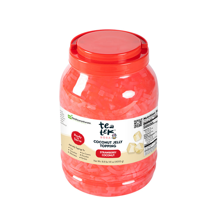 Elevate your desserts and beverages with our Tea Tek 8.8-pound Jelly Toppings in strawberry coconut flavor. Ideal for boba milk tea, slushies, and smoothies, this strawberry coconut jelly requires no cooking. Simply scoop, rinse, and taste this delicious boba jelly. These delightful jelly toppings for bubble tea add an extra layer of taste and texture to your culinary creations. Ideal for a variety of beverages these jelly toppings enhance drinks like boba tea, mocktails, and smoothies. Each jelly topping jar offer a substantial capacity of 8.8 pounds. Sold in a 4 count box.