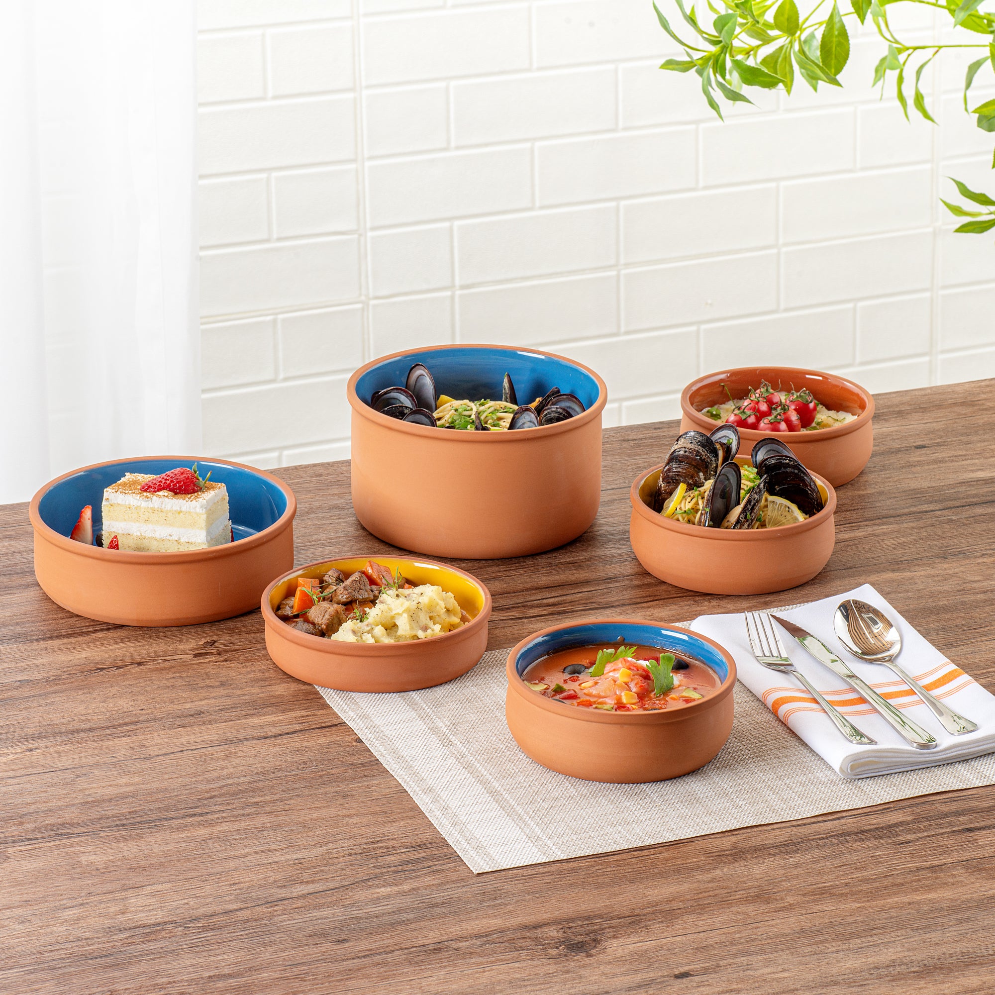 Enhance your restaurant's presentation with vibrant dishware. The Terra Tek Glazed Interior Terracotta Cazuela is designed with a stunning blue glazed interior, elevating the visual appeal of every meal served in this terracotta cazuela. Its dishwashable design enables quick cleanup, significantly reducing labor costs and increasing operational efficiency. Crafted from durable terracotta, this cazuela withstands high temperatures, making it ideal for versatile use from oven to freezer, and ensuring longevity in commercial settings. With a generous 17-ounce capacity and a 5.75-inch diameter, it provides ample space for a variety of dishes, from tapas to individual desserts, making it the perfect tapas serving bowl. The combination of its durability, aesthetic appeal, and practicality makes it a must-have for any foodservice establishment looking to impress guests with presentation and efficiency. Each order includes 10 Terra Tek Glazed Interior Terracotta Cazuela.