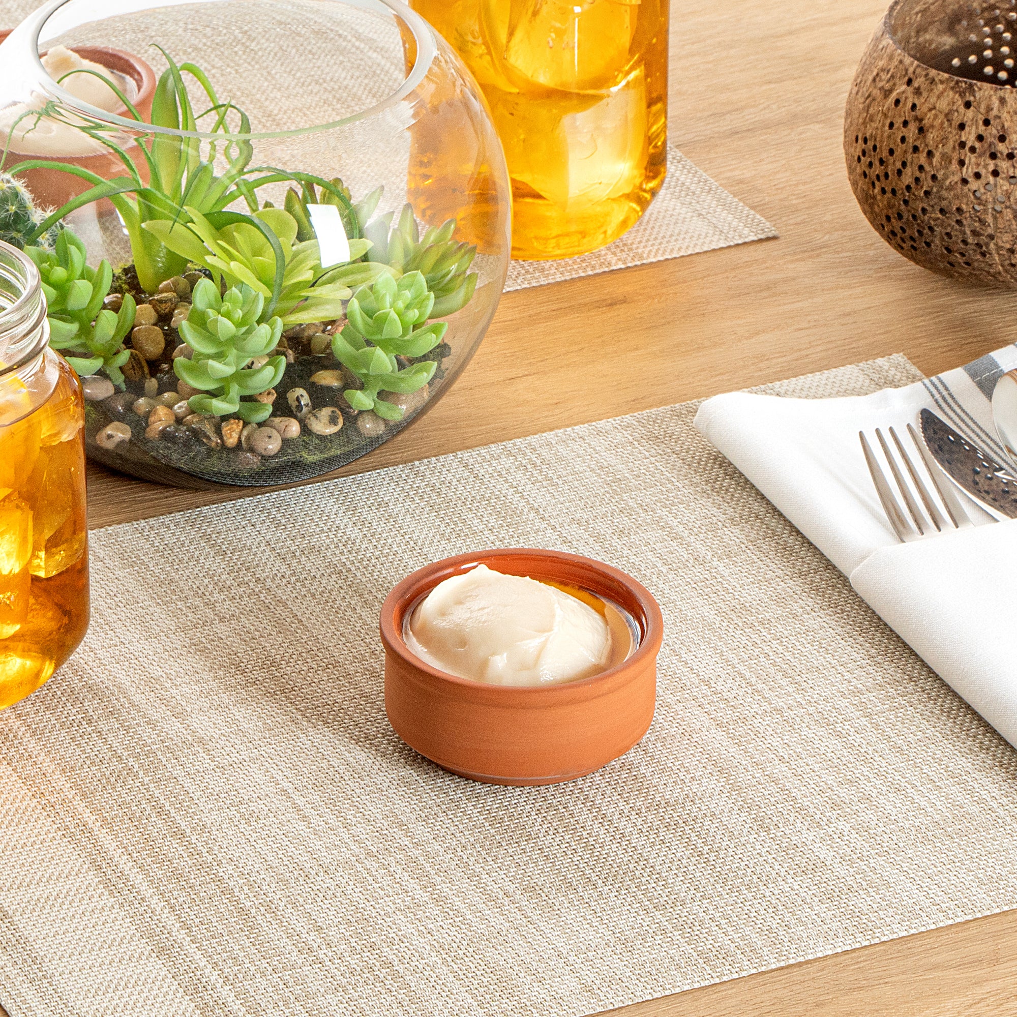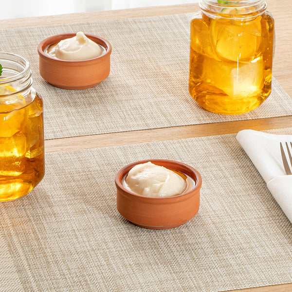 Enhance your culinary presentations with functional elegance. The Terra Tek Glazed Interior Terracotta Cazuela Bowl combines rustic charm with practicality, featuring a brown glazed interior that enhances the visual appeal of your dishes, making it a standout terracotta cazuela bowl in any setting. Crafted from durable terracotta, this bowl is oven-safe and microwave-safe, ensuring it withstands high temperatures and frequent use, an essential for rustic terracotta dish presentations in bustling kitchens. Its 3.1 inches by 3.1 inches by 1.4 inches dimensions provide a compact size ideal for serving individual portions, reducing food waste while optimizing space in tapas, catering, or buffet settings. This brown glazed bowl simplifies clean-up with its dishwasher-safe design, saving time and effort in post-meal routines. Elevate your foodservice operations with this versatile addition. Each order includes 10 Terra Tek Glazed Interior Terracotta Cazuela Bowls.