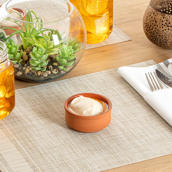 Enhance your culinary presentations with functional elegance. The Terra Tek Glazed Interior Terracotta Cazuela Bowl combines rustic charm with practicality, featuring a brown glazed interior that enhances the visual appeal of your dishes, making it a standout terracotta cazuela bowl in any setting. Crafted from durable terracotta, this bowl is oven-safe and microwave-safe, ensuring it withstands high temperatures and frequent use, an essential for rustic terracotta dish presentations in bustling kitchens. Its 3.1 inches by 3.1 inches by 1.4 inches dimensions provide a compact size ideal for serving individual portions, reducing food waste while optimizing space in tapas, catering, or buffet settings. This brown glazed bowl simplifies clean-up with its dishwasher-safe design, saving time and effort in post-meal routines. Elevate your foodservice operations with this versatile addition. Each order includes 2 Terra Tek Glazed Interior Terracotta Cazuela Bowls.