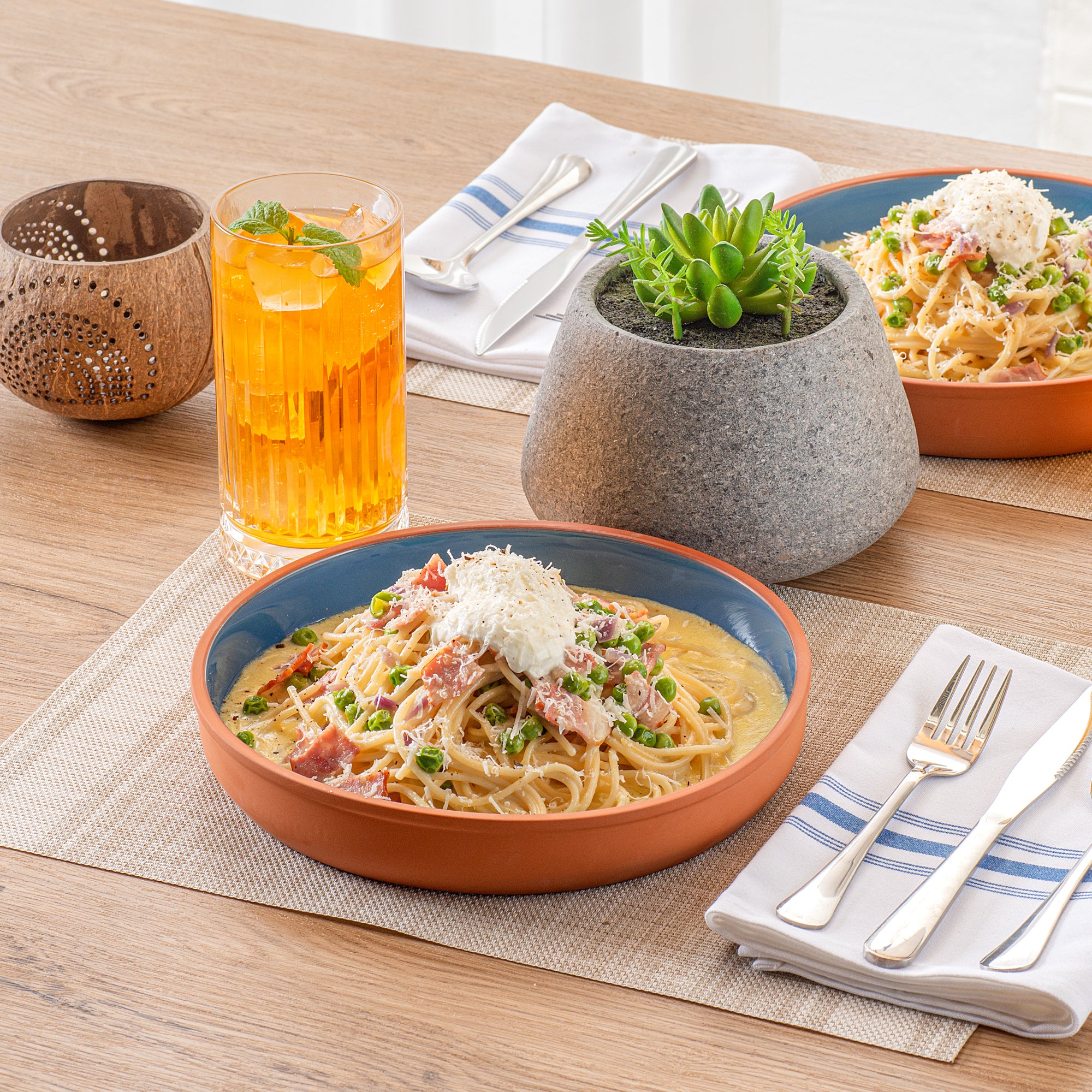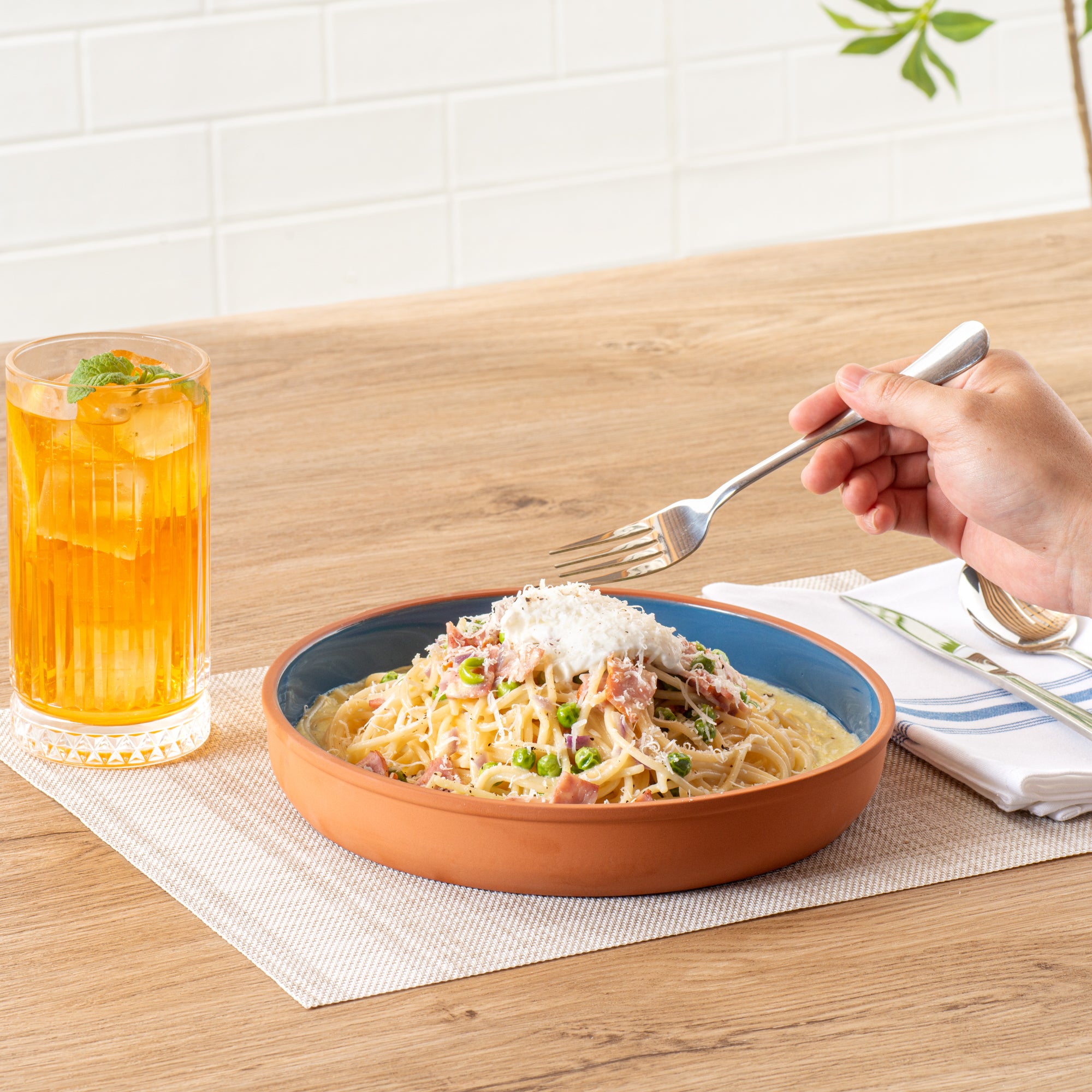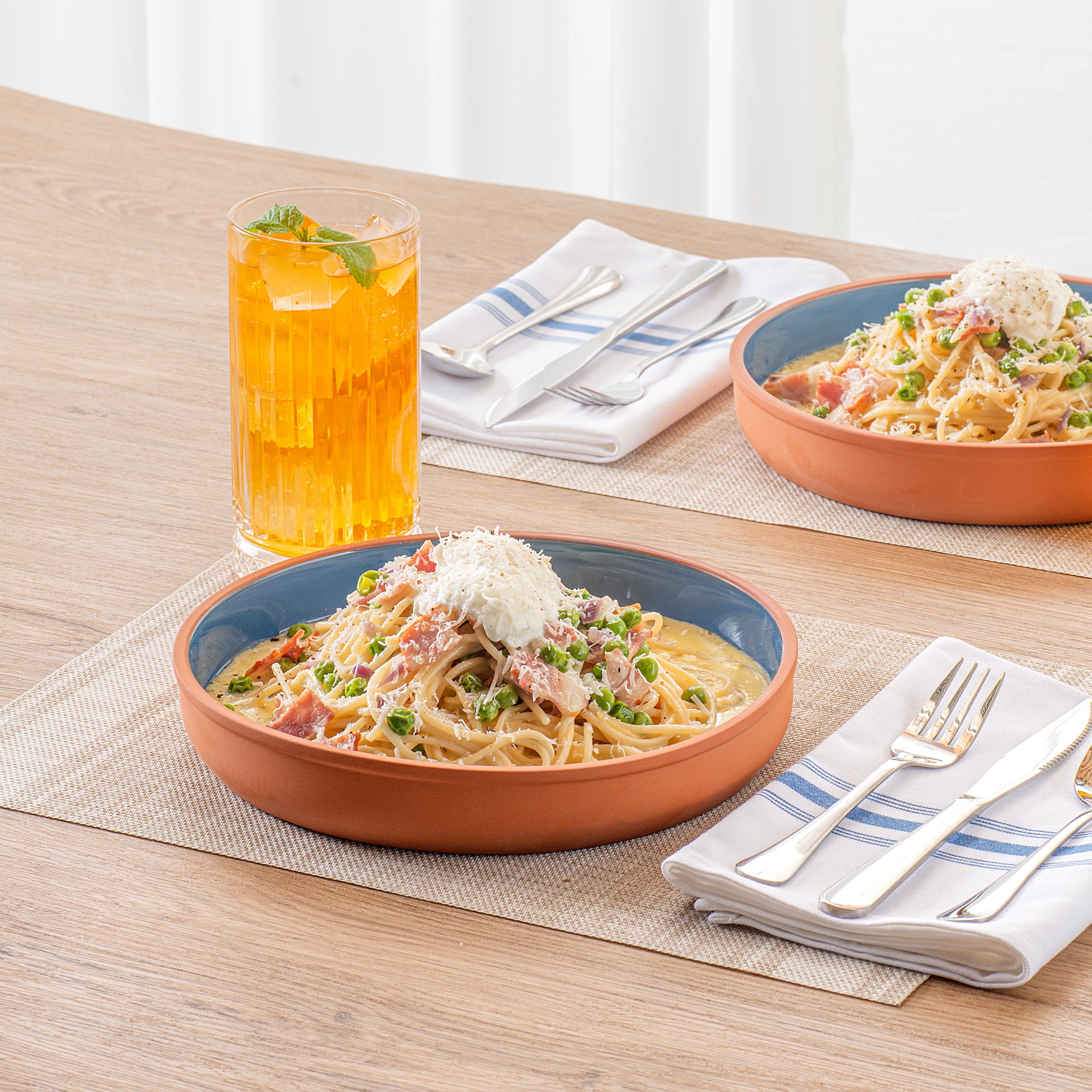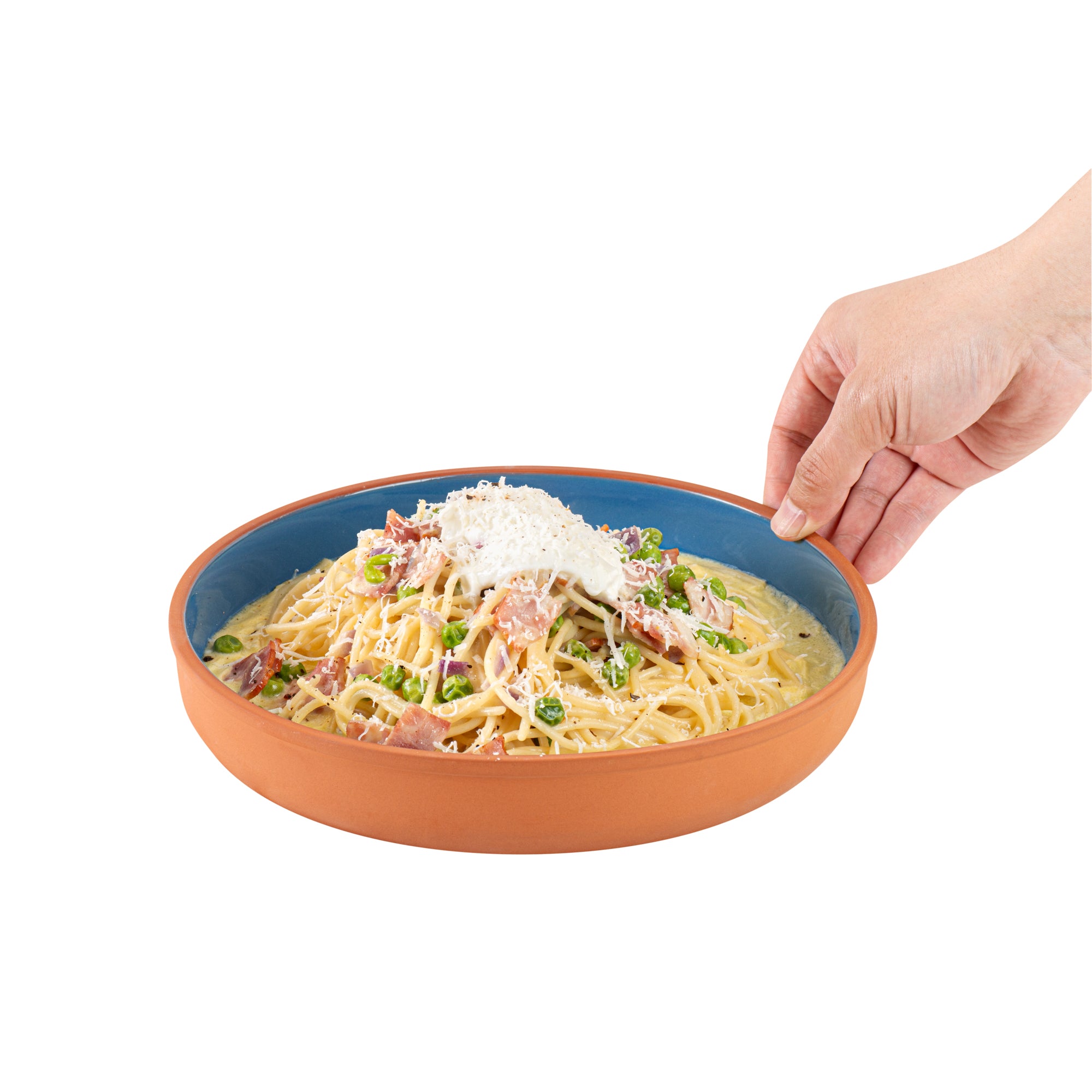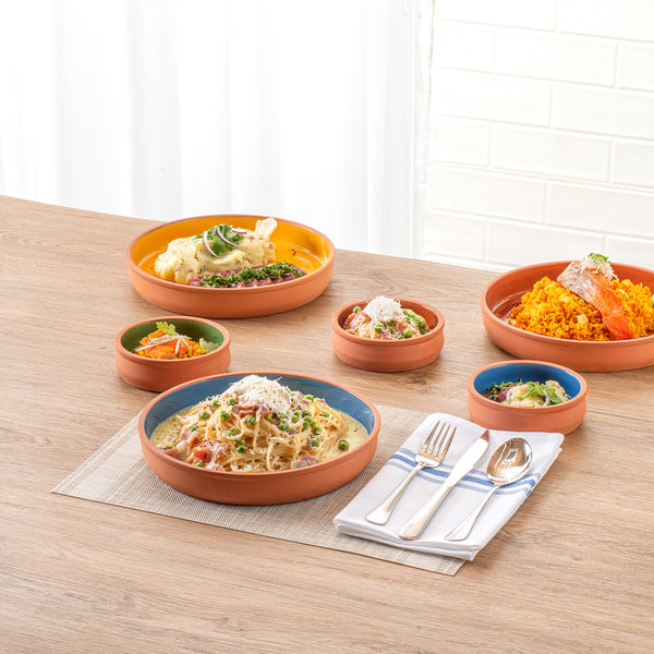 Introduce a touch of rustic charm to your culinary creations with our Terra Tek 34-ounce Terracotta Cazuela Bowls. Crafted from durable terracotta, these recyclable cazuela bowls are designed to withstand the rigors of daily use in a busy kitchen. The blue glazed interior of these greaseproof glazed bowls adds an elegant touch, ensuring your dishes are as visually appealing as they are delicious. These cooking bowls are oven-ready, making them a versatile addition to any gourmet kitchen. For meals that require heating or reheating, these microwave cooking bowls offer convenience and efficiency. To freeze your signature soups or stews, these reusable terracotta bowls are freezable, ensuring you always have a ready meal on hand. Cleanup is a breeze with these dishwashable bowls, saving time and effort. With a generous capacity of 34 ounces, these blue greaseproof glazed bowls are perfect for hearty servings. These dishwashable bowls measure 9.25 inches in diameter and 1.5 inches in height, providing ample space for your culinary masterpieces. Sold in a 2 count box.