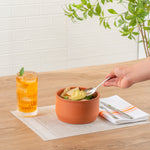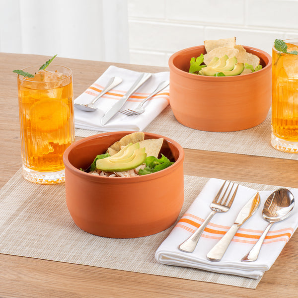 Introduce a touch of rustic elegance to your culinary creations with our Terra Tek 34-ounce Terracotta Cazuela Bowls. These cazuela bowls, made from durable terracotta, ensure longevity and reliability in even the busiest of kitchens. With a unique brown glazed interior, these greaseproof glazed bowls not only provide a beautiful contrast to your food but also ensure easy clean-up. These cooking bowls are oven-ready, making them the perfect companion for your oven-baked recipes. Plus, these microwave cooking bowls can be used to reheat your meals without compromising the flavor or texture. For those who love to prep in advance, these recyclable cazuela bowls can be securely stored in the freezer, making them a versatile addition to any gourmet kitchen. With a capacity of 34 ounces, these reusable terracotta bowls are perfect for serving main courses or family-sized salads. Measuring 6.25 inches in diameter by 3.5 inches in height, these terracotta cazuelas are just the right size for your serving needs. Sold in a 10 count box.