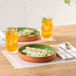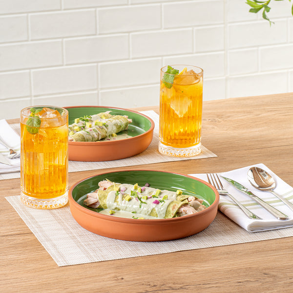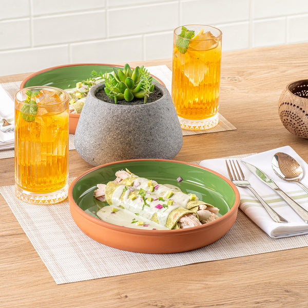 Experience traditional Spanish cuisine with our Terra Tek 34-ounce Terracotta Cazuela Bowls. These recyclable cazuela bowls, crafted from durable terracotta, bring a touch of authenticity to any dining setting. Featuring a vibrant green glazed interior, these greaseproof glazed bowls add a splash of color and sophistication to your culinary creations. Perfect for various uses, these cooking bowls can be taken straight from the oven to the table. These microwave cooking bowls allow for quick and convenient reheating of dishes, ensuring your meals are always served at the perfect temperature. Conveniently freezable, these gourmet kitchen bowls provide a practical solution for food storage and meal preparation. With their dishwashable design, cleanup is a breeze. Containing up to 34 ounces, these reusable terracotta cazuelas measure 9.25 inches in diameter by 1.5 inches in height and are perfect for serving hearty stews or paellas, making them a versatile addition to any kitchenware collection. Sold in a 2 count box.