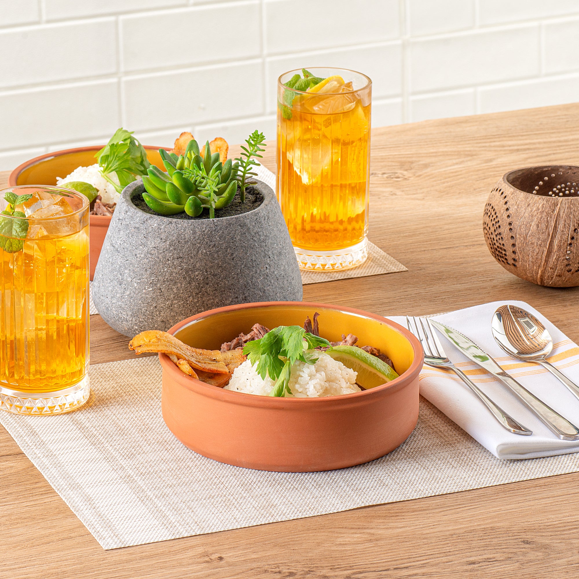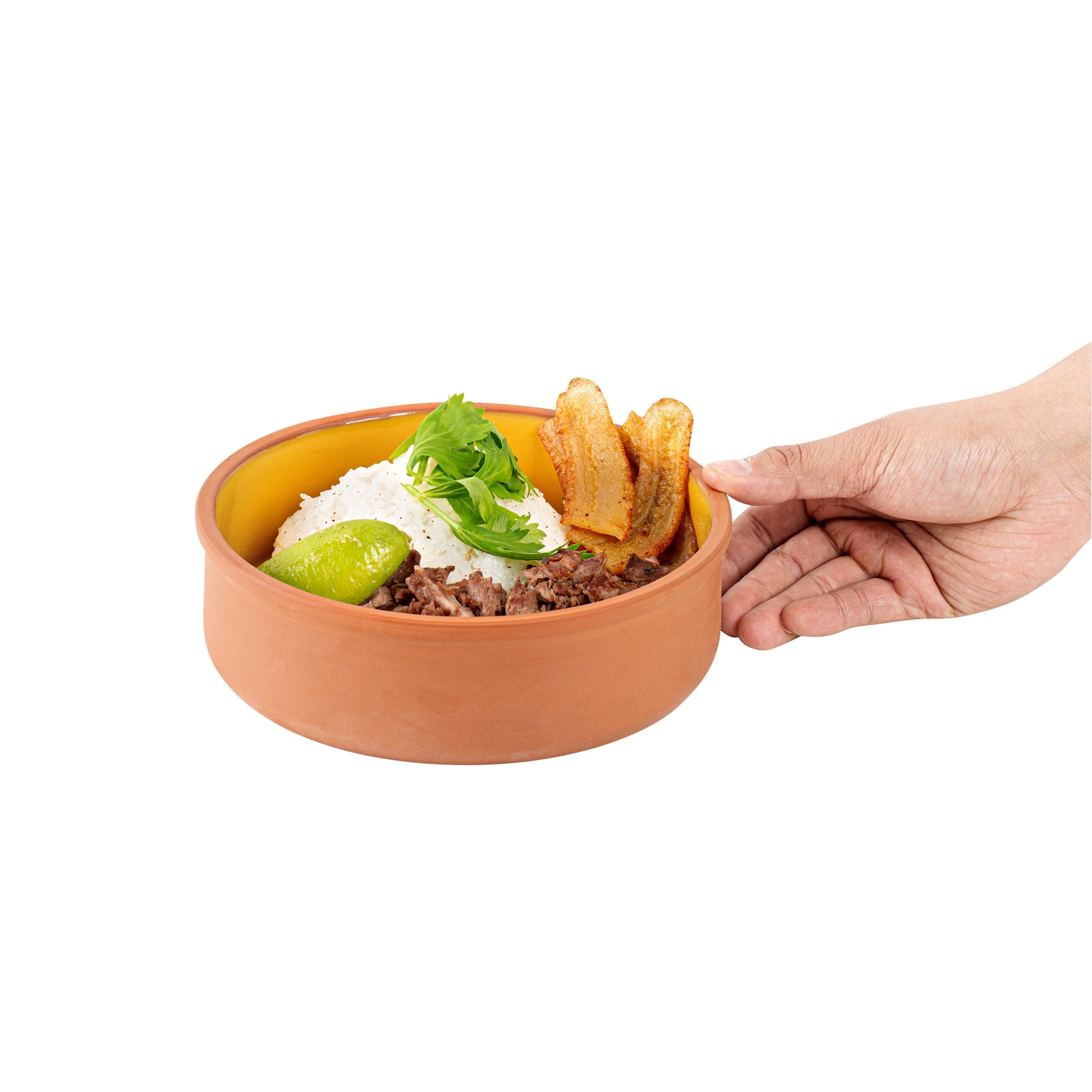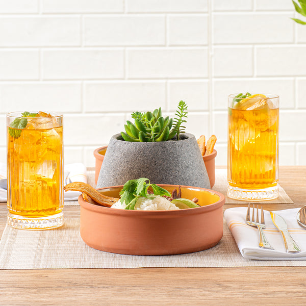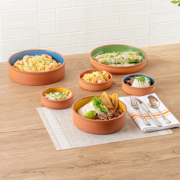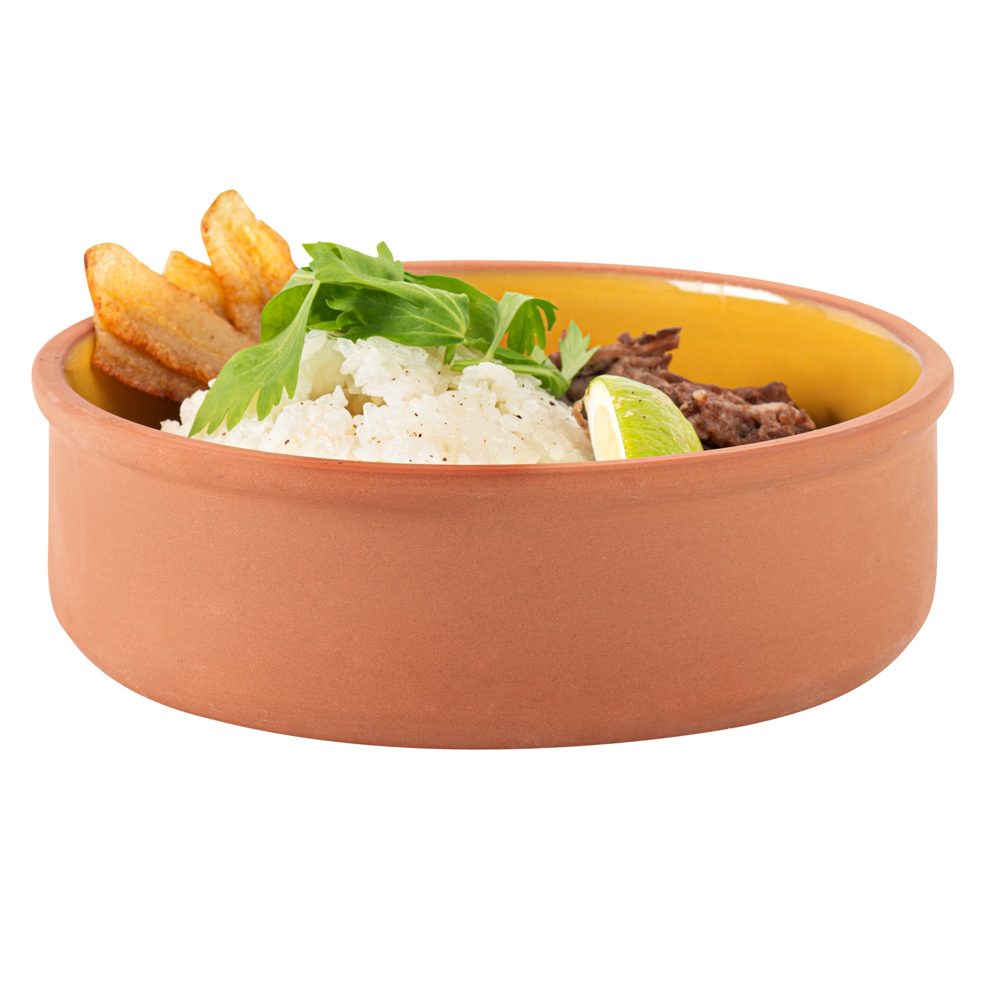 Elevate your culinary creations with our Terra Tek 34-ounce Terracotta Cazuela Bowls. Crafted from durable terracotta, these recyclable cazuela bowls ensure long-lasting use and withstand frequent handling in busy kitchens. Showcasing a striking yellow glazed interior, these terracotta bowls add an attractive touch to your food presentations. Ideal for cooking and serving, these glazed cooking bowls are oven-ready, allowing you to prepare delicious meals with ease.These microwavable terracotta bowls are perfect for quickly reheating dishes without sacrificing taste or quality. Plus, these greaseproof gourmet kitchen bowls are also freezable and dishwashable for ultimate convenience. Holds up to 34 ounces and measuring 7.5 inches in diameter by 2.25 inches in height, these glazed terracotta cazuelas are perfect for serving hearty meals. Sold in a 10 count box.