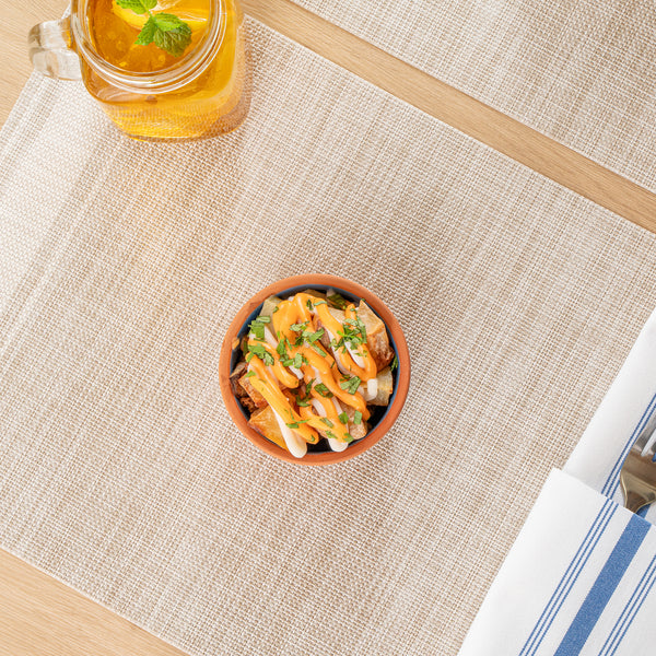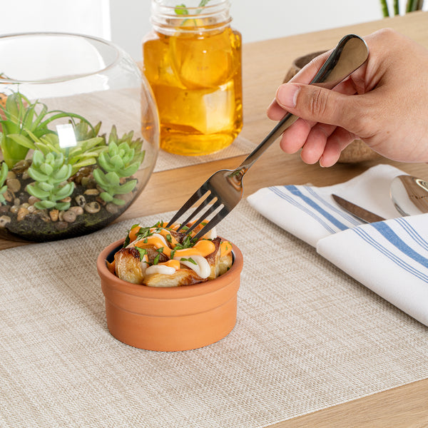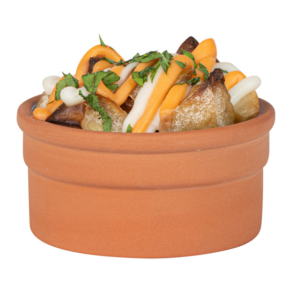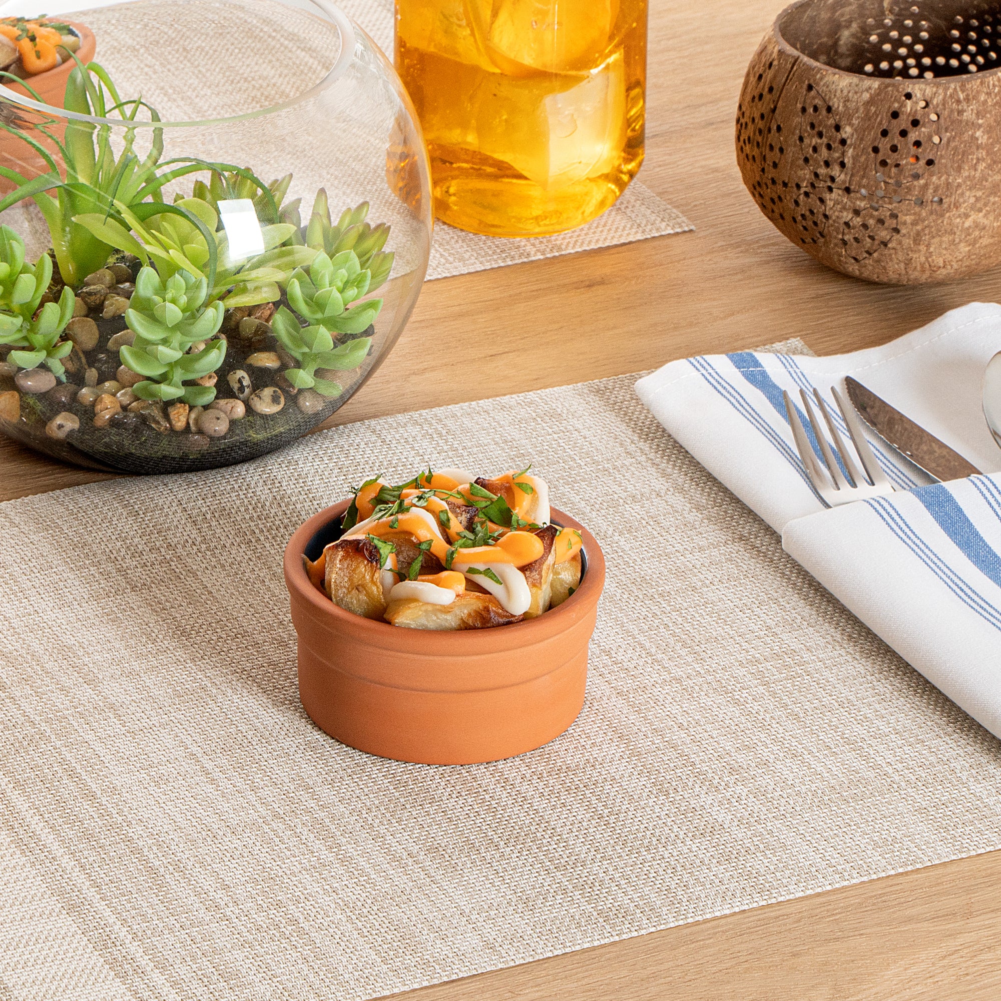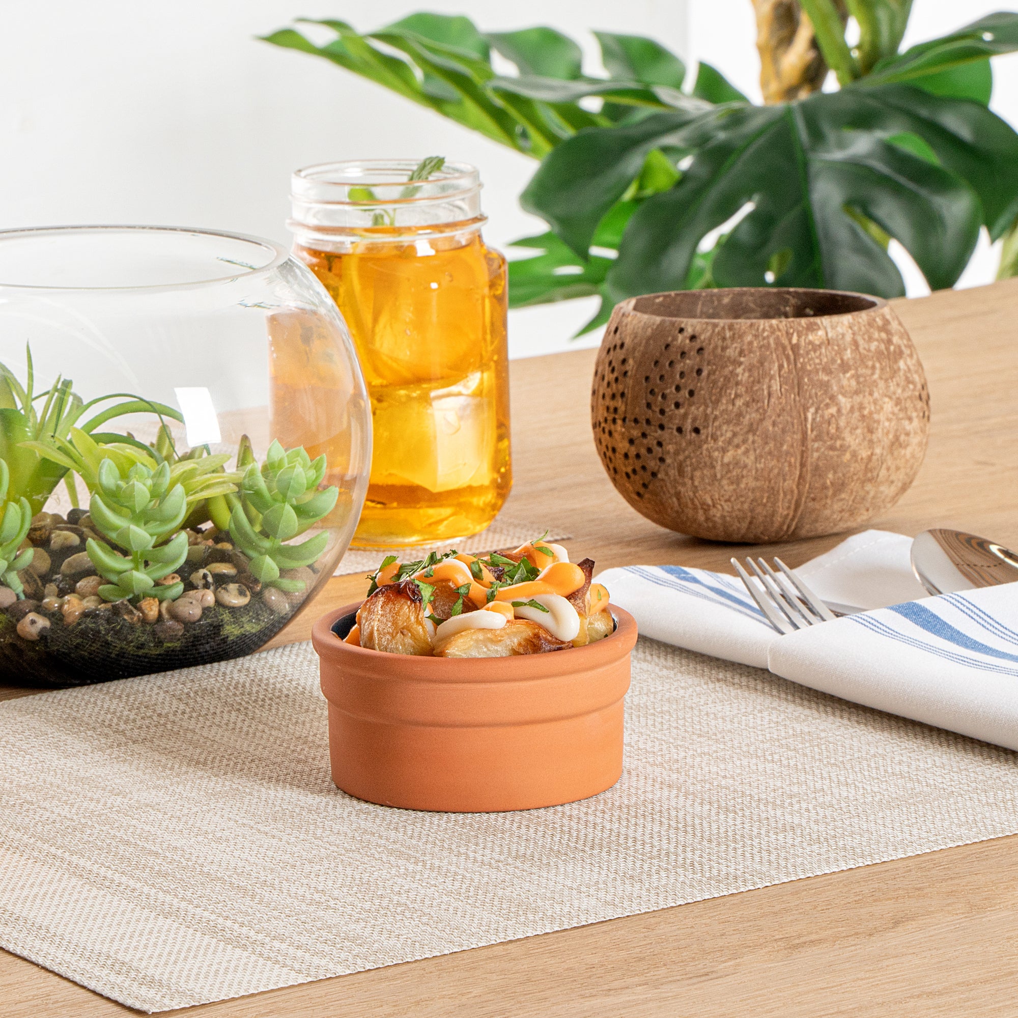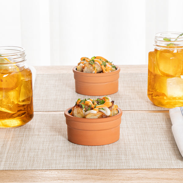 Elevate your culinary presentation with our Terra Tek 5-ounce Terracotta Cazuela Bowls. These Recyclable cazuela bowls are handcrafted from durable terracotta, offering an authentic and rustic touch to your dining experience. Showcasing a beautiful blue-glazed interior, these greaseproof glazed bowls not only enhance your food presentation but also make cleaning effortless. Heat up your dishes directly in these oven-ready cooking bowls, saving you both time and effort in the kitchen. Conveniently microwavable, these microwave cooking bowls ensure your meals are served at the perfect temperature, every time. For effortless food storage and cleanup, these gourmet kitchen bowls serve perfectly while being both freezable and dishwashable. Contains up to 5 ounces, these terracotta cazuelas have just the right capacity for serving appetizers, desserts or tapas. Measuring 3.25 inches in diameter by 1.5 inches in height, these reusable terracotta bowls are ideal for maximizing space in your kitchen or on your table. Sold in a 2 count box.