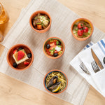 Streamline meal presentation with our Terra Tek Glazed Interior Round Terracotta Bowl. This 3.7-inch round terracotta bowl features a green glazed interior that enhances meal presentation, making dishes visually appealing for diners. Its dishwashable design enables effortless post-meal cleaning, saving time and effort for busy foodservice professionals. Constructed from premium terracotta, this cazuela bowl ensures durability and withstands high temperatures, ideal for versatile oven and microwave use. The compact size fits perfectly on serving trays, optimizing space in bustling kitchens. Use it as a terracotta serving dish to present tapas or desserts elegantly. With its ability to accommodate both hot and cold foods, this bowl is perfect for a variety of dining scenarios, from restaurants to catering events. Elevate your culinary creations with ease and efficiency. Each order includes 2 Terra Tek Glazed Interior Round Terracotta Bowls.
