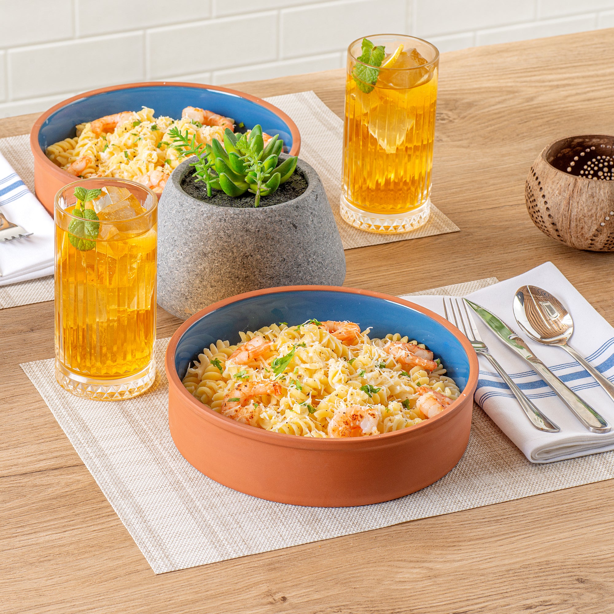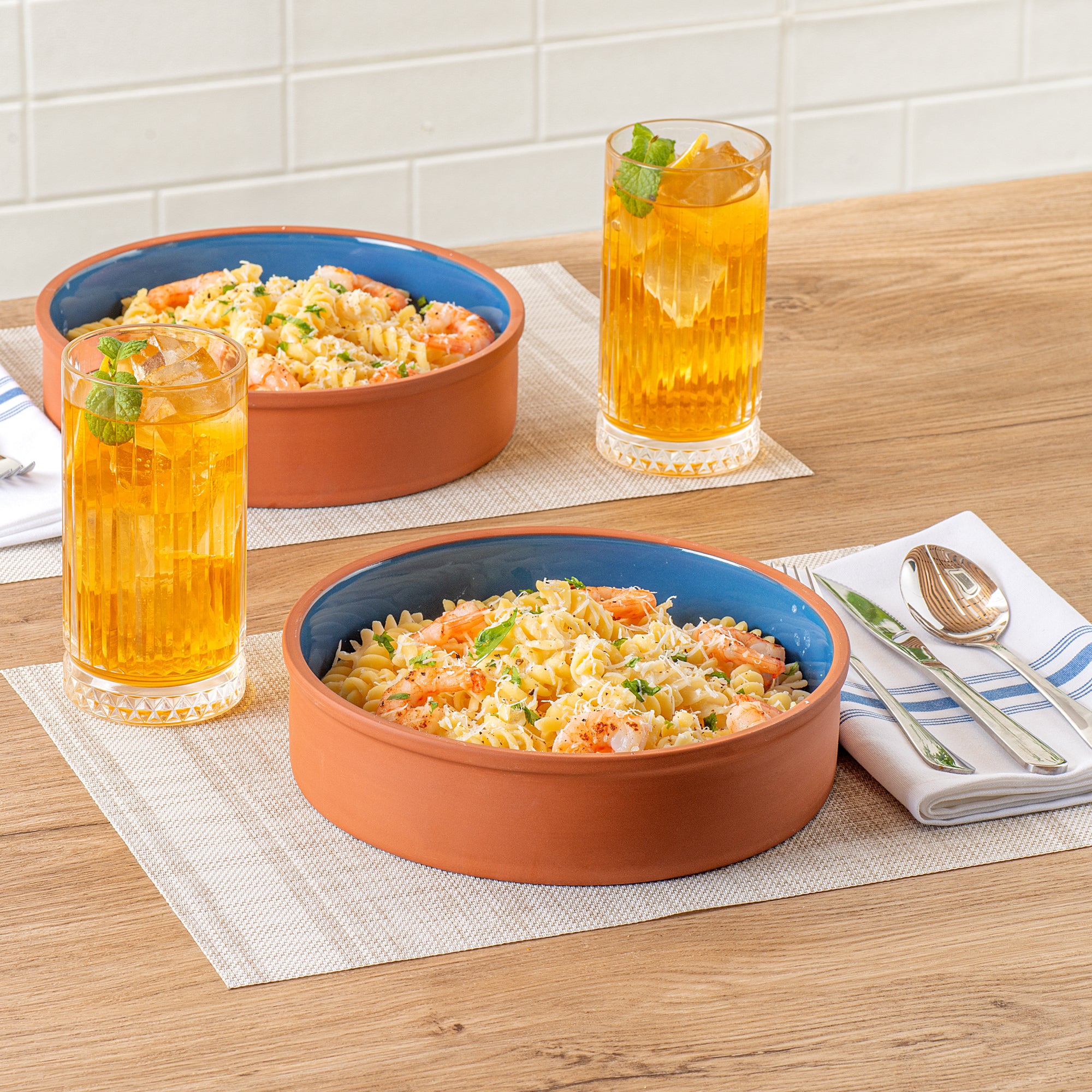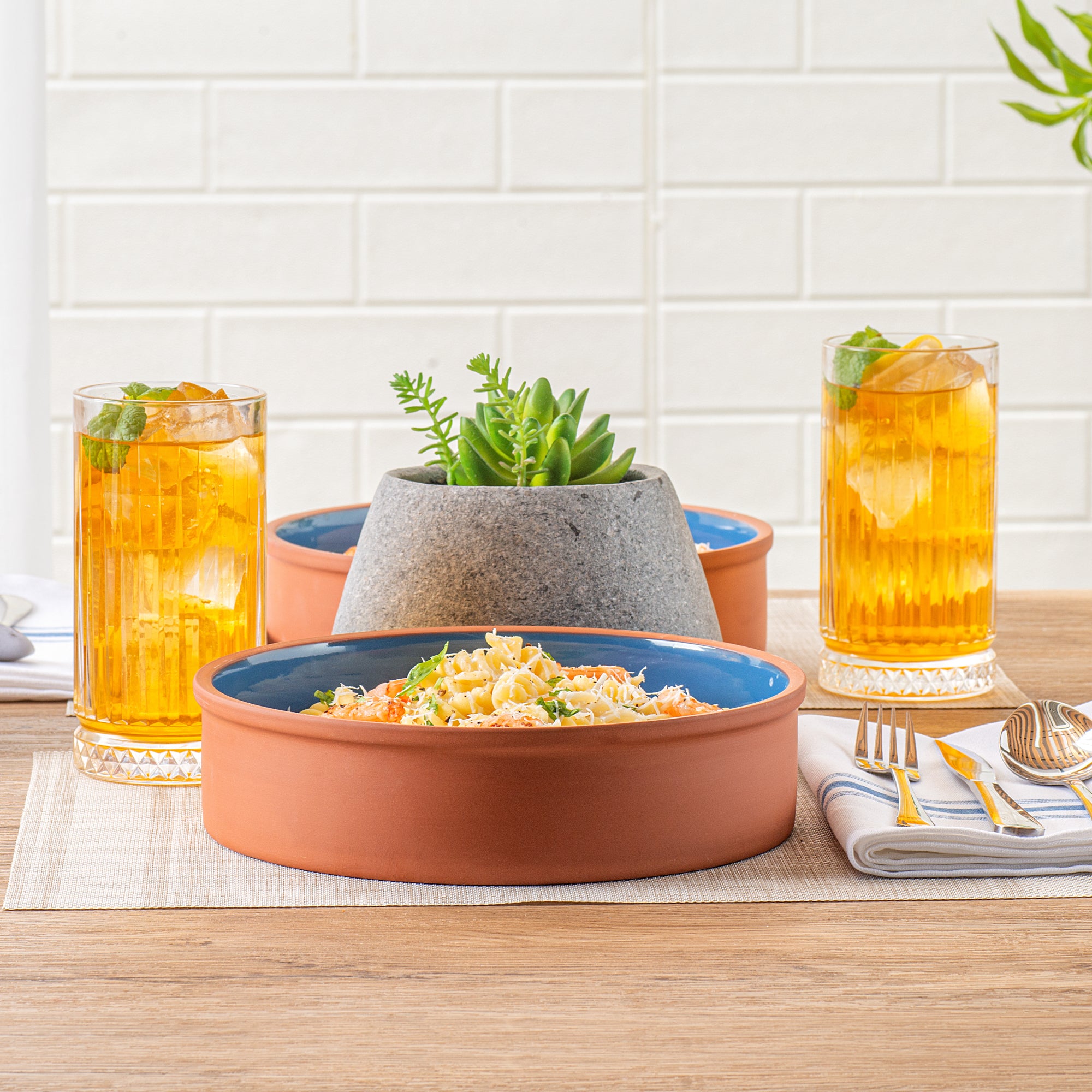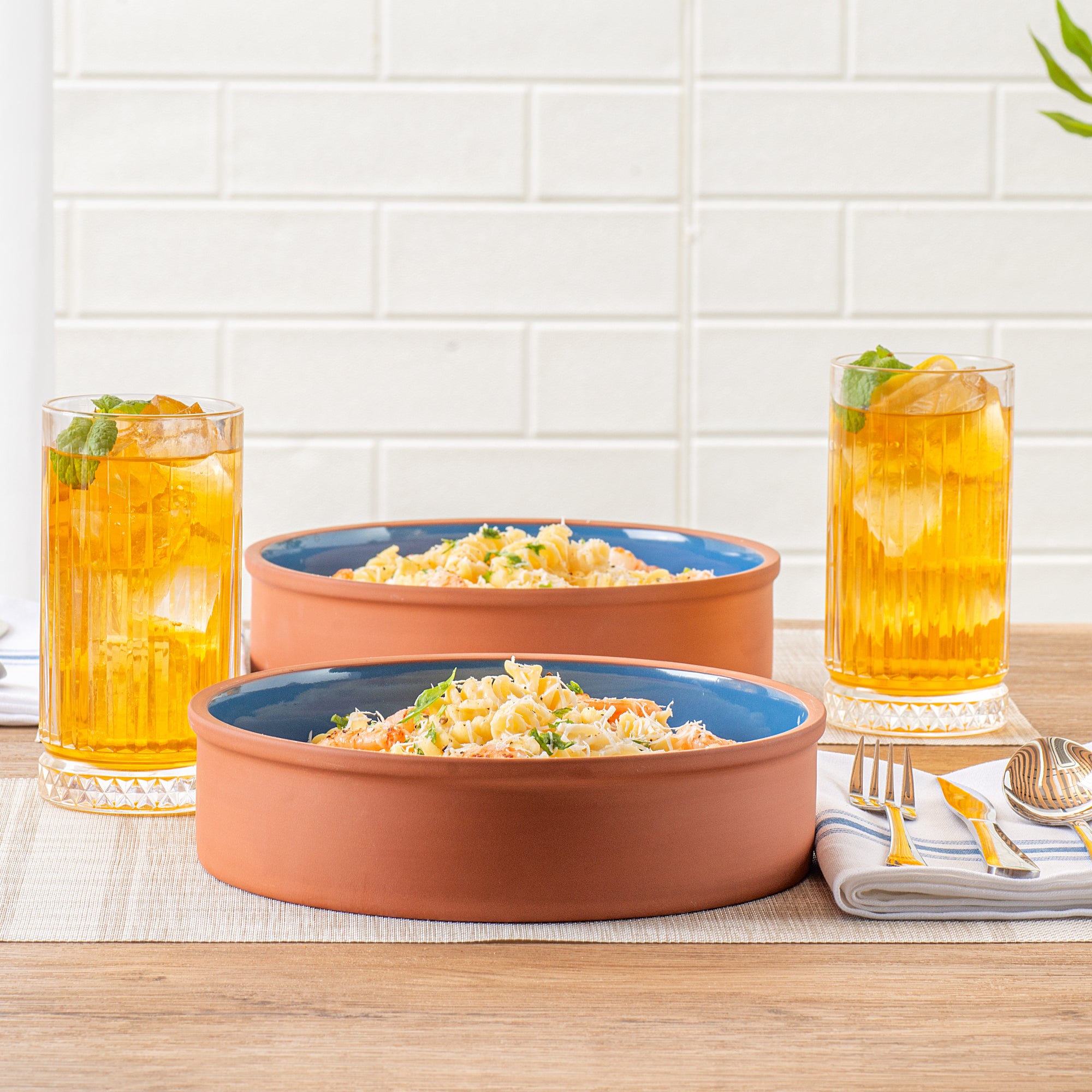 Add a touch of rustic elegance to your culinary creations with our Terra Tek 51-ounce Terracotta Cazuela Bowls. These recyclable cazuela bowls are crafted from durable terracotta, providing a robust platform for your most delectable dishes. With their vibrant, blue glazed interiors, these reusable greaseproof glazed bowls not only enhance your presentation but also offer an easy-to-clean surface for your convenience. Oven-ready and microwavable, these cooking bowls adapt to your needs, whether you're preparing a slow-cooked casserole or a quick microwave meal. The versatility of these microwave cooking bowls makes preheating food a breeze. These cooking bowls are freezable to store leftovers. Plus, these blue greaseproof glazed bowls are dishwashable, making them perfect for meal prep and easy cleanup. Boasting a generous capacity of 51 ounces, these terracotta cazuelas are designed to hold hearty portions of your delicious culinary creations. Measuring 9 inches in diameter by 2.25 inches in height, these cazuelas can easily accommodate a variety of dishes, from savory stews to sumptuous salads. Sold in a 2 count box.