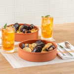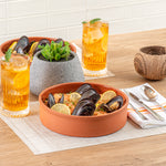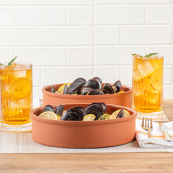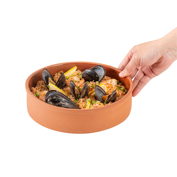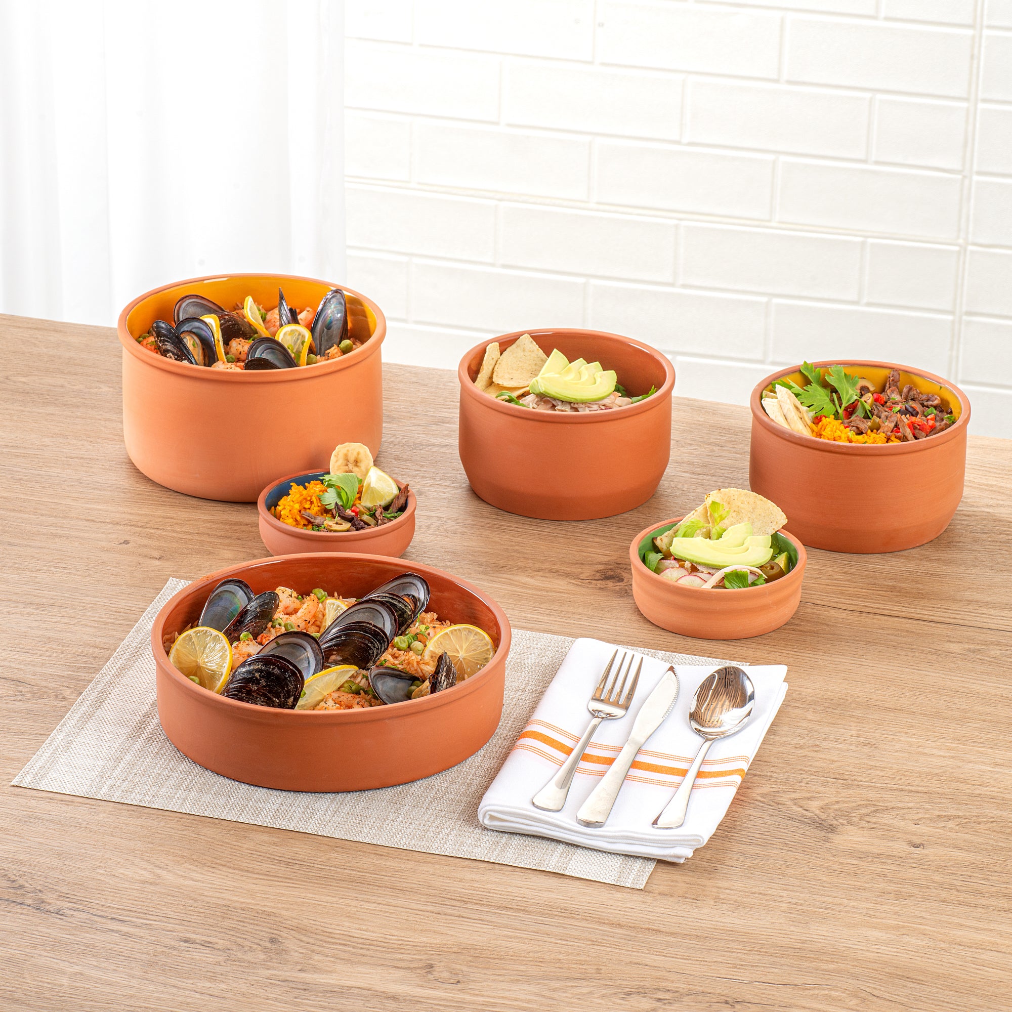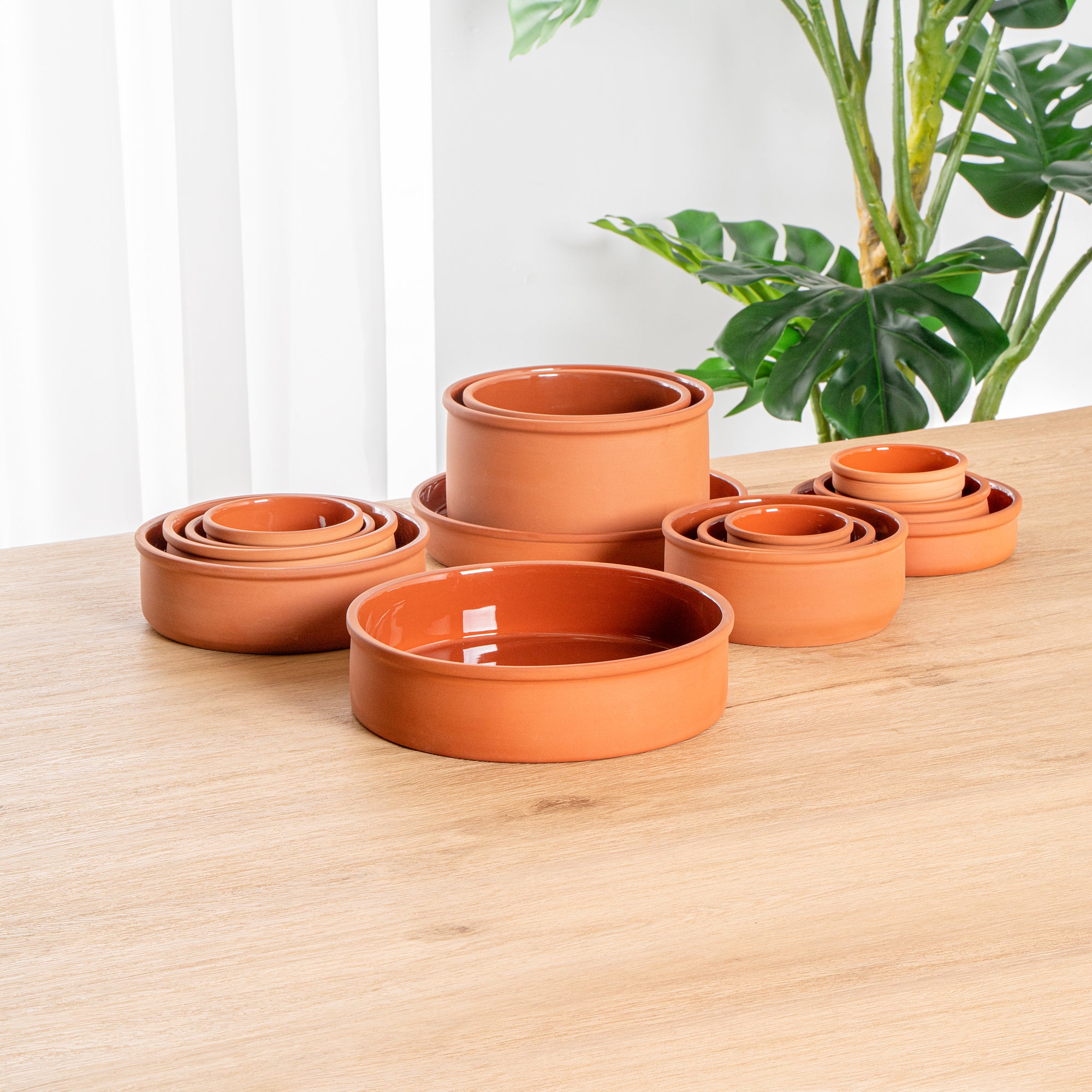 Elevate your culinary creations with our Terra Tek 51-ounce Terracotta Cazuela Bowls. These recyclable cazuela bowls are expertly crafted from durable terracotta, offering longevity and a rustic aesthetic that adds charm to any dish. With a stunning brown glazed interior, these greaseproof glazed bowls enhance the overall dining experience. These cooking bowls are oven-ready, allowing you to prepare, bake, and serve meals all in the same dish, simplifying your cooking process. Plus, these microwave cooking bowls are designed to withstand high heat, making reheating meals a breeze. With their freezable design, these terracotta cazuelas make storing leftovers or meal-prepping easy and efficient. The dishwashable attribute adds to the convenience, making clean-up after a busy day in the kitchen a seamless task. Boasting a generous 51-ounce capacity, these reusable cazuela bowls measure 9 inches in diameter by 2.25 inches in height, making them ideal for serving hearty portions of your delicious meals. Sold in a 10 count box.