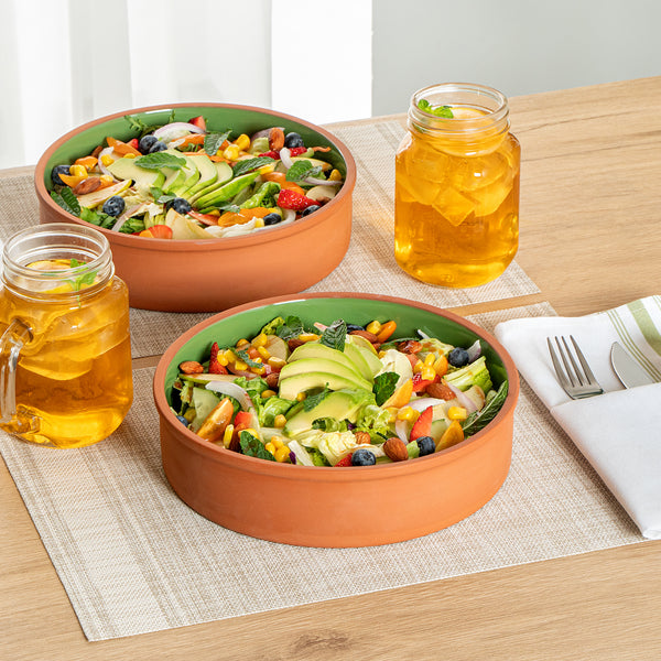 Experience the rustic charm of our Terra Tek 51-ounce Terracotta Cazuela Bowls, a perfect addition to your gourmet kitchenware. These recyclable cazuela bowls showcase a robust terracotta construction, providing impressive durability for your culinary creations. Flaunting a vivid green glazed interior, these greaseproof glazed bowls enhance your food presentation. These glazed serving bowls are oven-ready, allowing you to bake and serve in the same elegant dish. Transform your cooking experience with this microwave cooking bowl, designed to distribute heat for perfectly cooked meals every time evenly. Conveniently freezable, these terracotta cazuelas can transition from freezer to oven without any risk of cracking, preserving your food's freshness. With the convenience of dishwashability, maintaining these reusable cooking bowls is a breeze. Containing a generous capacity of 51 ounces, these dishwashable bowls are ideal for serving hearty meals. With dimensions of 9 inches in diameter by 2.25 inches in height, these gourmet kitchen bowls can comfortably hold large portions without compromising on style. Sold in a 2 count box.