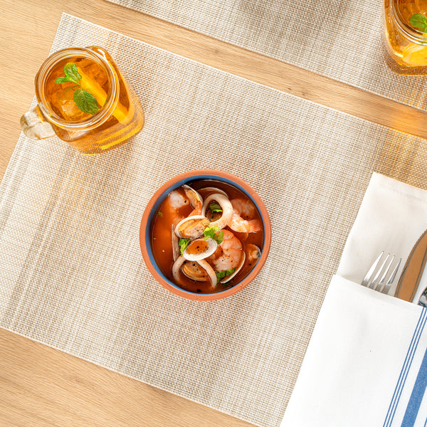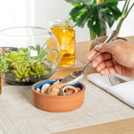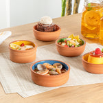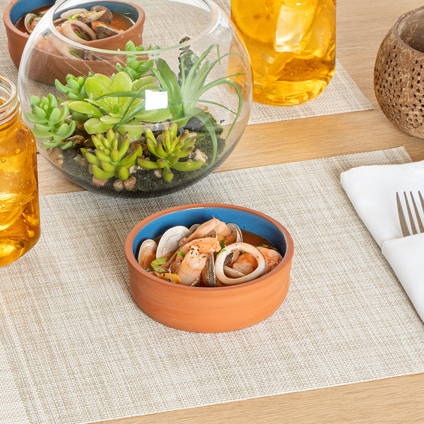 Ensure seamless kitchen-to-table service with our Terra Tek Blue Terracotta Cazuela Bowl. This terracotta bowl is crafted from premium terracotta, providing excellent heat retention to keep dishes warm throughout service. With a 4.75-inch by 1.6-inch dimension, it boasts a glazed interior that enhances presentation, making your meals visually appealing. As a versatile cazuela bowl, it's designed to be oven, microwave, and freezer safe, allowing you to prepare, store, and serve your creations without transferring contents into another dish. Perfect as a tapas serving dish, its 6.8-ounce capacity is ideal for individual portions of appetizers, sides, or desserts, adding an authentic touch to your culinary offerings. The dishwashable design simplifies cleaning, reducing labor costs and freeing up valuable time for your staff in busy commercial kitchens. Elevate your dining experience with this multifunctional tableware. Each order includes 10 Terra Tek Blue Terracotta Cazuela Bowls.