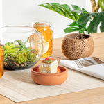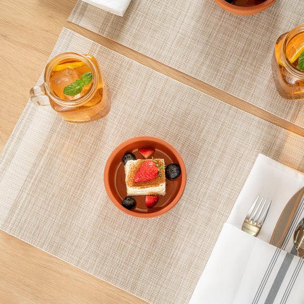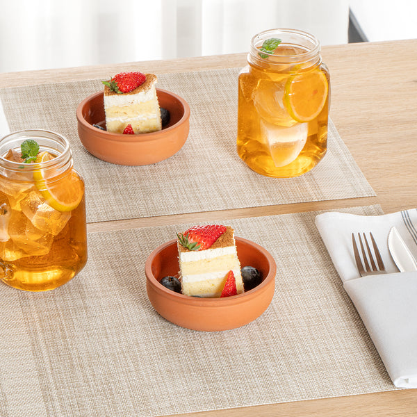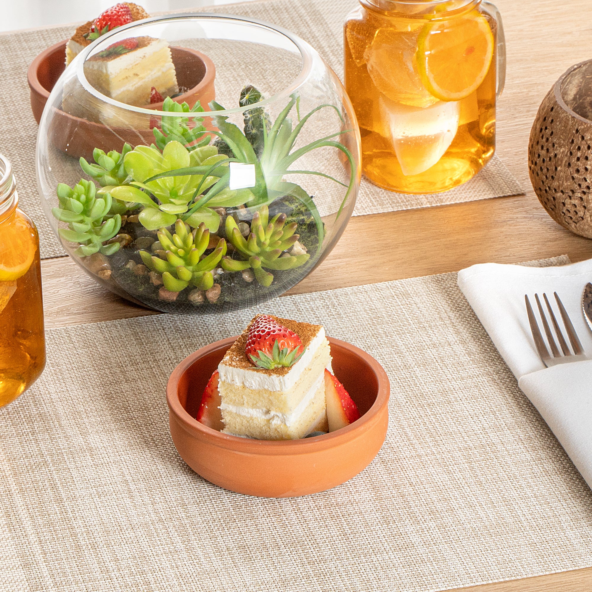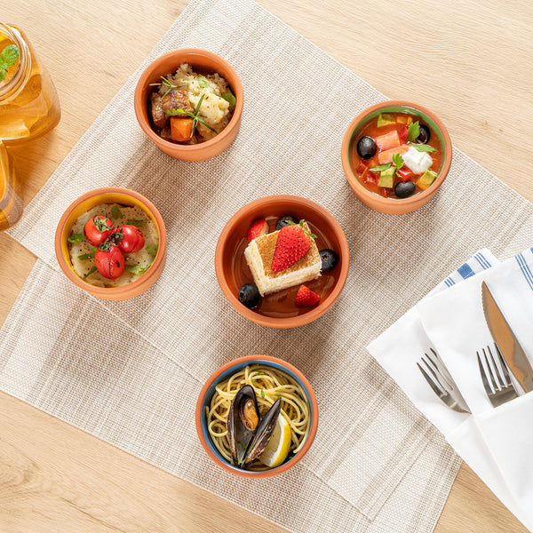 Create a memorable dining experience with our Terra Tek 7-ounce Terracotta Cazuela Bowls. Crafted from durable terracotta, these recyclable cazuela bowls are designed to withstand high temperatures and provide long-lasting use. The eye-catching blue glazed interior of these greaseproof glazed bowls adds a touch of elegance to your dishes while making them easy to clean. Oven-ready and microwavable, these cooking bowls are perfect for preparing and serving a variety of recipes without the need for multiple dishes. For added convenience, these microwave cooking bowls can also be stored in the freezer, ensuring your dishes maintain their freshness. For easy cleanup, these gourmet kitchen bowls can be conveniently placed in the dishwasher, simplifying after-dinner chores. With a 7-ounce capacity, these terracotta cazuelas can hold a generous portion of your culinary creations. Measuring 4.5 inches in diameter by 1.5 inches in height, these reusable bowls provide a compact yet stylish serving solution. Sold in a 2 count box.