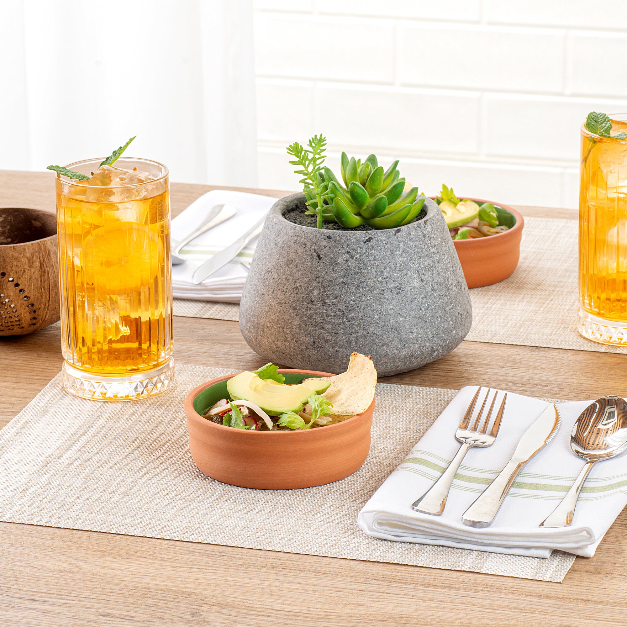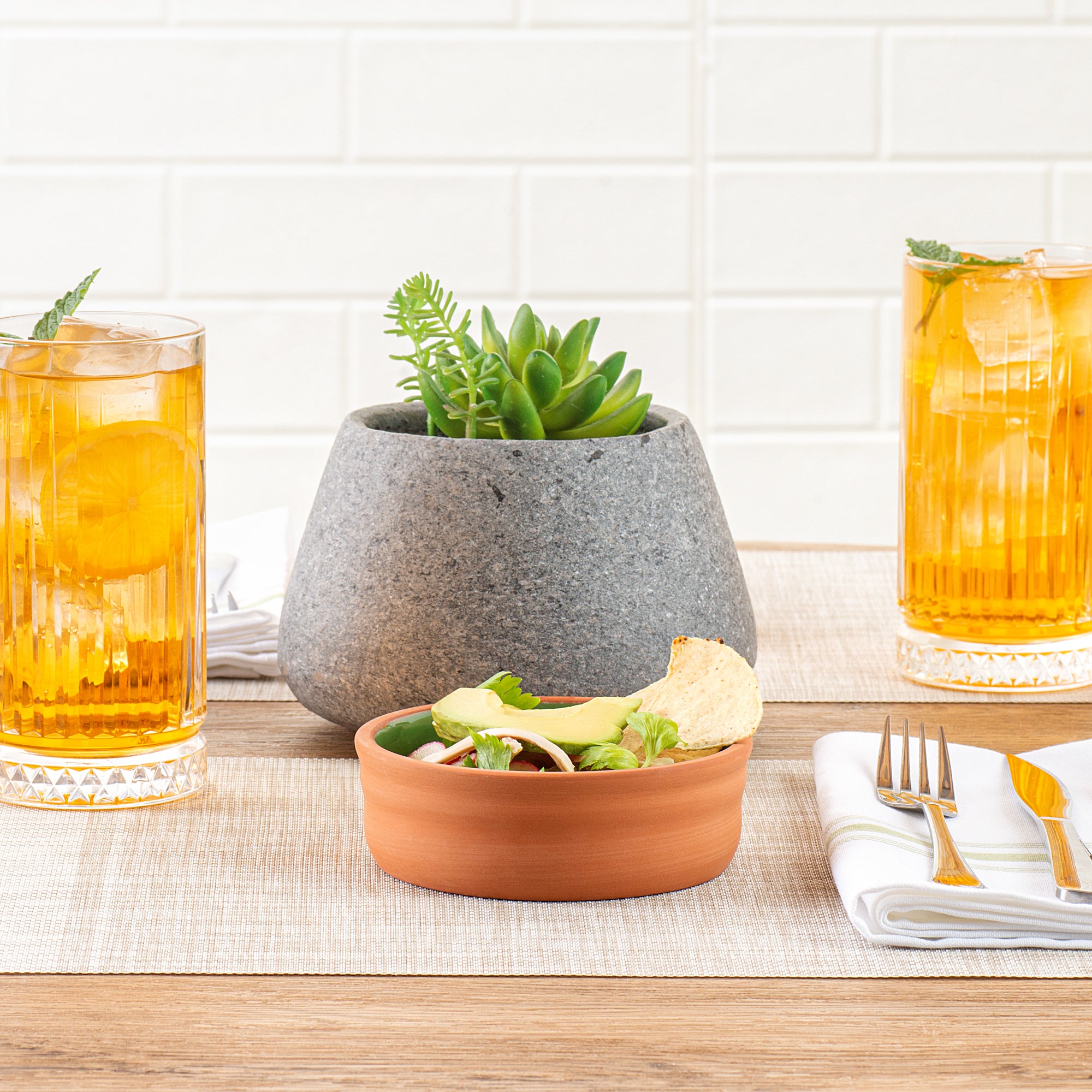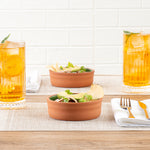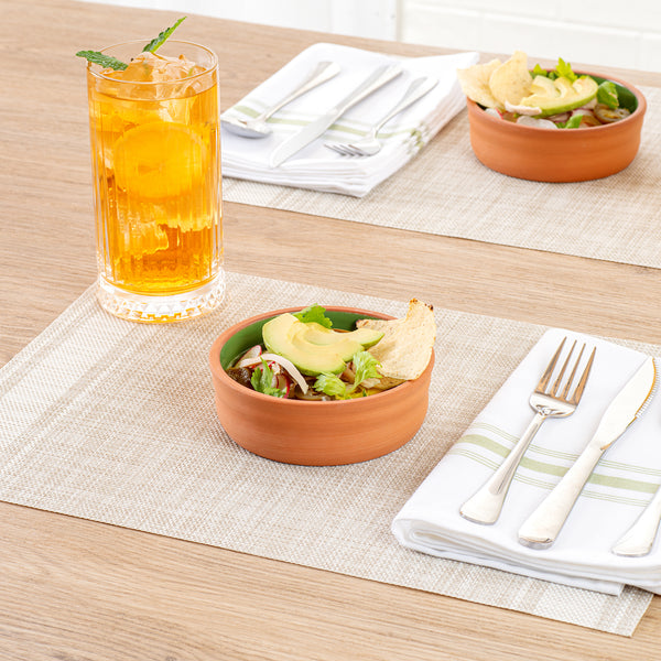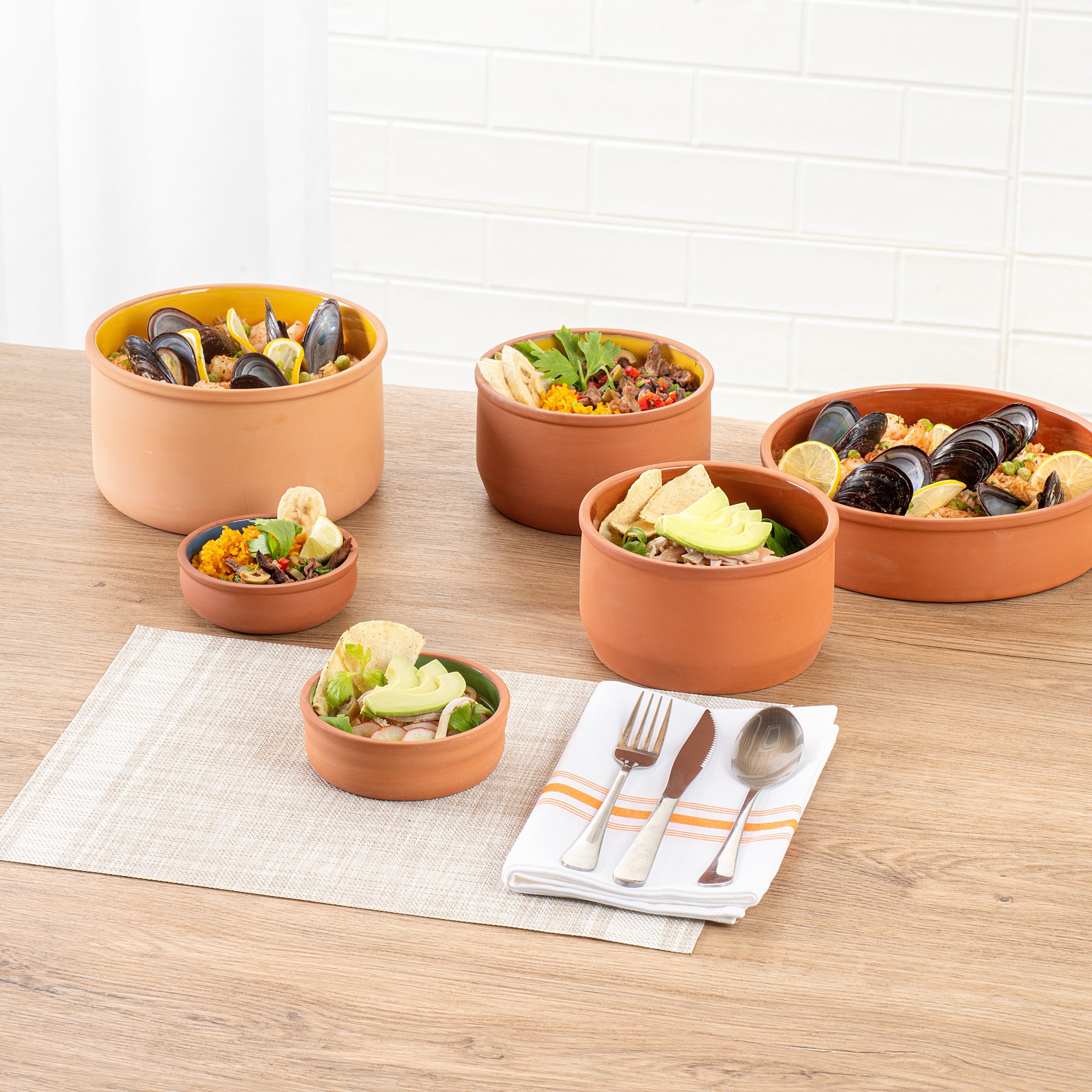 Experience royalty with our Terra Tek 7-ounce Terracotta Cazuela Bowls. Crafted from durable terracotta, these recyclable cazuela bowls are designed to withstand high temperatures, making them oven-ready for culinary creations. Enhance your gourmet kitchen bowls collection with the beautiful green glazed interior that adds a touch of elegance and ensures easy cleaning. These greaseproof glazed bowls are microwavable and simplify your cooking process, enabling quick and convenient meal preparations. To preserve your leftovers, these terracotta cazuelas are freezable and ideal for food storage. For easy post-meal cleanup, these reusable cooking bowls are dishwashable. Holding up to 7 ounces capacity and measuring 4.75 inches in diameter by 1.5 inches in height, these microwave cooking bowls hold the perfect portion size for tapas, appetizers, or desserts, fitting seamlessly into your kitchen storage. Sold in a 2 count box.