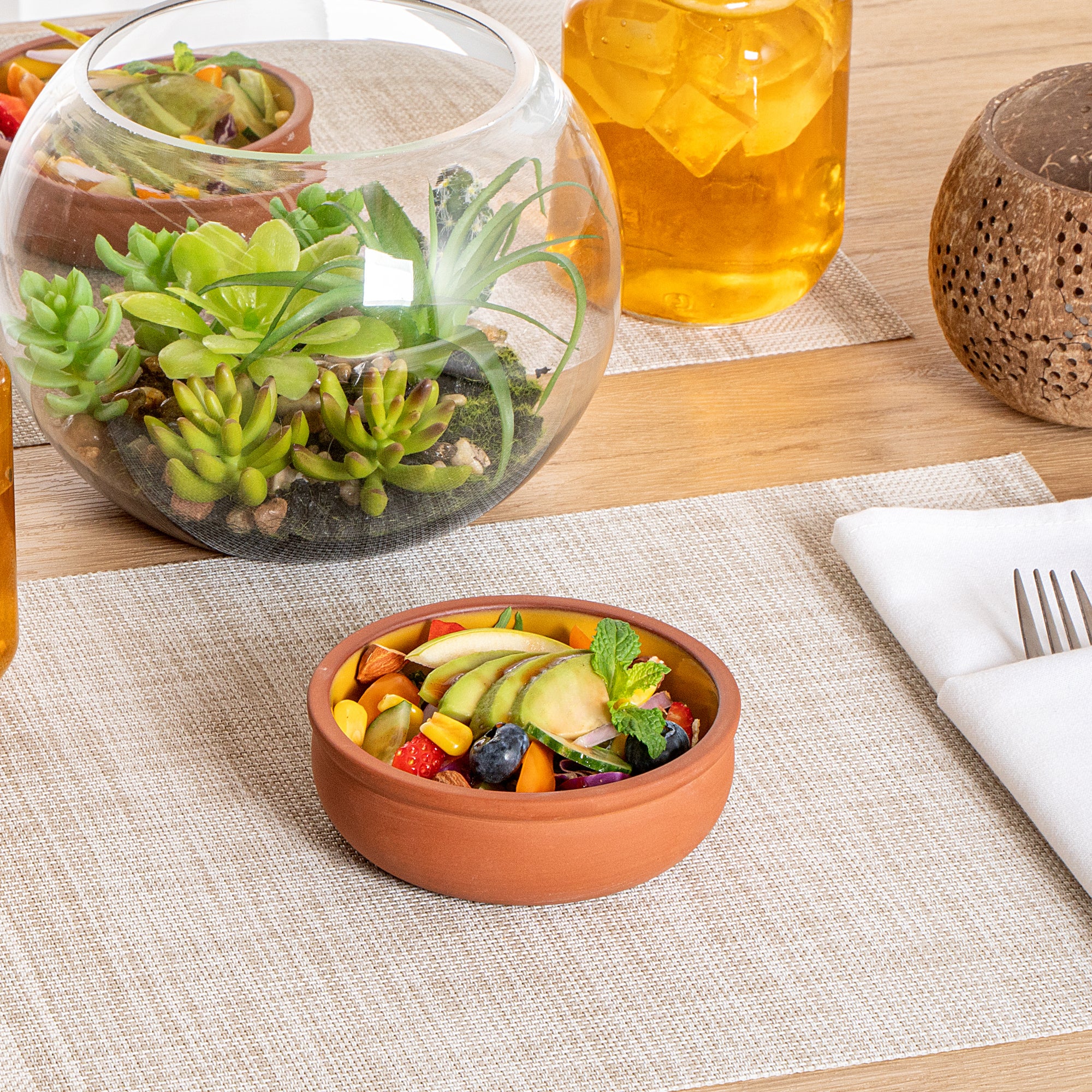 Unleash the culinary possibilities with our Terra Tek 7-ounce Terracotta Cazuela Bowls. These recyclable cazuela bowls are made from durable terracotta, ensuring longevity even in the busiest kitchens. With their striking yellow-glazed interior, these greaseproof glazed bowls effortlessly enhance the presentation of your food, making every dish a feast for the eyes. Perfect for various cooking methods, these terracotta cazuelas are oven-ready, making them an indispensable tool in any gourmet kitchen. For added convenience, these microwave cooking bowls are freezable and microwavable, minimizing prep time. Plus, these dishwashable cooking bowls minimize post-event cleanup. With a generous capacity of 7 ounces, these reusable cooking bowls are ideal for serving a variety of dishes. Measuring 4.5 inches in diameter by 1.5 inches in height, these terracotta cazuela bowls are compact yet spacious enough for a range of culinary creations. Sold in a 2 count box.
