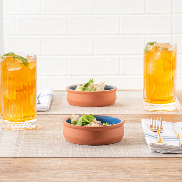Elevate your culinary presentations with vibrant, durable serving ware. The Terra Tek Glazed Interior Terracotta Bowl is designed with a rich blue glazed interior, enhancing meal presentation for dishes like pastas and salads. This terracotta bowl offers a 4.75-inch diameter and 8.5-ounce capacity, making it ideal for individual portions in tapas restaurants or casual dining settings. Its terracotta construction ensures excellent heat retention and durability, while its dishwashable design enables easy cleanup after a busy service. This cazuela dish is oven, microwave, and freezer safe, supporting a diverse range of menu items and operational needs. Whether serving traditional tapas or side dishes, this tapas bowl optimizes table space and adds rustic charm to any setting. Choose the Terra Tek Glazed Interior Terracotta Bowl to improve efficiency and presentation in your foodservice establishment. Each order includes 2 Terra Tek Glazed Interior Terracotta Bowls.