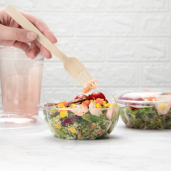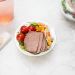 Serve up fresh and crisp salads in our Thermo Tek 12-ounce Clear Plastic Ergo Grip Bowl. Pair these clear plastic bowls with our coordinating clear lids (SKU: RWP0587C-50) to safely deliver meals to customers. Ideal for cafes and other foodservice establishments, these plastic disposable bowls are made from premium plastic and are conveniently recyclable for an eco-friendly clean up after use. These disposable bowls have a wide base that easily holds large amounts of food. Featuring a clear finish, these salad bowls provide full visibility for guests while upgrading food displays. These clear salad bowls are crack-resistant and leak-resistant to prevent messes and spills while on the go. Perfect for saving storage in your commercial kitchen, these plastic bowls are stackable. Measuring 4.75 inches in diameter by 1.8 inches in height, these disposable bowls hold up to 12 ounces. Shipped in a 50 count box. Lids are available and sold separately.