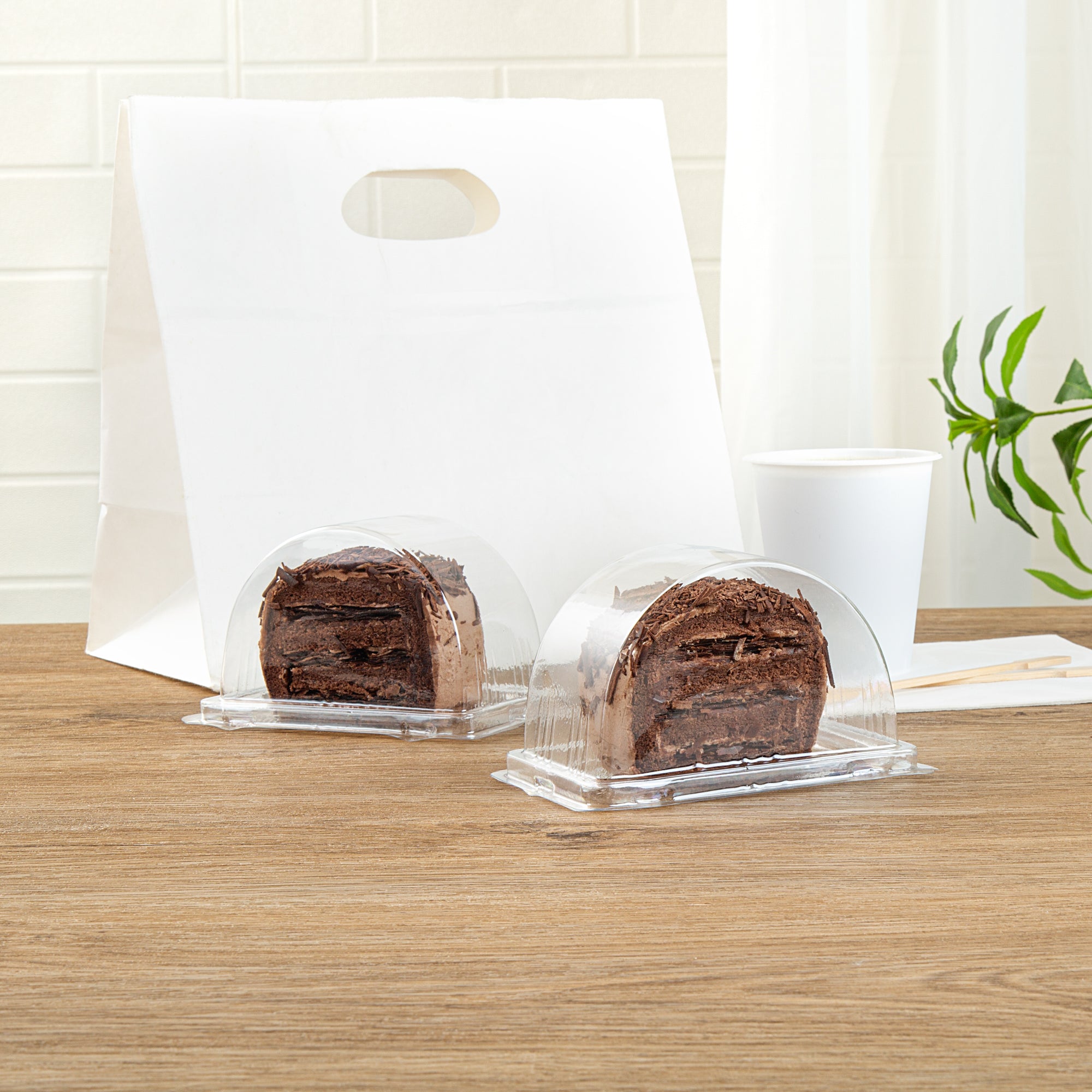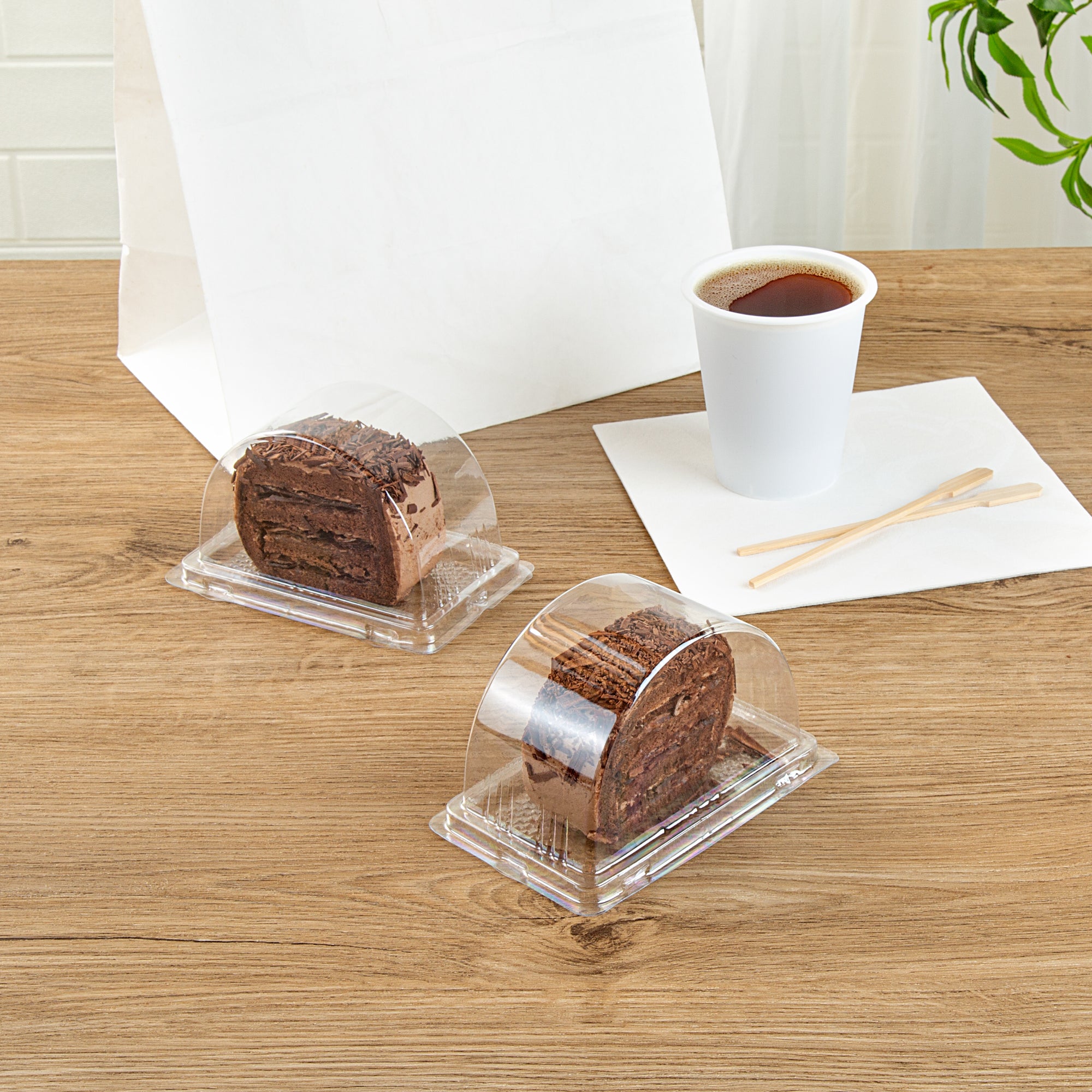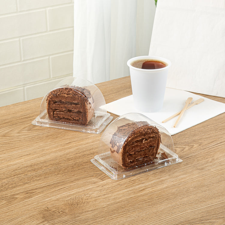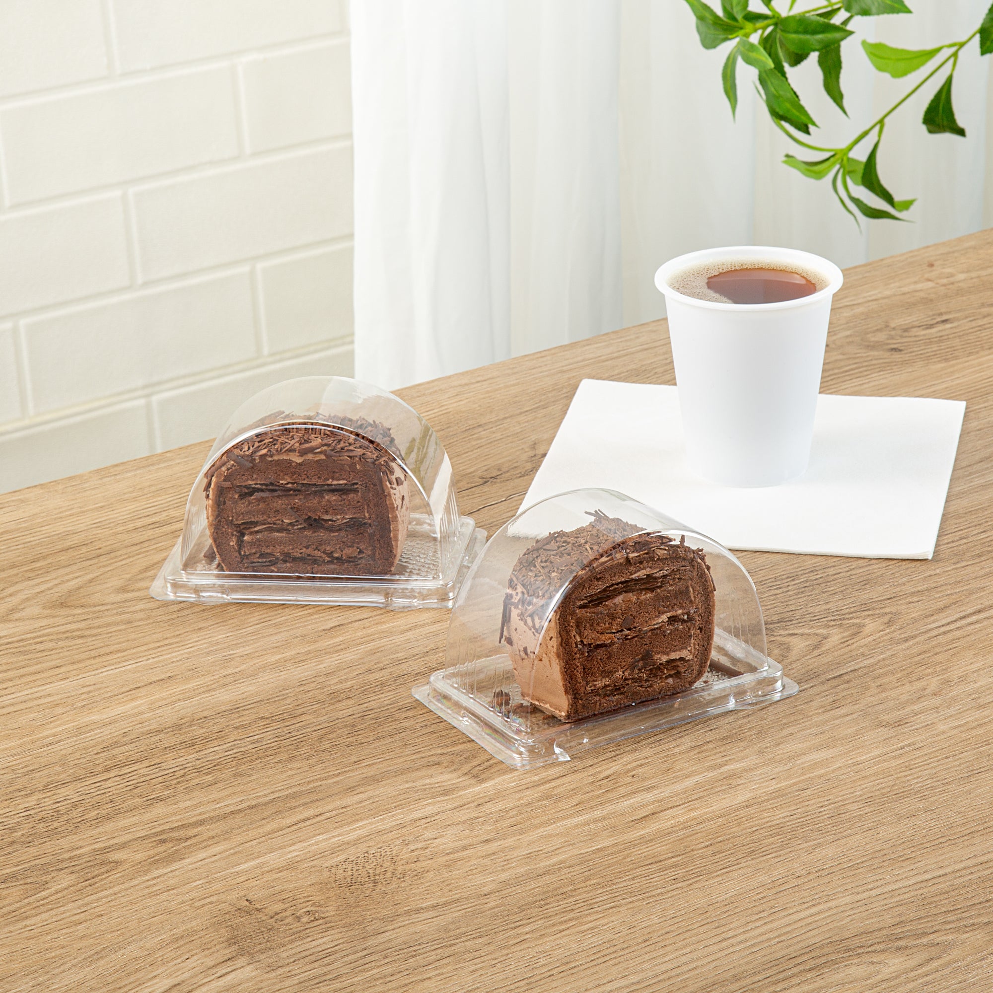 Stylishly package scrumptious desserts with our Thermo Tek Recyclable Swiss Roll Cake Box Semicircle with Lids. Featuring a crystal clear finish, these versatile cake boxes effortlessly showcase sweet treats served at your cafe, bakery, patisserie, and more. Constructed from high-quality plastic, these mini cupcake boxes are recyclable and durable. Use these recyclable food containers to beautifully present double chocolate brownies from your bakery, or to stylishly display blueberry muffins from your cafe. Sold with an accompanying lid, these clear food containers protect your delicious desserts and make it convenient to take them to go. These rectangular food containers measure 5.5 inches long by 3.5 inches wide and ship in a 100 count box.
