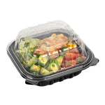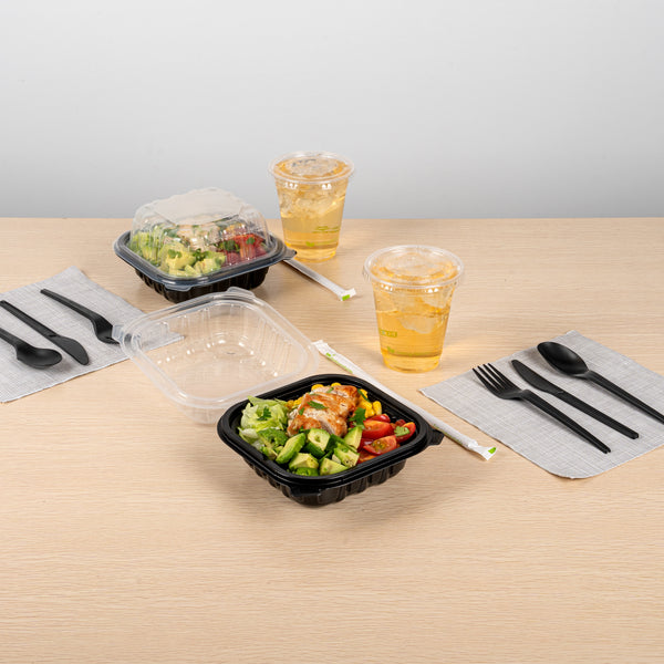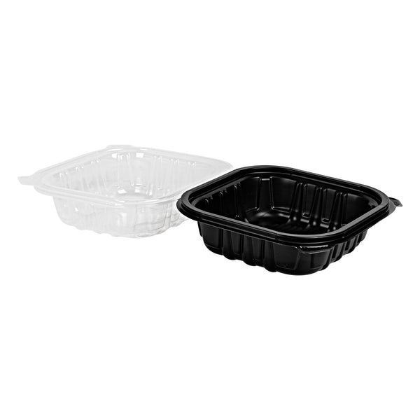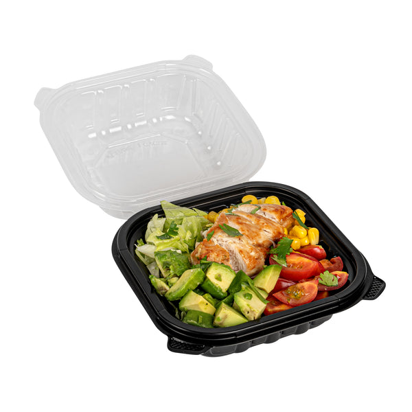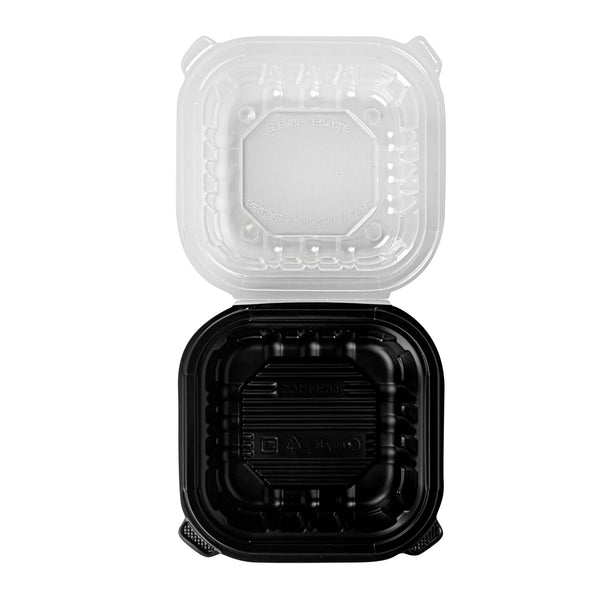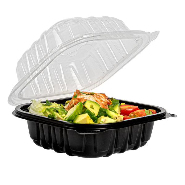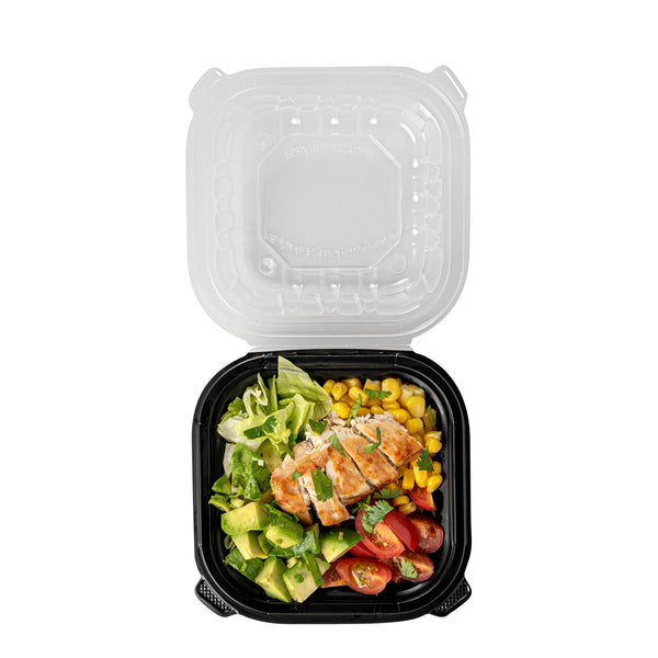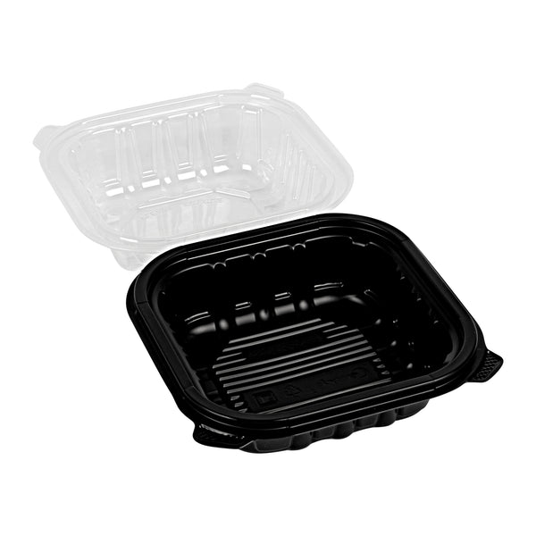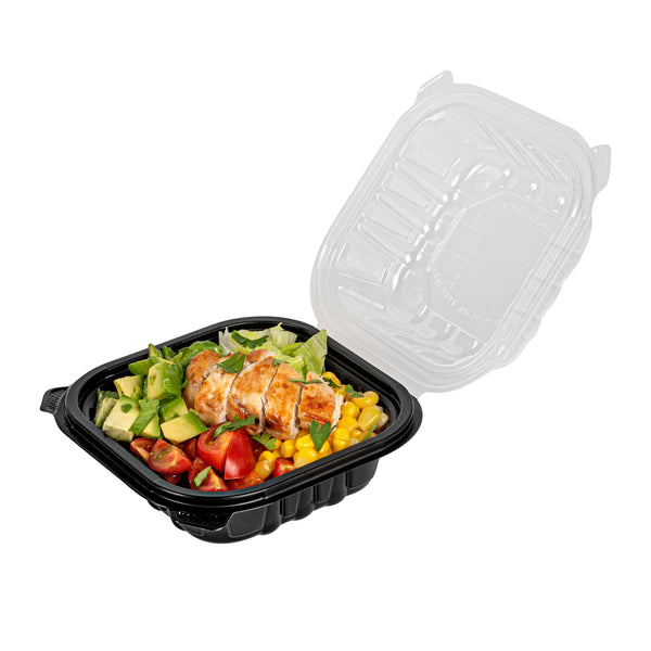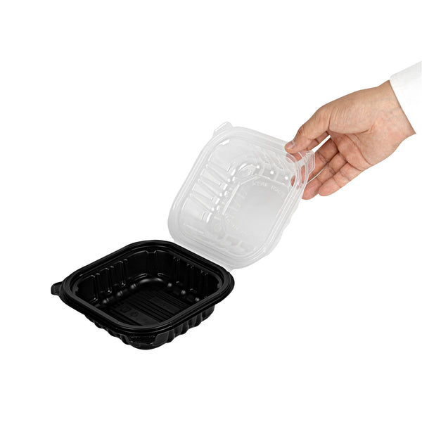 Elevate your food delivery service with our Thermo Tek 16-Ounce Black Plastic Clamshell Containers. Engineered for convenience, these take out containers are microwave-safe, allowing customers to reheat their food without transferring it to another dish. These clamshell containers are crafted from durable polypropylene and can withstand temperatures up to 248F. The sealed edge design of these takeaway boxes prevent spills and messes during transit. These take out boxes have built-in clear lids that provides a secure seal, offering a practical and portable solution for your to go needs. With a capacity of 16 ounces, these carry out containers provide ample space for pasta, sandwiches, salads, and hot dishes. The anti-fog ventilated lid of these to go boxes reduces condensation, keeping your food items looking fresh and appetizing. Disposable, these black food containers offer a convenient cleanup solution. These black plastic containers measure 6 inches in length by 6 inches by 3 inches in height and can hold up to 16 ounces. Sold in a 100 count box.