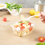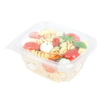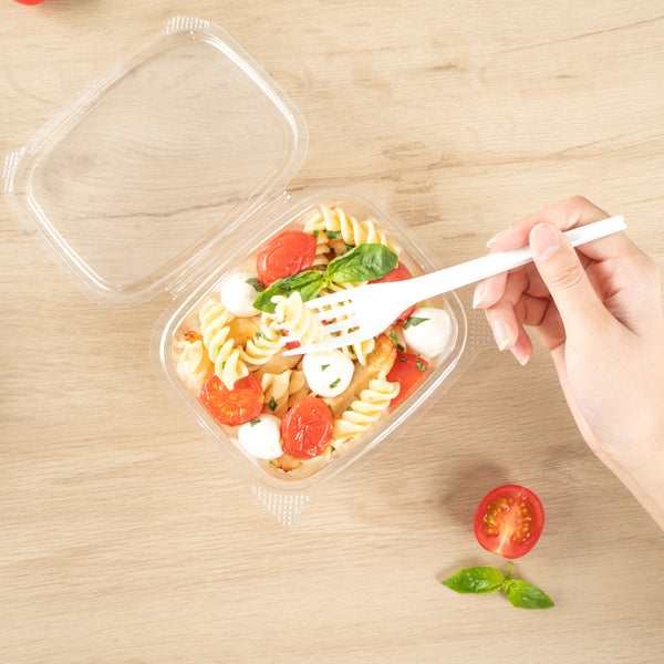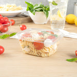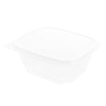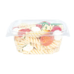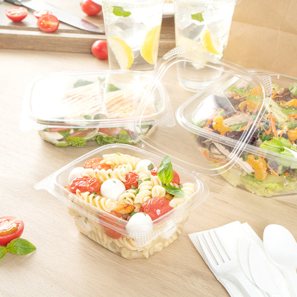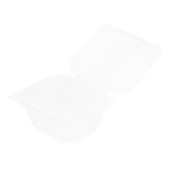 Keep delivery or take out orders protected using our Thermo Tek 16-ounce Rectangle Clear Plastic Deli / Snack Containers. These plastic deli containers are equipped with an anti-fog design to maintain full visibility of meals by avoiding condensation build-up. To easily take dishes to go, these plastic snack containers are constructed with hinged lids that create a tight-fitting seal. For storing prepped ingredients or pre-made grab-and-go items, these hinged plastic containers are freezable. With a transparent finish, these deli containers with lids offer a crystal-clear view of fare to quickly identify orders. These clear deli containers are made from durable PET plastic to reliably contain a variety of appetizers, entrees, or desserts. To reduce your establishment's carbon footprint, these deli food containers are recyclable. These clear deli containers can hold up to 16 ounces and measure 5.75 inches in length by 5 inches in width by 2.5 inches in height. Sold in a 100 count box.