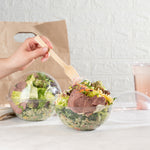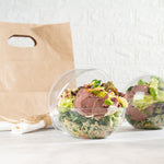 Easily keep meals fresh with our Thermo Tek 28-ounce Clear Plastic Sphere Salad Containers. The included dome lid of these to go containers creates a leak-resistant seal and provides ample space to top off of snacks with garnishes. With a stylish sphere shape, these carry out containers attract the attention of potential customers at your bakery, deli, food stand, or cafe. Designed with a clear finish, these salad lunch containers show off your delicious Greek, Thai, or Italian salads. Constructed from plastic, these food grade containers are recyclable to shorten your after-hour cleanup. Measuring 6.5 inches in diameter by 5.5 inches in height, these plastic to go containers hold up 28 ounces. Sold in a 50 count box.
