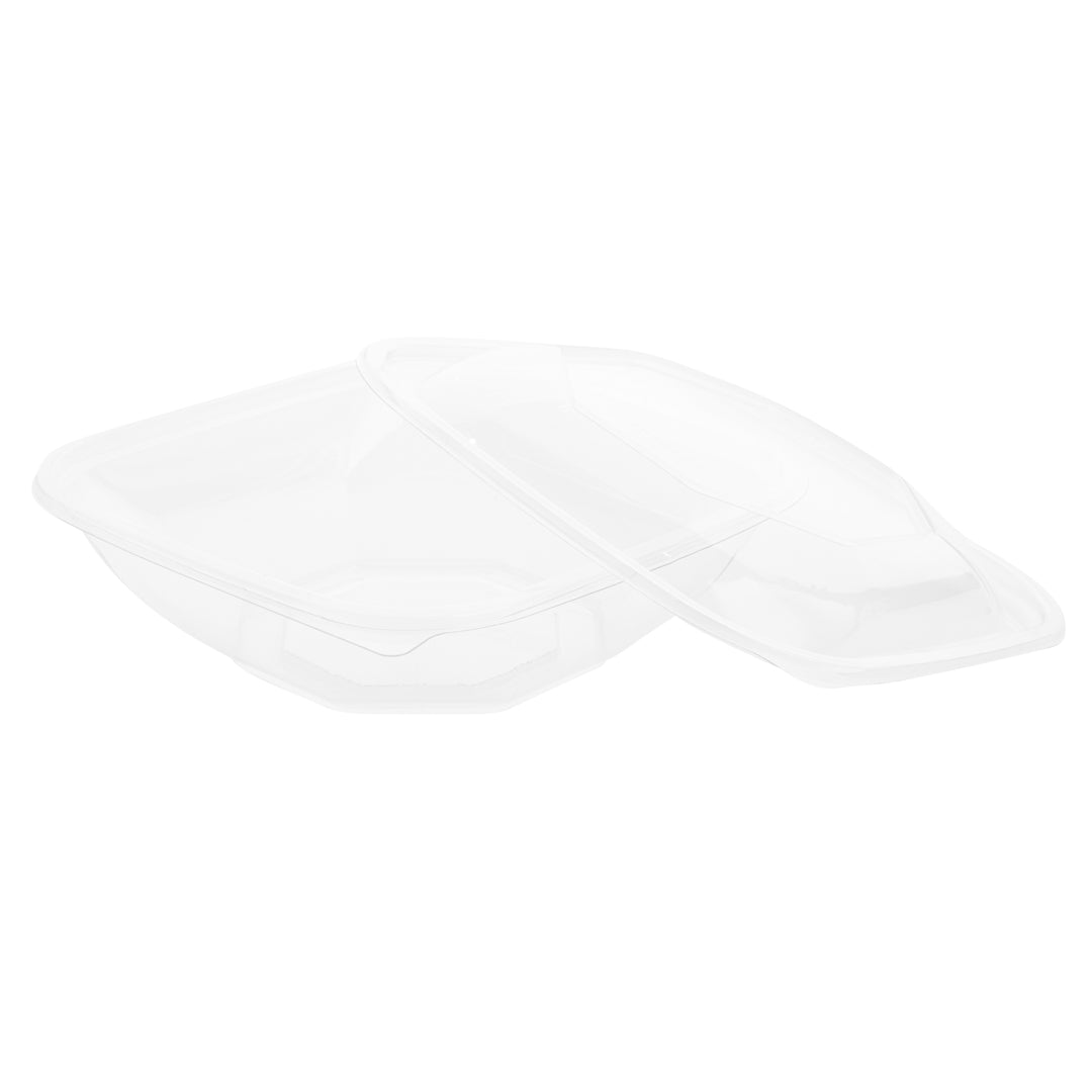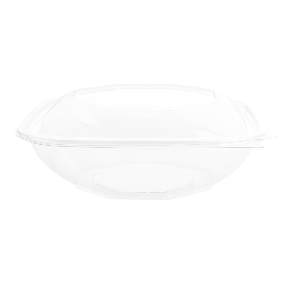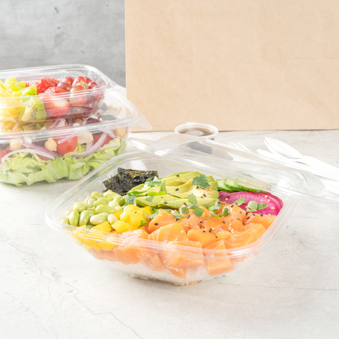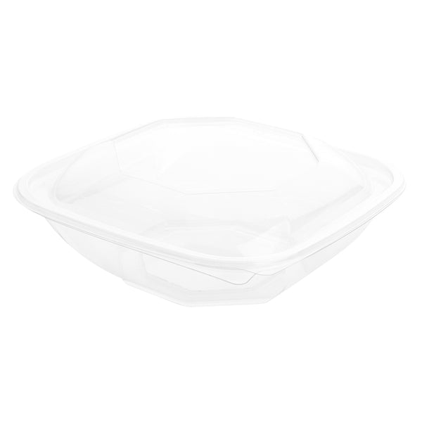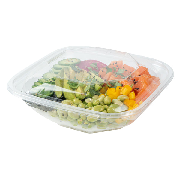 Easily serve take out orders with our Thermo Tek 34-ounce Square Clear Plastic Take Out Salad Bowls. These anti-fog plastic bowls keep condensation from building up and limiting the visibility of packaged meals. To easily transport delivery or carry out orders, these square food containers include compatible, tight-fitting lids. These plastic salad bowls with lids are designed with a transparent finish to quickly identify customers' orders and avoid meal mixups. These freezable to go food containers are crafted from PET plastic to reliably contain a variety of dishes without the worry of spills. For quick and easy cleanup, these take out food bowls are recyclable. With a total capacity of 34 ounces, these salad bowls measure 7.5 inches in diameter by 3 inches in height. Sold in a 100 count box.