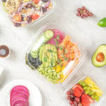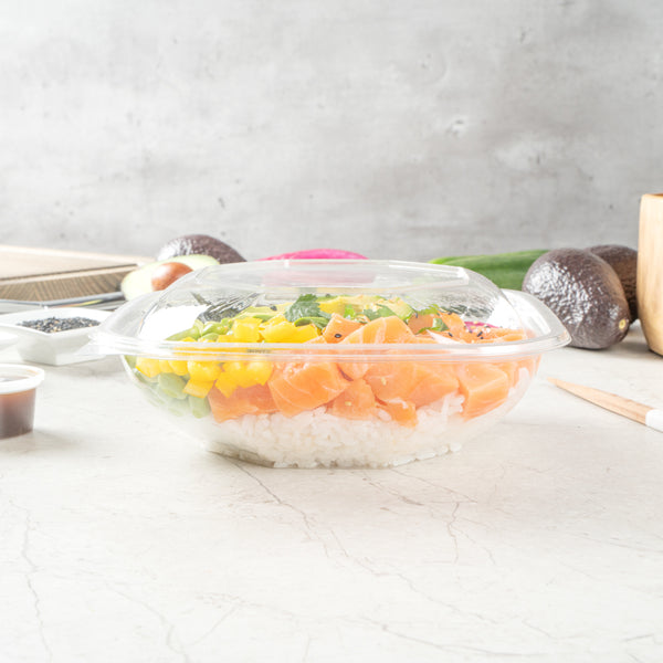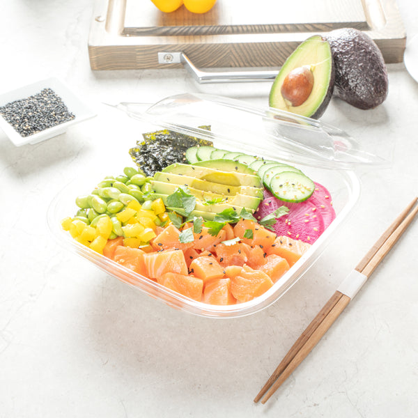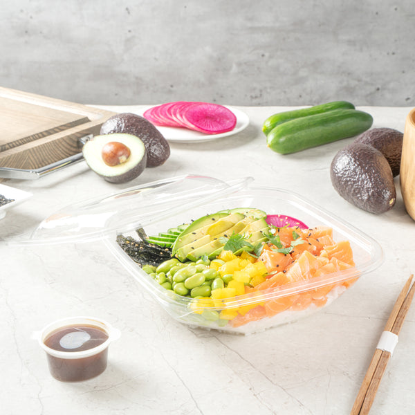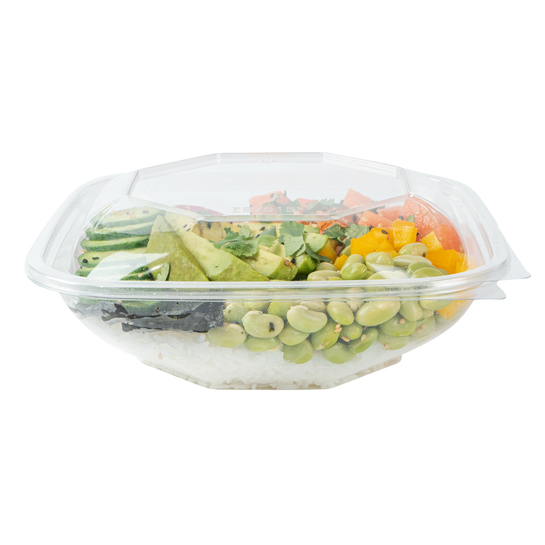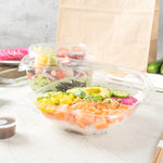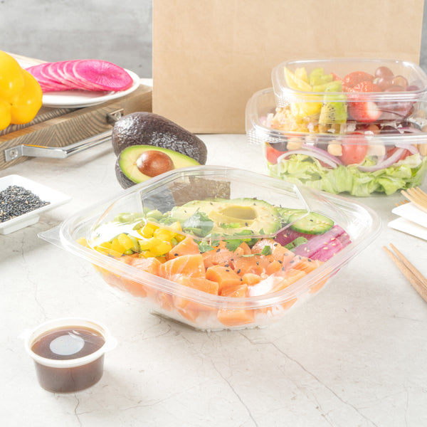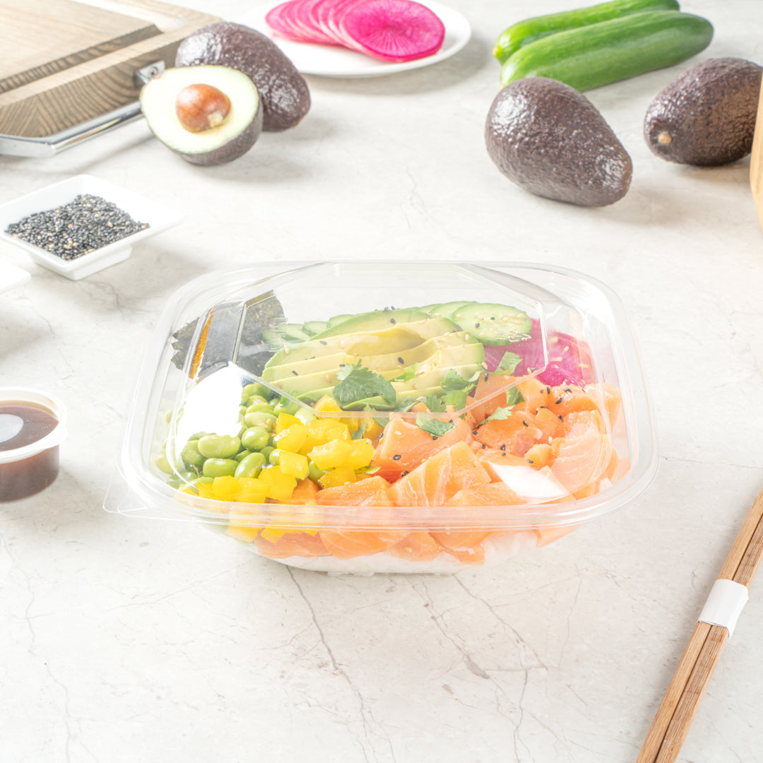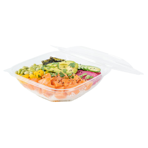 Easily serve take out orders with our Thermo Tek 34-ounce Square Clear Plastic Take Out Salad Bowls. These anti-fog plastic bowls keep condensation from building up and limiting the visibility of packaged meals. To easily transport delivery or carry out orders, these square food containers include compatible, tight-fitting lids. These plastic salad bowls with lids are designed with a transparent finish to quickly identify customers' orders and avoid meal mixups. These freezable to go food containers are crafted from PET plastic to reliably contain a variety of dishes without the worry of spills. For quick and easy cleanup, these take out food bowls are recyclable. With a total capacity of 34 ounces, these salad bowls measure 7.5 inches in diameter by 3 inches in height. Sold in a 100 count box.