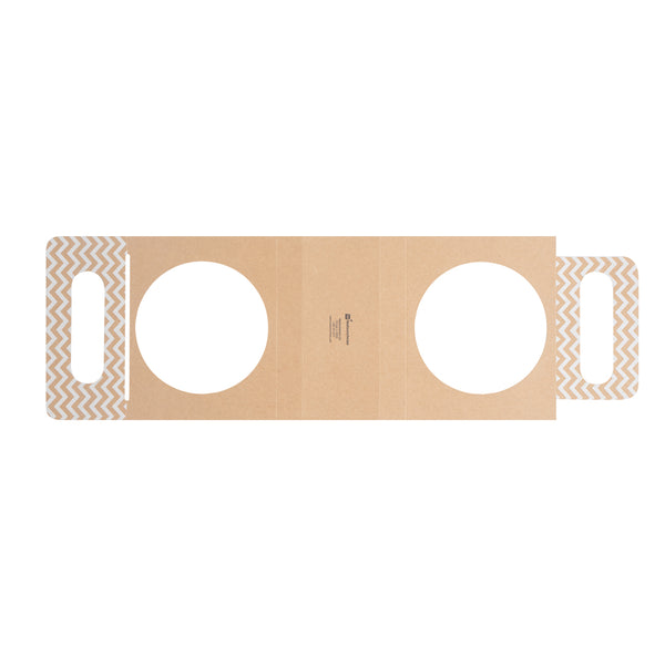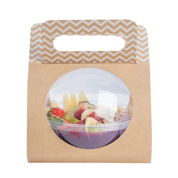 Carry around to go salads and rice bowls using our Thermo Tek Kraft Paper Sphere Salad Container Carriers. Match these sphere container carriers with our compatible Thermo Tek sphere containers to allow customers a way to carry their meals while on the go (SKU: RWP0573C). These food carriers are crafted from high quality kraft paper to effortlessly withstand the weight of hefty meals. Designed with a kraft finish and a white chevron pattern on the handle, these food container carriers provide a rustic and chic look to impress your customers. For space-saving storage in your establishment, these paper food carriers are shipped flat. To reduce your restaurant's carbon footprint, these salad container carriers are recyclable and biodegradable. These food container carriers measure 18.7 inches in length by 5.9 inches in width. Sold in a 50 count box. This item will only degrade outside of the traditional solid waste stream. Compatible containers are available and sold separately.