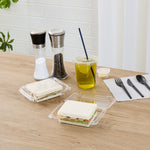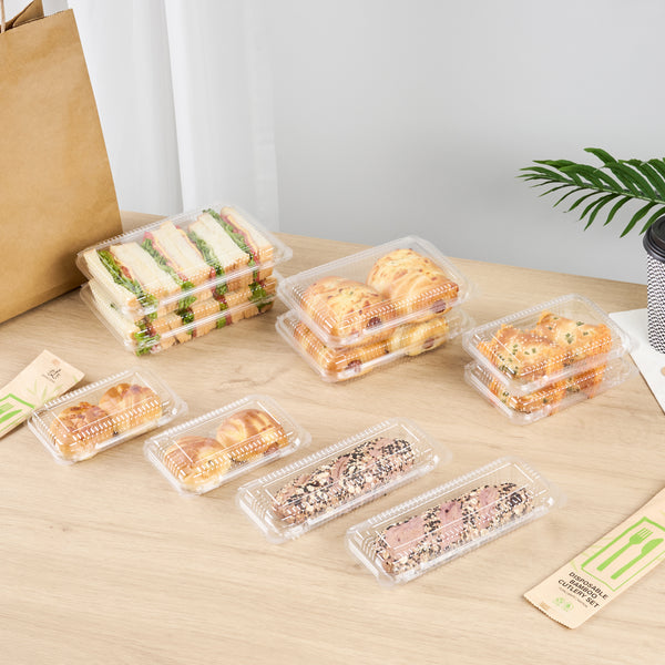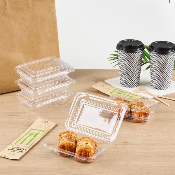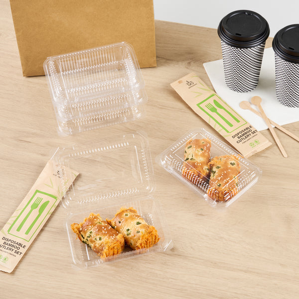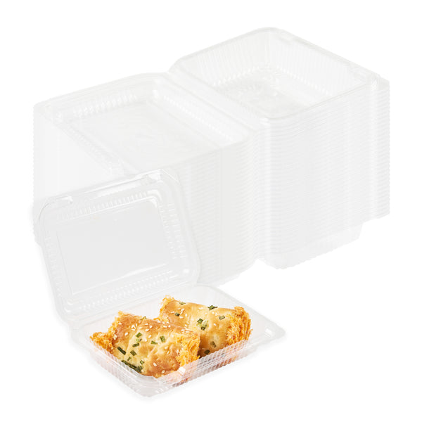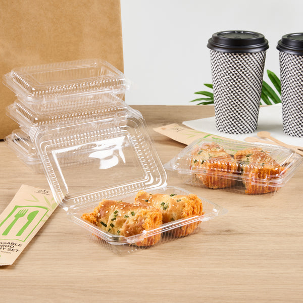 Enhance your takeout offerings with secure and stylish packaging. The Thermo Tek Clamshell Closure Plastic Clamshell Container, featuring a clamshell design, ensures impeccable food presentation while maintaining the freshness of pastries and meals. Made from durable PET plastic, this plastic clamshell container withstands the demands of busy foodservice environments without cracking or compromising food integrity. Its clear plastic construction allows for easy identification of contents, reducing order errors and enhancing presentation—a perfect choice for cafes and delis needing a clear deli container. With dimensions of 6.3 inches by 4.33 inches by 1.38 inches, this compact container is ideal for single-serving portions, optimizing storage and portion control. The BPA-free plastic supports healthier, sustainable practices, making it an eco-friendly disposable sandwich container for conscientious establishments. Elevate your service efficiency and appeal with this reliable solution for takeout needs. Each order includes 100 Thermo Tek Clamshell Closure Plastic Clamshell Containers.
