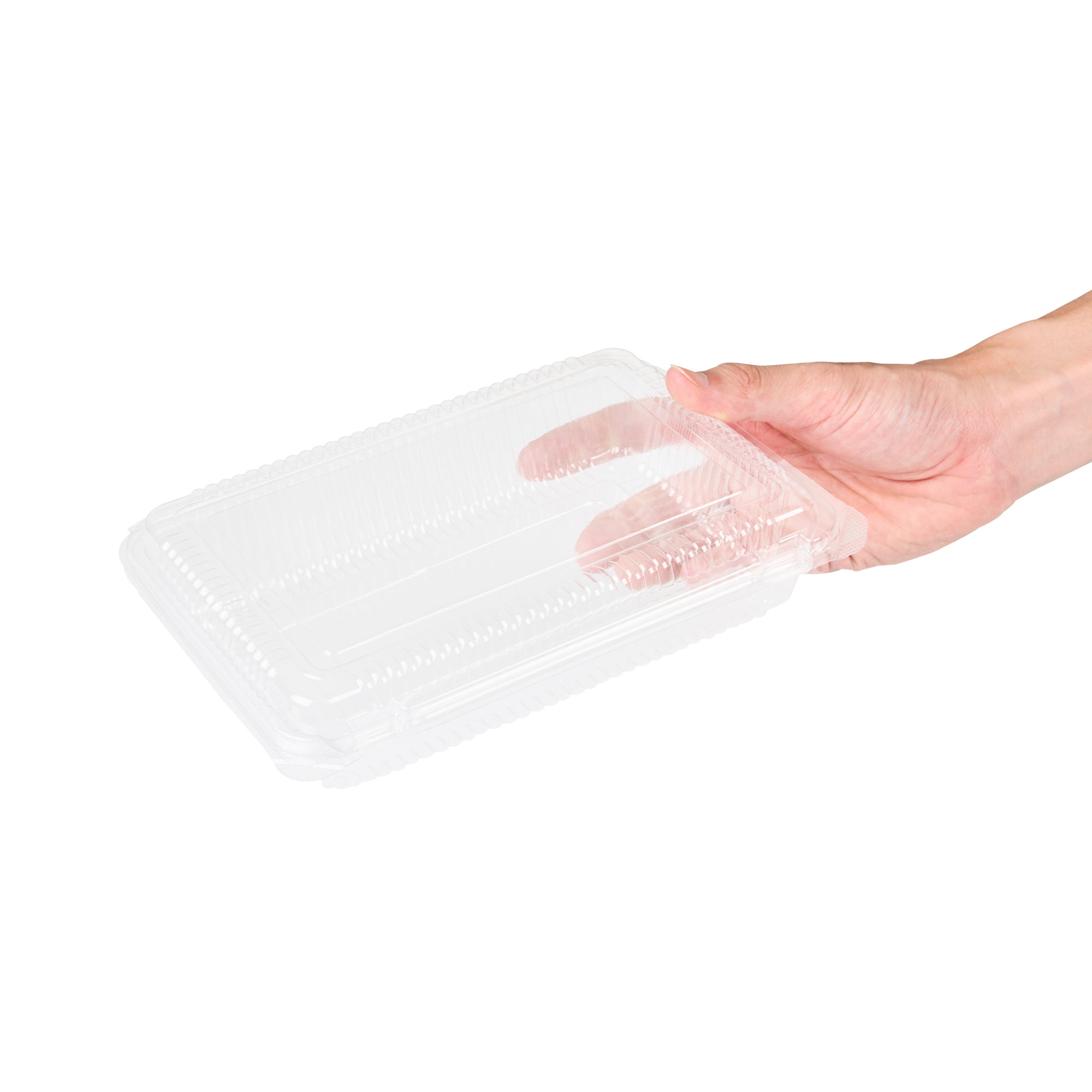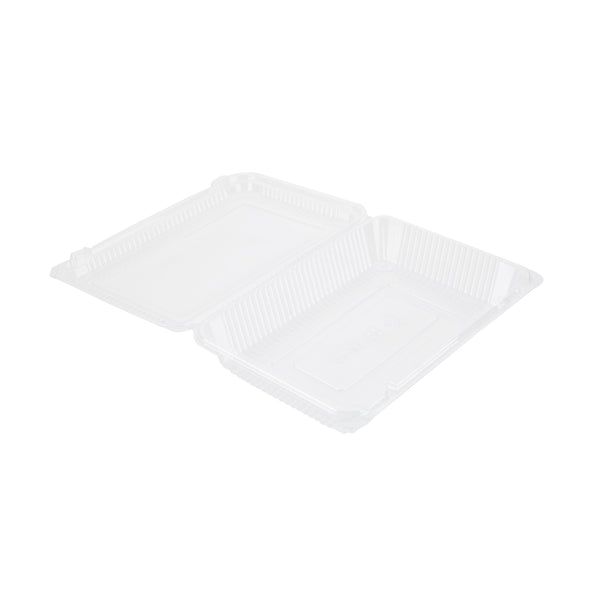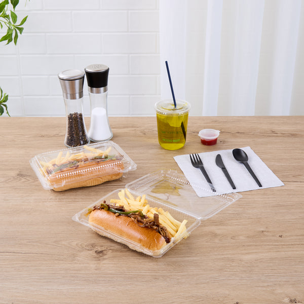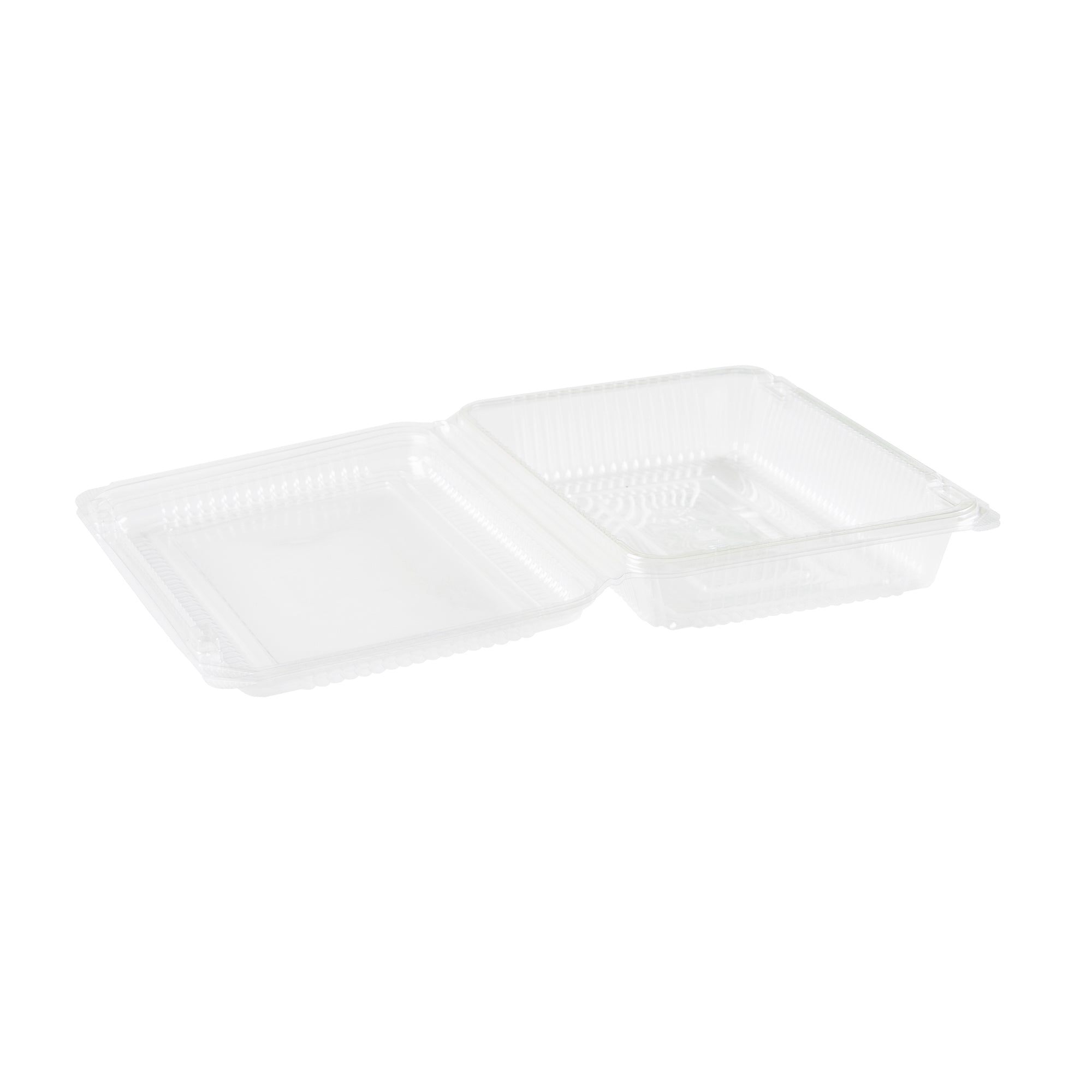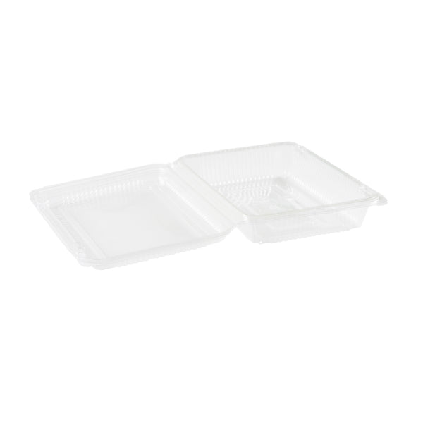 Keep your food fresh and secure with reliable packaging. The Thermo Tek Clamshell Clear Plastic Takeout Container is designed with a clamshell structure that ensures the freshness of your snacks and meals, catering to the operational needs of busy kitchens. Featuring a clear plastic construction, this plastic clamshell container enhances food presentation by allowing full visibility of contents, making it easier for customers to identify their orders. Crafted from durable PET plastic, it withstands the fast-paced demands of foodservice environments, reducing the risk of container damage during takeout and delivery. The BPA-free plastic supports healthier, sustainable operations, aligning with eco-conscious practices while ensuring food safety. With dimensions of 8.25 inches in length, 5.75 inches in width, and 1.75 inches in height, this disposable food container is versatile enough for a variety of entrees and desserts. Enhance your takeout service efficiency and maintain food presentation integrity with these containers. Each order includes 100 Thermo Tek Clamshell Clear Plastic Takeout Containers.