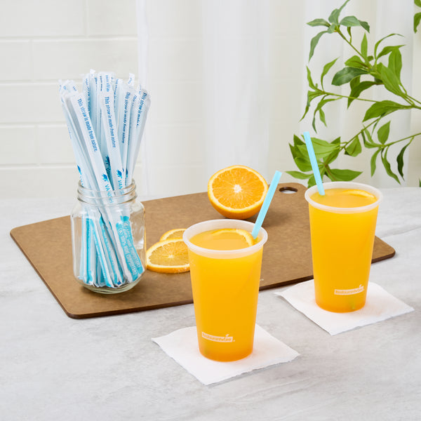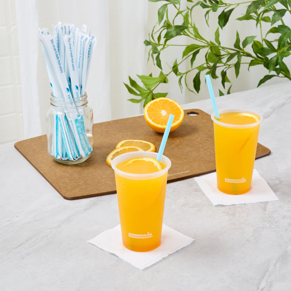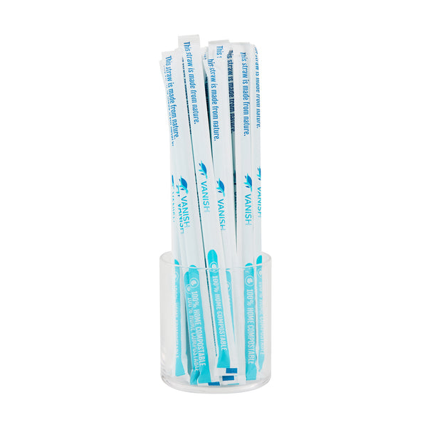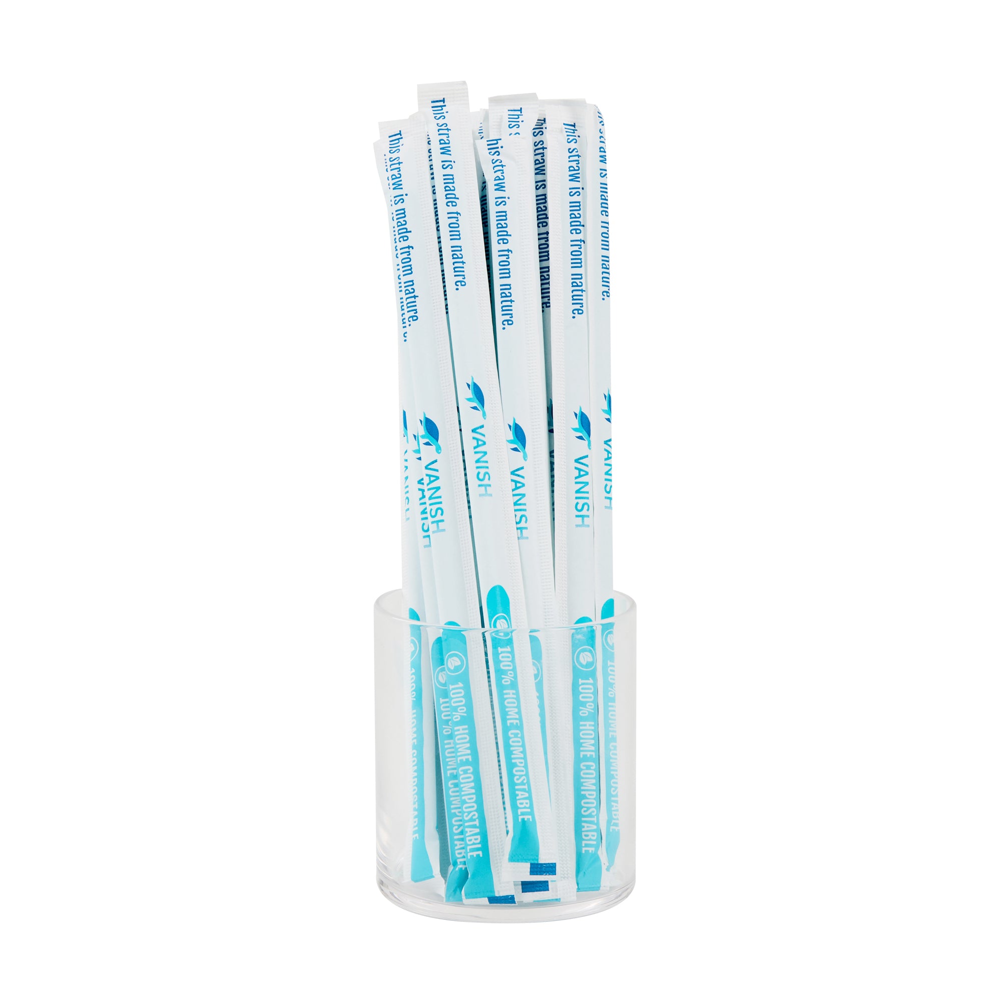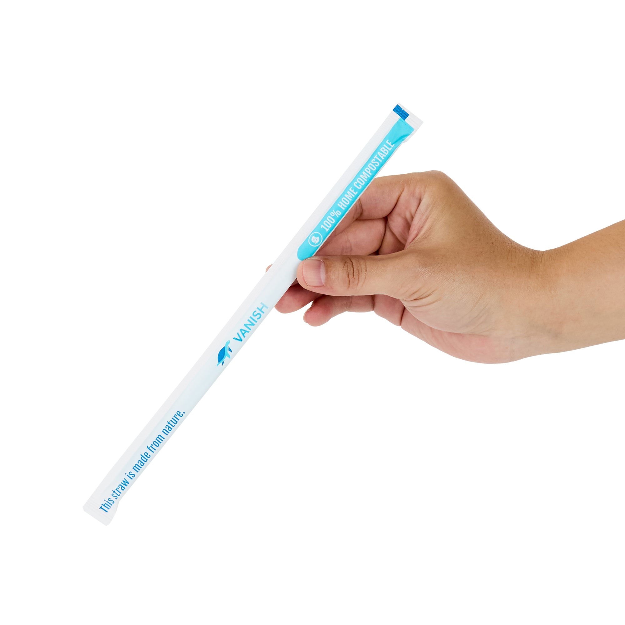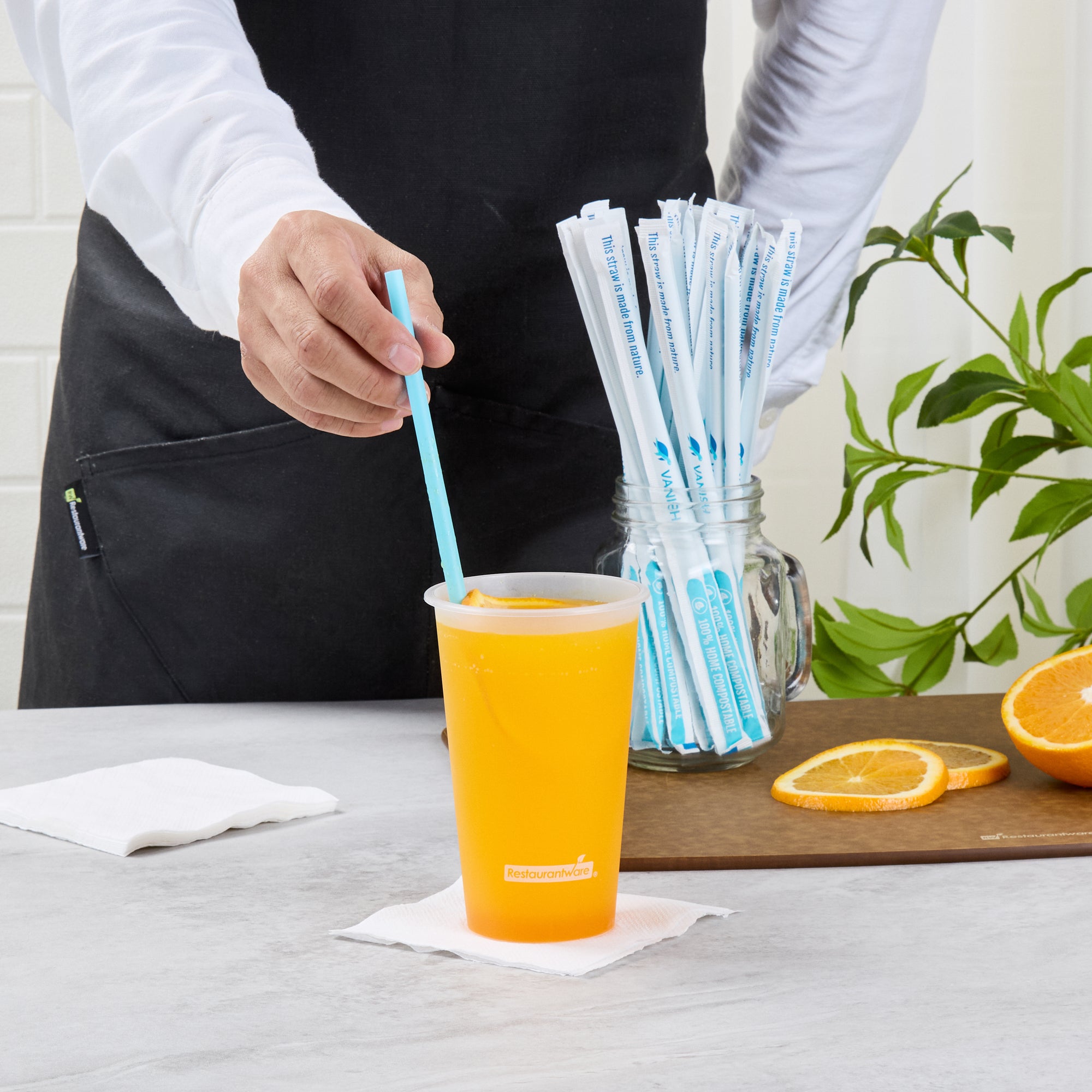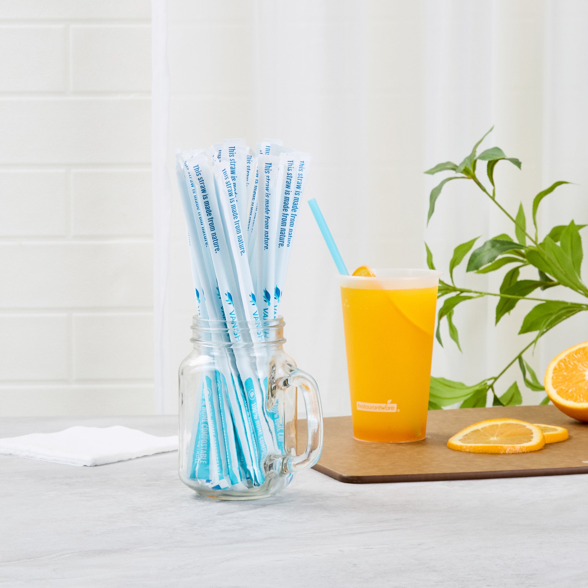 Enhance your beverage service with eco-friendly options. Vanish Compostable Biodegradable Straws offer a sustainable alternative to traditional plastic, crafted from home compostable PHA plastic to significantly reduce environmental impact. These individually wrapped straws ensure maximum hygiene, making them ideal for takeout and delivery services, while their vibrant blue color adds visual appeal to any drink presentation. With a standard length of 8.27 inches and a 7 mm width, these smoothie straws are perfectly suited for effortlessly sipping everything from refreshing soft drinks to thick smoothies. Their sturdy construction resists bending, providing a reliable drinking experience. Elevate your establishment’s sustainability goals with these compostable straws, perfect for quick-service restaurants, cafés, and catering events. Each order includes 100 Vanish Compostable Biodegradable Straws.