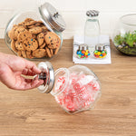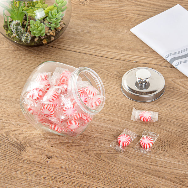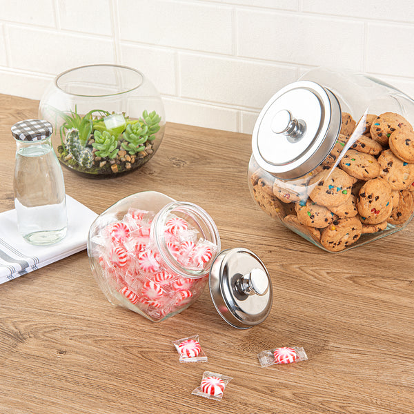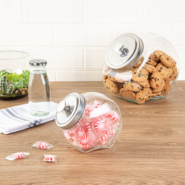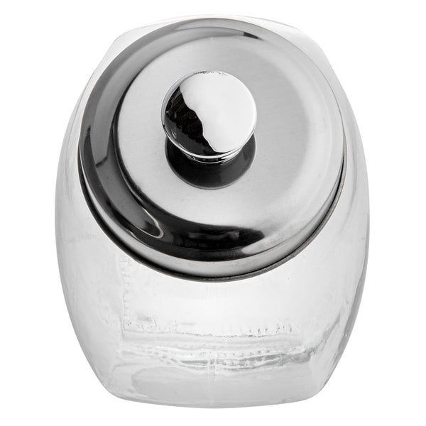 Add the perfect blend of sophistication and utility with our Vetri 0.3-gallon Glass Penny Jar. Made from premium glass, this penny jar is built to last and withstand daily use, ensuring your contents are secure. The sleek, chrome-plated lid of this glass penny jar adds a touch of sophistication to your kitchen decor while offering an airtight seal to keep your contents fresh. Effortlessly access your stored items with the candy jar's wide opening, perfect for scooping out candies or cookies with ease. Showcase your favorite items in style with this transparent glass jar, making it an eye-catching centerpiece on your kitchen counter. Cleanup is a breeze with this cookie jar, as it is secure to be placed in the dishwasher for effortless maintenance. With a generous 0.3-gallon capacity, this transparent candy jar is ideal for storing a variety of items, from candies to coins and everything in between. Measuring 3.54 inches in diameter by 6.3 inches in height, this cookie jar for a kitchen counter is the perfect size for countertop display and storage. Sold in a 1 count box.