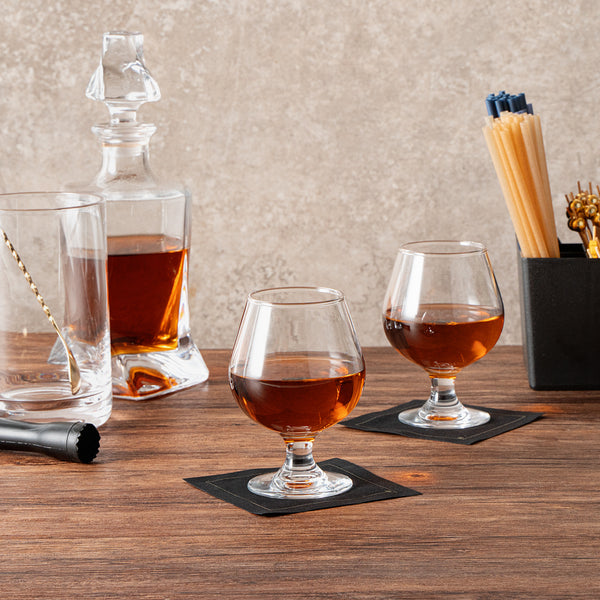 Enhance your beverage presentation with our Vetri 9-ounce Brandy Snifter Glasses. These snifter glasses feature a wide bowl that tapers significantly toward the top, maximizing flavor and aroma. Featuring smooth lines and curves, these bourbon glasses complement even the most upscale dining establishments. With unparalleled brilliance and clarity, these scotch glasses showcase your coveted spirits in the best light. Perfect for samples and tasting spirits, these whiskey tasting glasses help control portions of drinks at your bar. The thick stem of these whiskey glasses provides a comfortable and stable grip, enhancing your drinking experience. These 9-ounce glasses have a sturdy foot for added stability and minimize the risk of toppling over to avoid potential spills. Crafted from durable lead-free soda lime glass, these clear glasses withstand regular use while maintaining their pristine appearance. For added convenience, these tasting glasses are dishwasher-safe and facilitate a straightforward cleaning experience. Measuring 2.36 inches in diameter by 4.53 inches in height, these brandy glasses have a capacity of 9 ounces. Sold in a 24 count box.