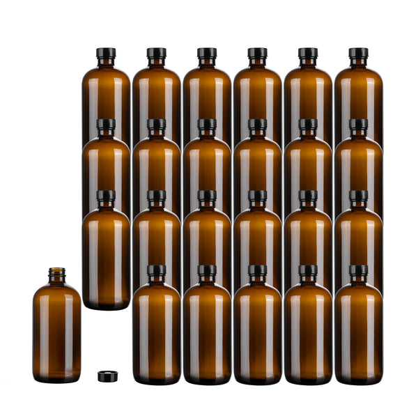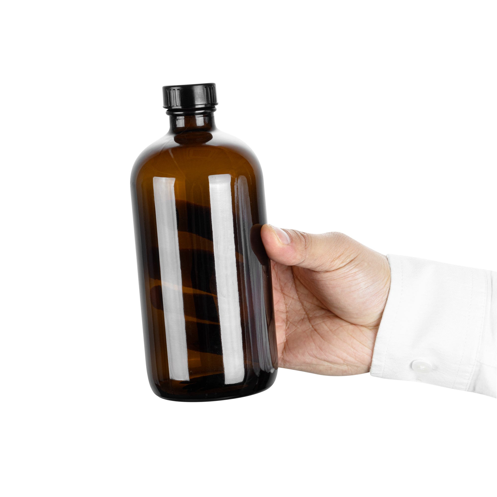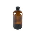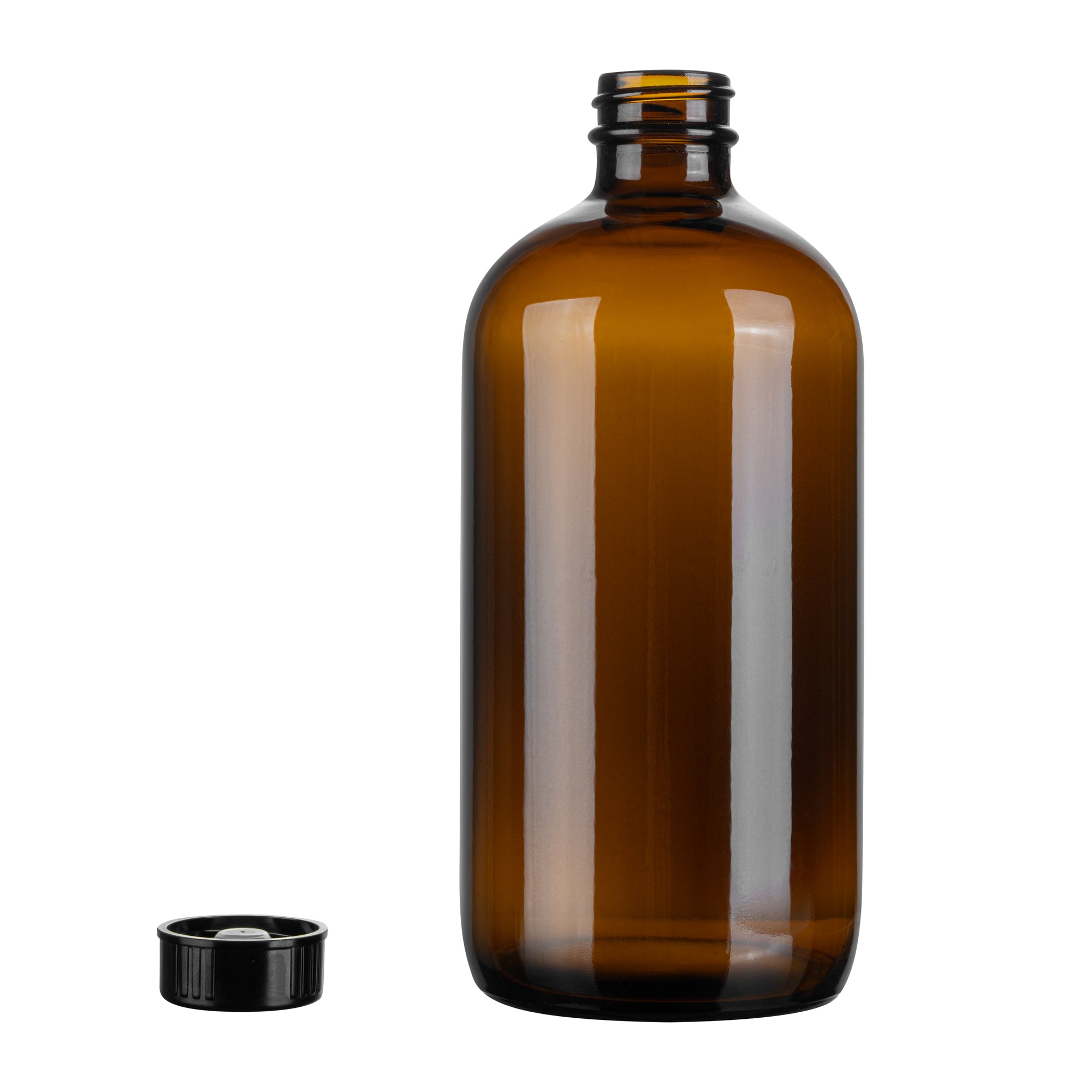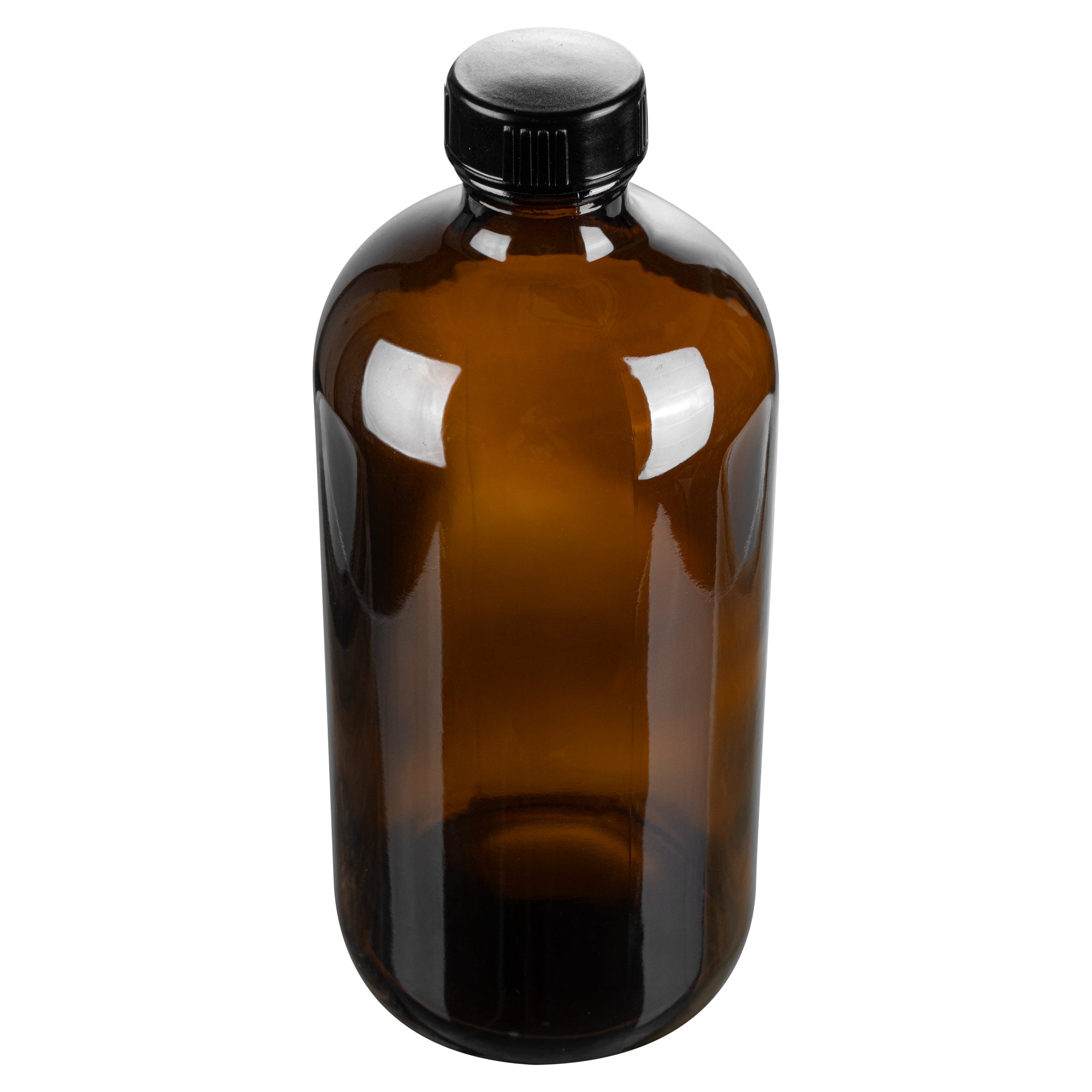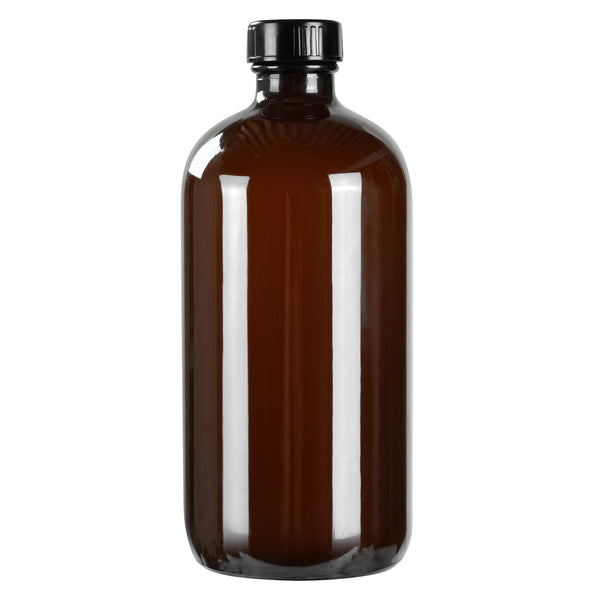 16 OZ BOSTON ROUND AMBER GLASS BOTTLE - WITH BLACK PHENOLIC CAP
