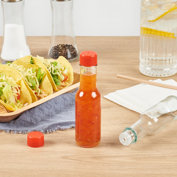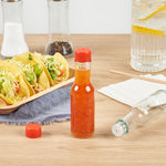 Enhance your food presentation with our Vetri 3-ounce Glass Woozy Bottles, ideal for showcasing sauces and dressings. These glass sauce bottles come with red caps that form a secure seal, keeping your contents protected. Featuring a traditional long neck and wide base, these glass bottles are perfect for pouring and transporting your culinary creations. The crystal-clear finish of these small glass bottles allows for excellent visibility of the contents, making them perfect for display. Crafted from durable lead-free soda lime glass, these sauce bottles withstand regular use while maintaining their pristine appearance. These hot sauce bottles are dishwasher-safe and facilitate a straightforward cleaning experience. With a capacity of 3 ounces, these clear glass bottles measure 1.58 inches in length by 1.58 inches in width by 5.91 inches in height. Sold in a 10 count box.