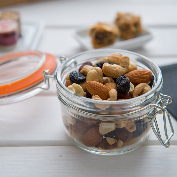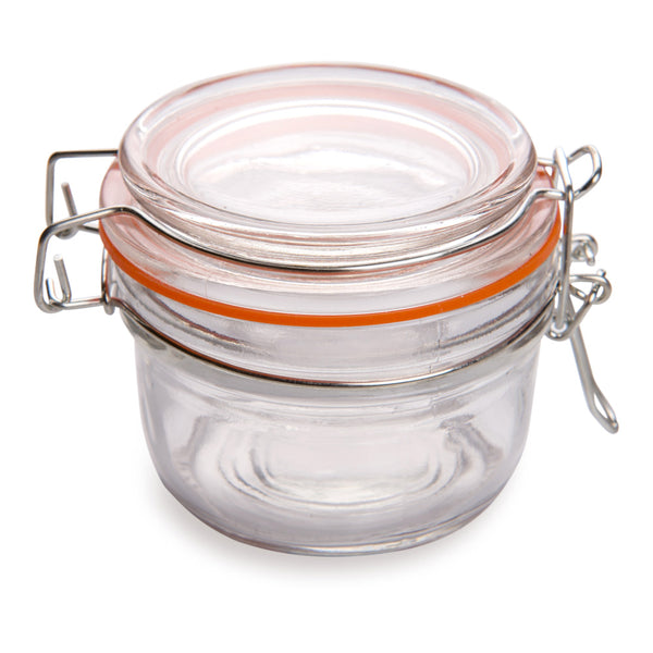 Store spices in an innovative way with our Vetri 5-ounce Nostalgic Clamp Lid Glass Mason Jars. Featuring a clamp seal lid, these airtight glass jars keep moisture out of your high-quality condiments and prevents accidental messes. Constructed from high-quality glass, these small glass containers are conveniently scratch-resistant and dishwasher-safe. Plus, they're great nature-friendly alternatives to styrofoam or plastic containers! Containing up to 5 ounces, use these glass jars with lids to charmingly offer chocolate chia seed pudding at your cafe, or to easily store garlic cloves at your restaurant. These 5-oz durable glass jars measure 3.3 inches long by 2.7 inches tall and ship in a 10 count box.
