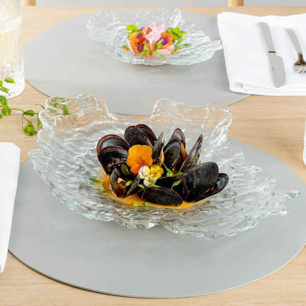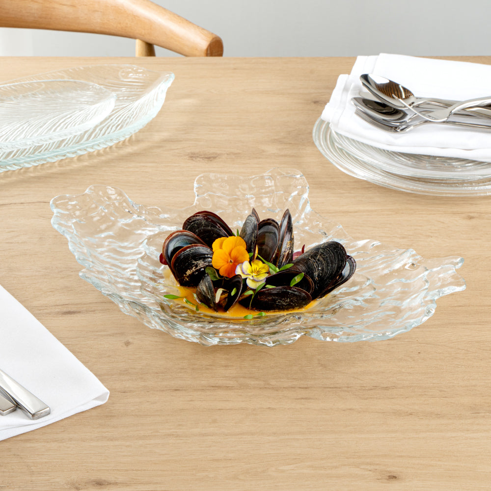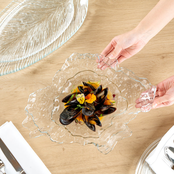 Add elegance to your tablescape with our Vetri Abstract Clear Glass Seashell Serving Plates. Designed from premium soda-lime glass, these seashell serving dishes are sturdy for holding hefty foods. These glass serving plates withstand temperatures up to 140F and are hot and cold-friendly, allowing you to use them for all kinds of food. Meticulously handmade with a seashell pattern, these vintage glass serving plates add a coastal accent to the ambiance. These pressed glass serving plates are dishwashable for a quick and simple cleanup process. Made from lead-free material, these antique glass plates are ideal for withstanding any undesirable substances. With raised edges, these serving glass plates secure the food from accidental runaways or spills. Measuring 15 inches in length by 11.25 inches in width by 2.75 inches in height, these antique glass serving dishes are perfect for displaying all kinds of fancy entrees. Shipped in a 6 count box.