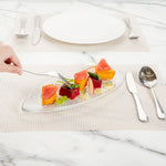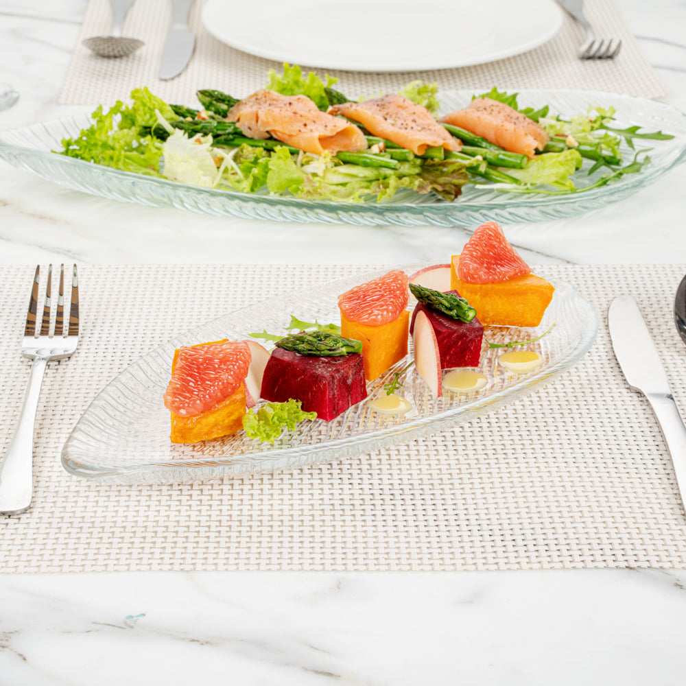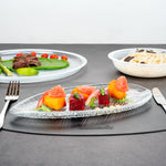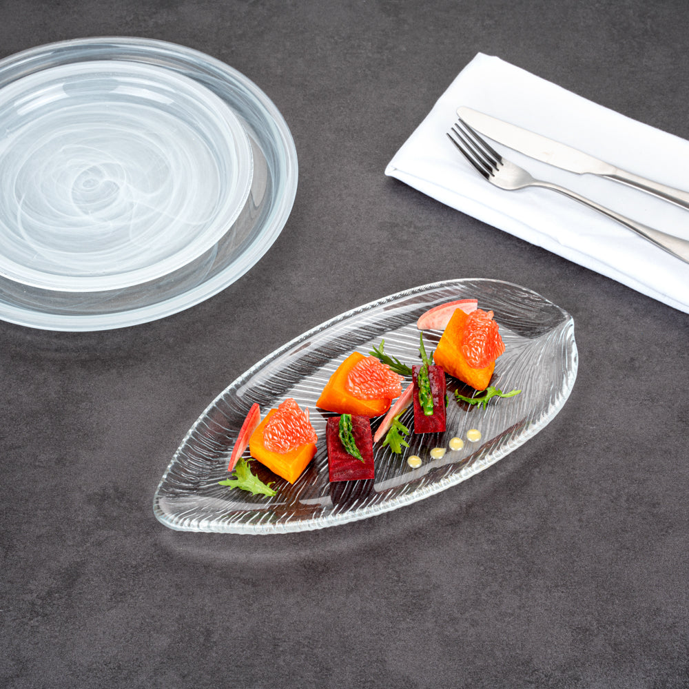 Add a cool touch to your buffet displays with our Vetri Clear Glass Leaf Serving Plates. These antique glass platters are made from lead-free soda-lime glass for durability and long-lasting performance while being lightweight. With a textured finish, these glass serving dishes elevate the presentation of any menu item. For added flair, the leaf design offers a distinctive look to these crystal serving dishes to further accentuate the display. With slightly raised edges, these decorative glass platters prevent food from spilling. These food-grade glass serving platters are hot and cold-friendly, allowing you to serve various foods. Withstanding temperatures up to 140F, these reusable serving glass plates are dishwasher-safe. Measuring 11.75 inches long by 5.5 inches wide, these clear glass plates elevate the plating experience in your food establishment. Shipped in a 6 count box.