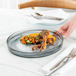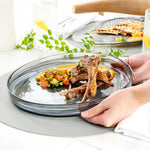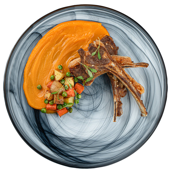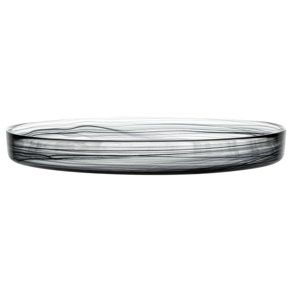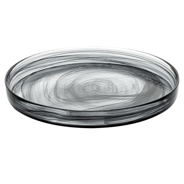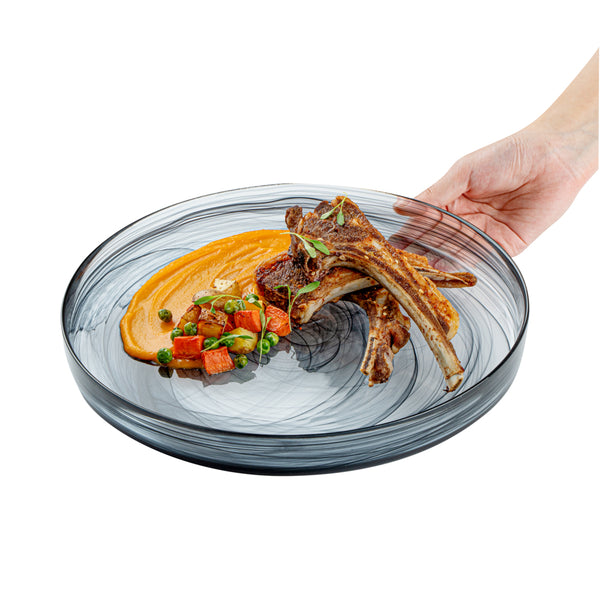 Beautifully present food on your dining table with our Vetri Round Black Glass Alabaster Plate. Manufactured with lead-free soda glass, this serving glass plate is durable and withstands rigorous use. With its opulent swirls of black color, this crystal serving dish is a sure head-turner for events. The smooth edges of this handmade decorative glass platter are slightly raised to prevent food from spilling out onto the table. Tolerating temperatures up to 140F, this antique glass serving dish is ideal for serving hot or cold meals. This reusable antique glass platter is dishwashable, making your post-meal cleaning hassle-free. Measuring 11 inches in diameter by 1.25 inches in height, these glass serving plates add an elegant look to your restaurant, banquet, or cafe table setting. Shipped in a 1 count box.