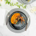 - Sleek black alabaster finish enhances table settings with a sophisticated and modern touch