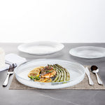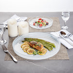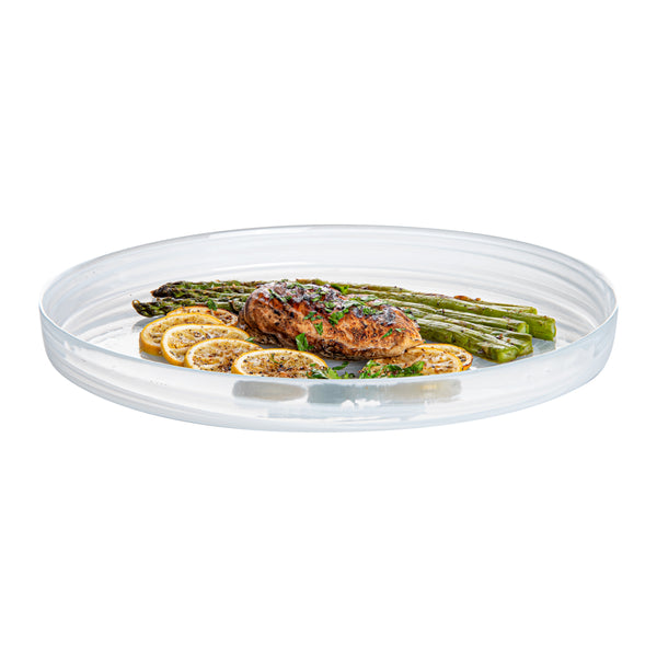 Make your guests go in awe with your food presentations by using our Vetri Round White Glass Alabaster Plate. With a durable soda-lime glass construction, this round glass plate is made for rigorous use at your establishment. Suitable for serving both hot and cold foods, this glass serving plate withstands temperatures up to 140F, making it ideal for presenting cold salads and hot brownies alike. This antique glass plate is made from lead-free glass and does not spread unwanted substances into food. This clear serving plate is dishwasher-safe for simple cleaning. With its ink swirls, this white alabaster dinnerware will turn heads at your next event. Measuring 12.99 inches in diameter by 1.37 inches in height, this serving glass plate is perfect for serving pancakes, sandwiches, and lasagna to show off their layers easily. Shipped in a 1 count box.