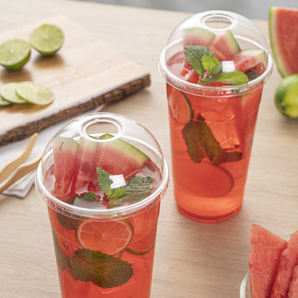 Ensure spill-free transport with a secure plastic dome lid. The Visage Spill-Reducing Plastic Dome Lid features a tight-fitting design that effectively reduces spills during transport, making it ideal for slushies, fruit smoothies, and milkshakes. With its convenient hole, this plastic smoothie lid accommodates both straws and spoons with ease, enhancing the convenience of on-the-go beverages. Its crystal-clear construction ensures fast product identification, allowing baristas and servers to quickly locate and serve drinks, streamlining your beverage service. With dimensions of 4.25 inches in length and width, these lids fit snugly on 32 oz cups, maintaining the integrity of your cold beverages. Elevate your drink presentation and functionality with this reliable solution for your foodservice needs. Each order includes 500 Visage Spill-Reducing Plastic Dome Lids.